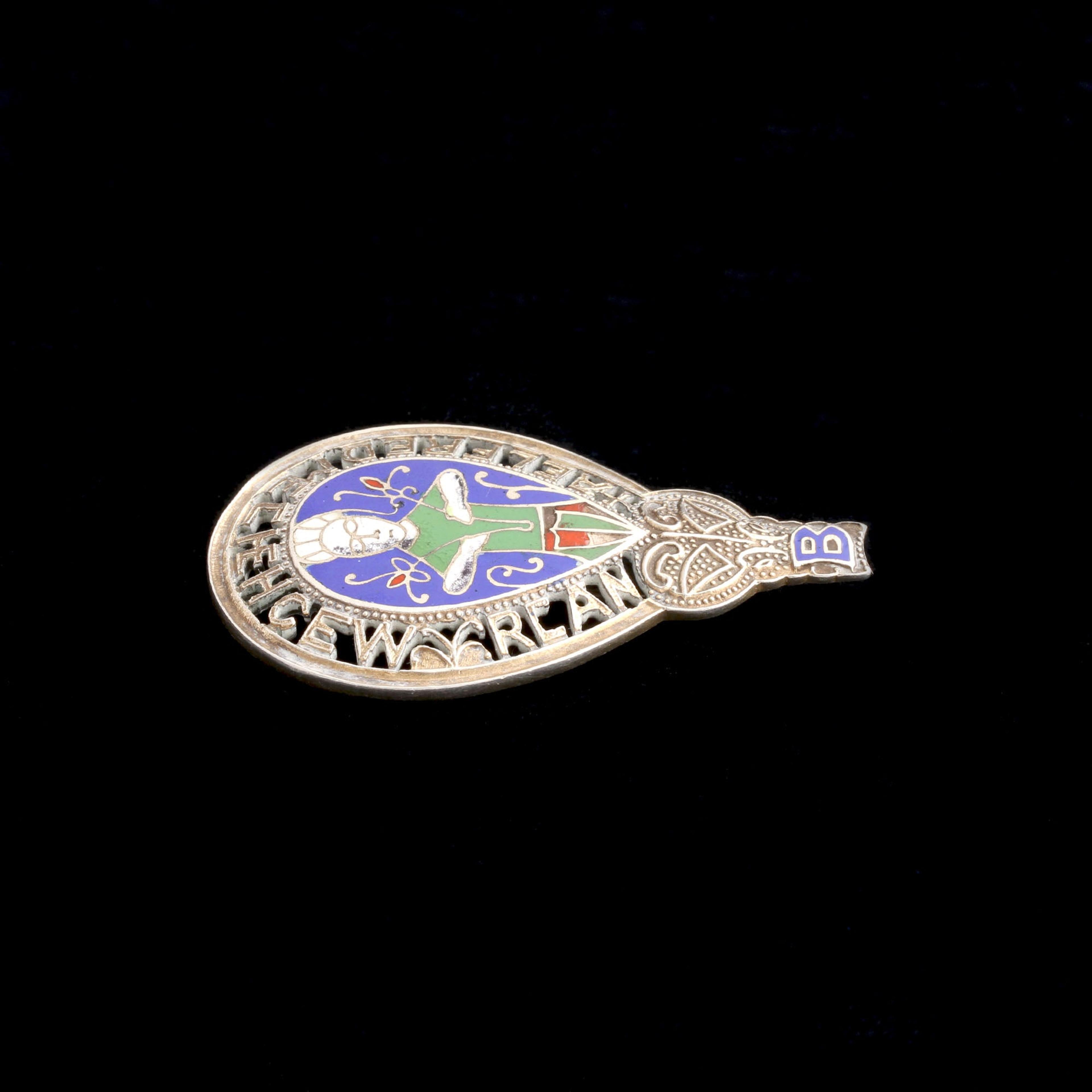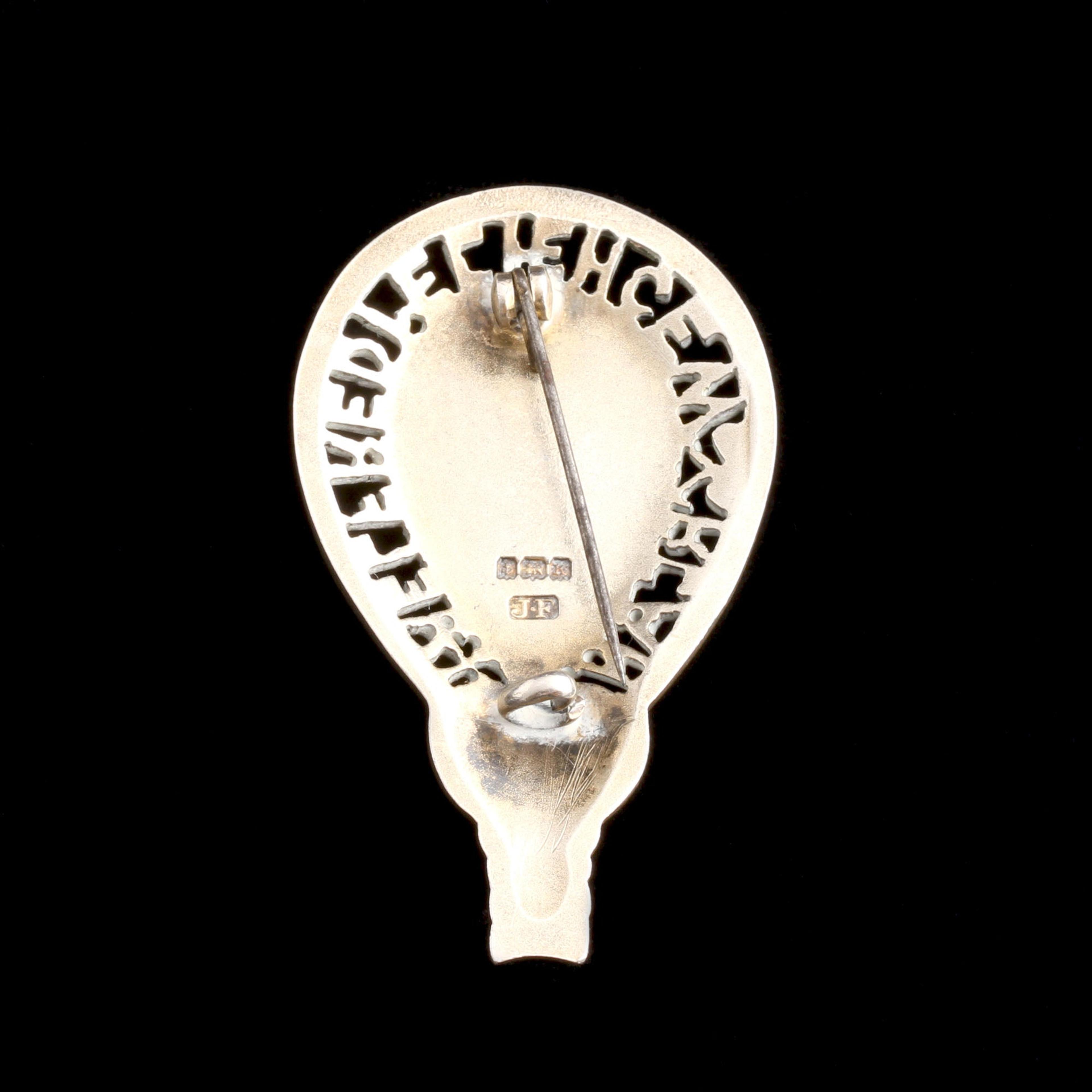 This is a silver replica of the famous "Alfred Jewel" currently in the Ashmolean Museum. The inscription is 'Aelfred mec heht gewyrcan' which means 'Alfred ordered me to be made'. The original aestel (made of gold) dates to the late 9th century, but several similar ones have been found; the Anglo-Saxon king sent them to important church members throughout his land. What's an "aestel", you ask? It's a handle for a pointer which you'd use to follow the words on a page. Apparently there are Victorian era souvenir copies kicking around but this one is from the 1930s which is unusual.