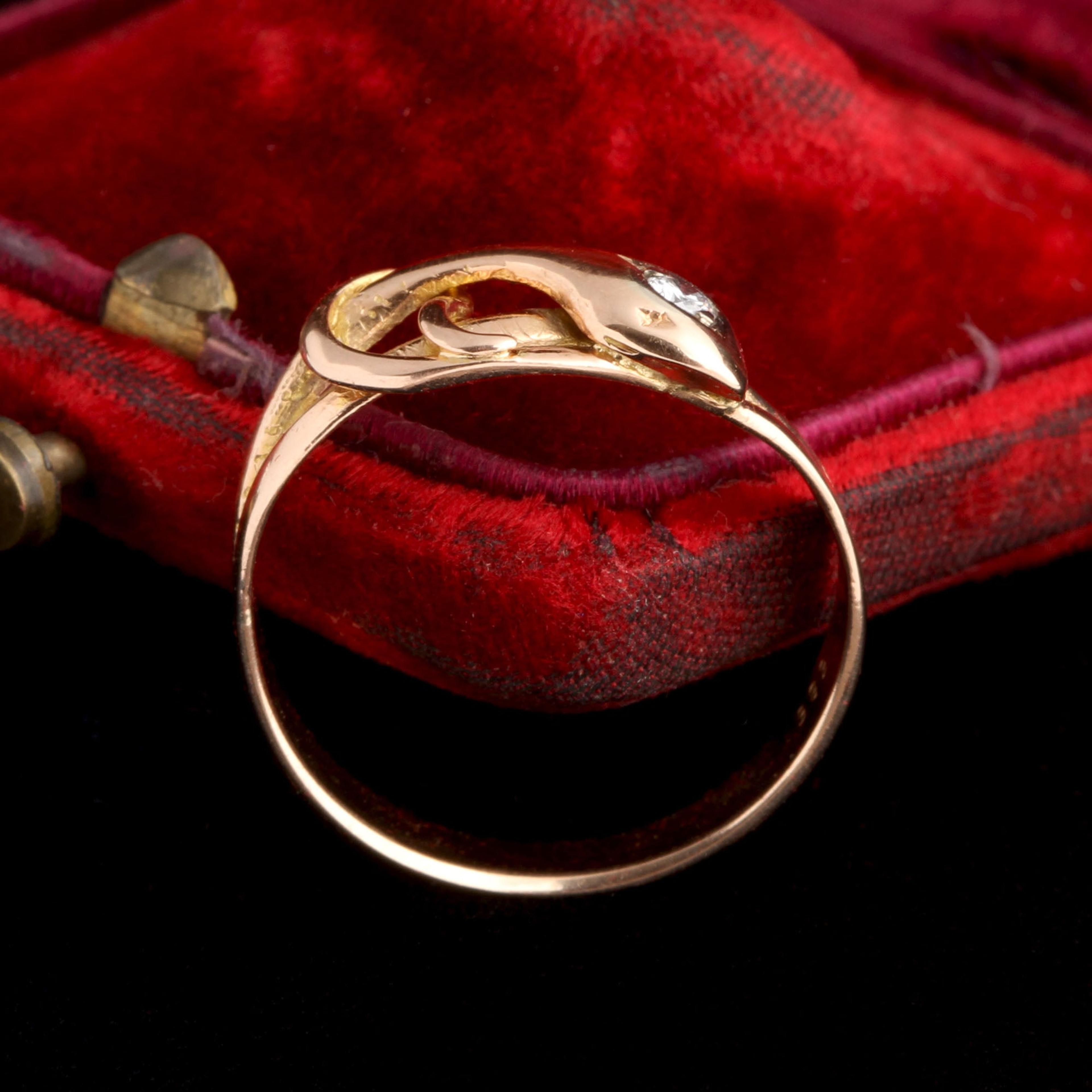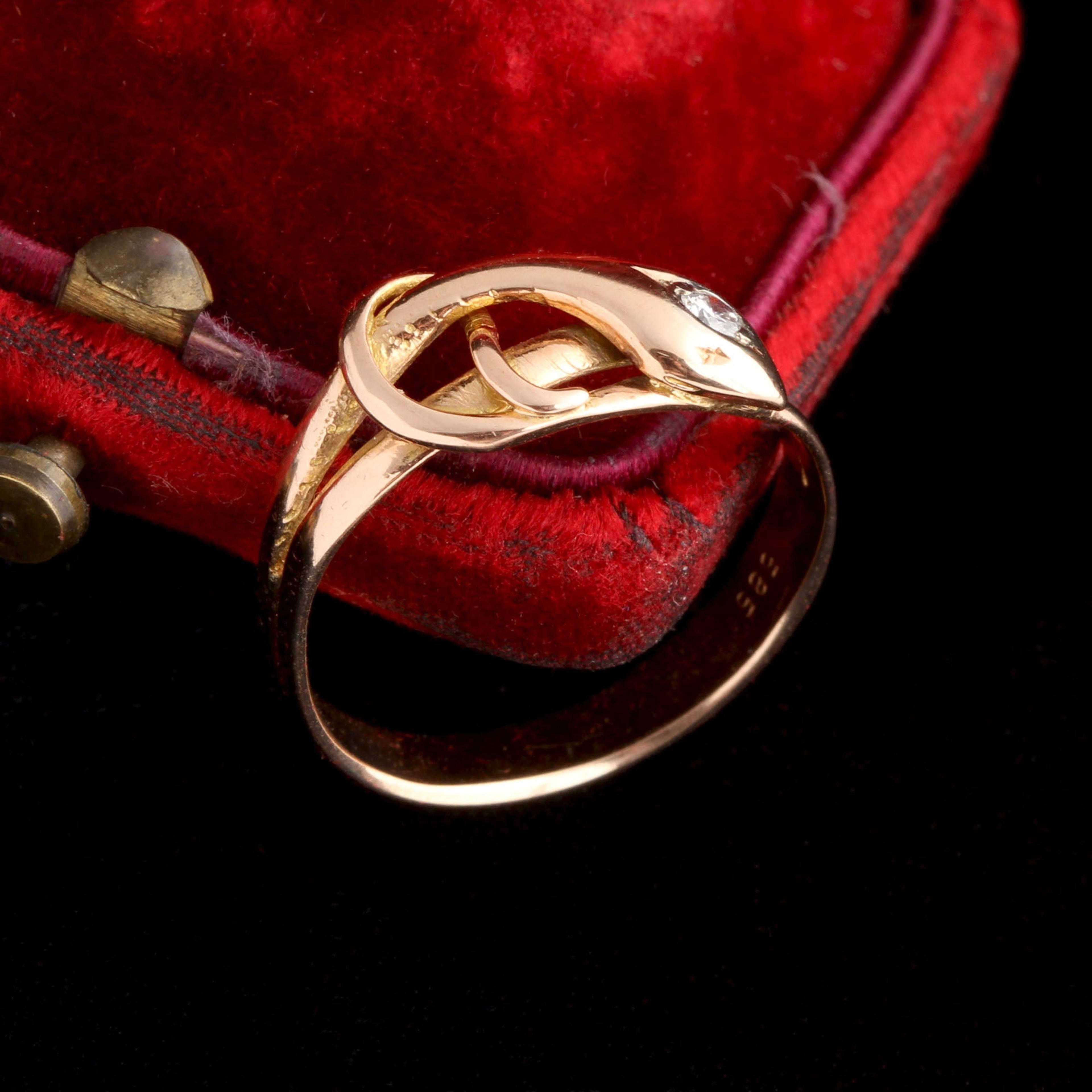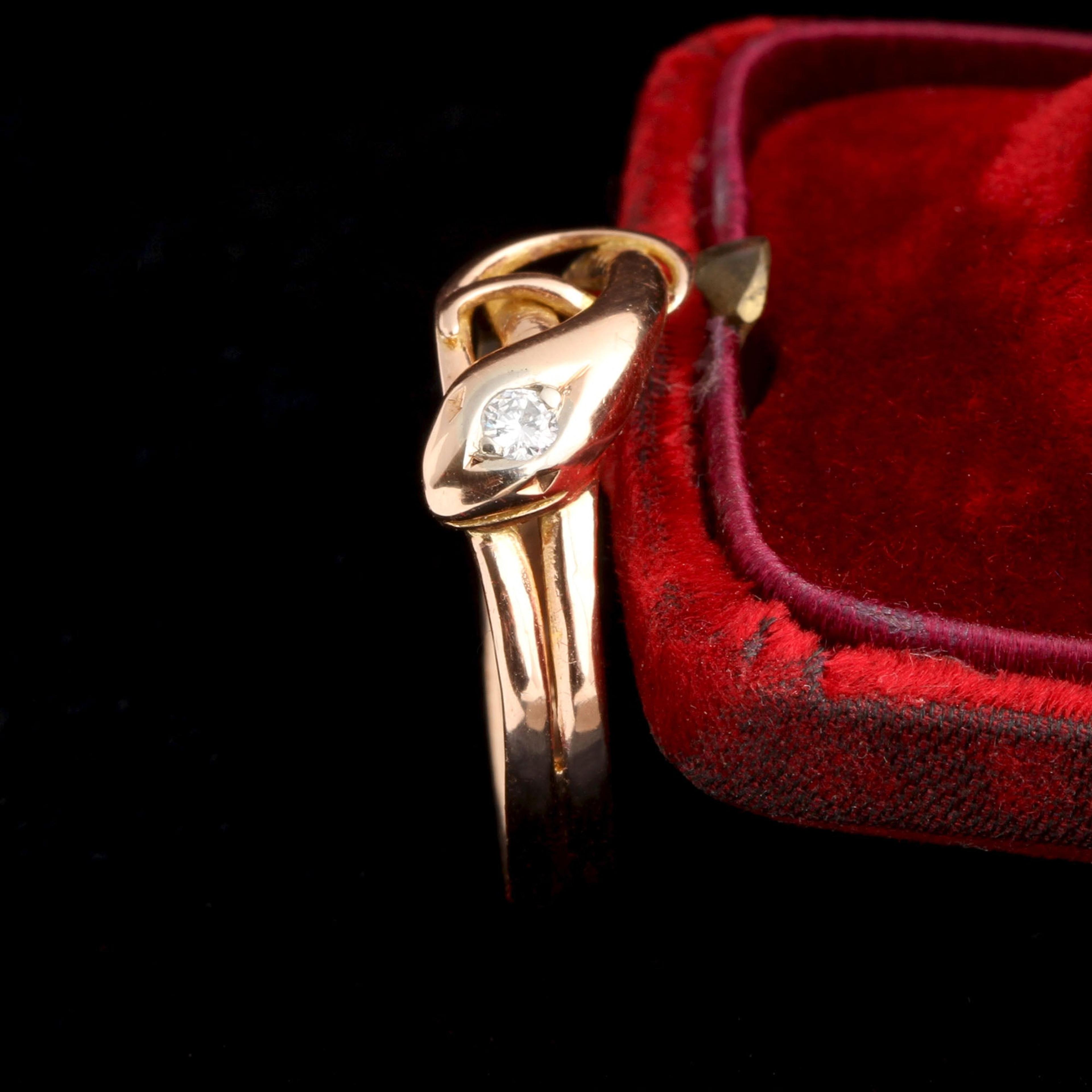 Snake jewelry came into serious vogue in the early Victorian period and one could argue that serpent-themed baubles have never really gone out of style since. Aside from being a fashion statement (which it was in the 19th century and remains to this day), the coiled serpent is also employed as a symbol of the cycle of life, eternity, and love without end. This 1930s coiled snake with is rendered in 14k gold. The serpent's tail loops elegantly around its neck and the head sparkles with a .05ct brilliant cut diamond.