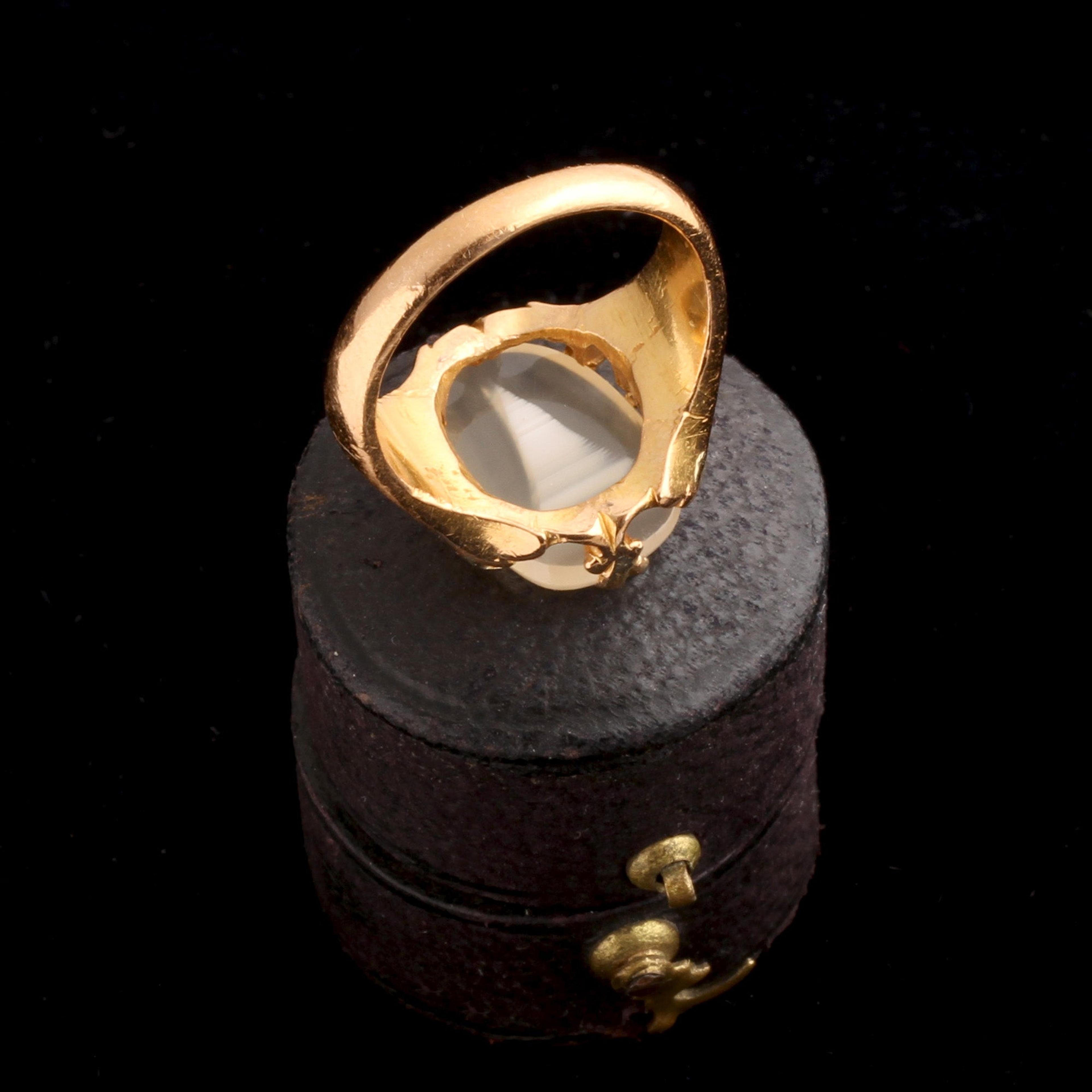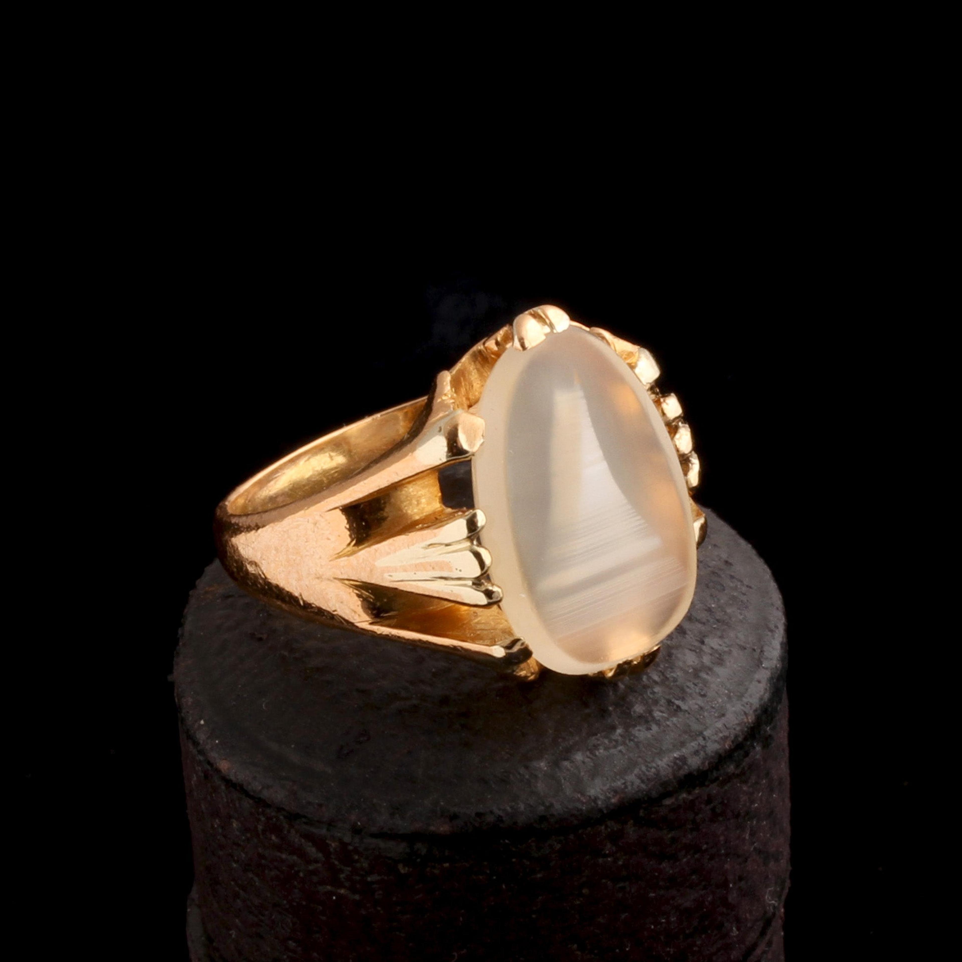 A vintage signet-style ring with bold, statement prongs which hold a fascinating agate that appears to have formed the shape of a pyramid. Or an obelisk? Or perhaps a sail boat?