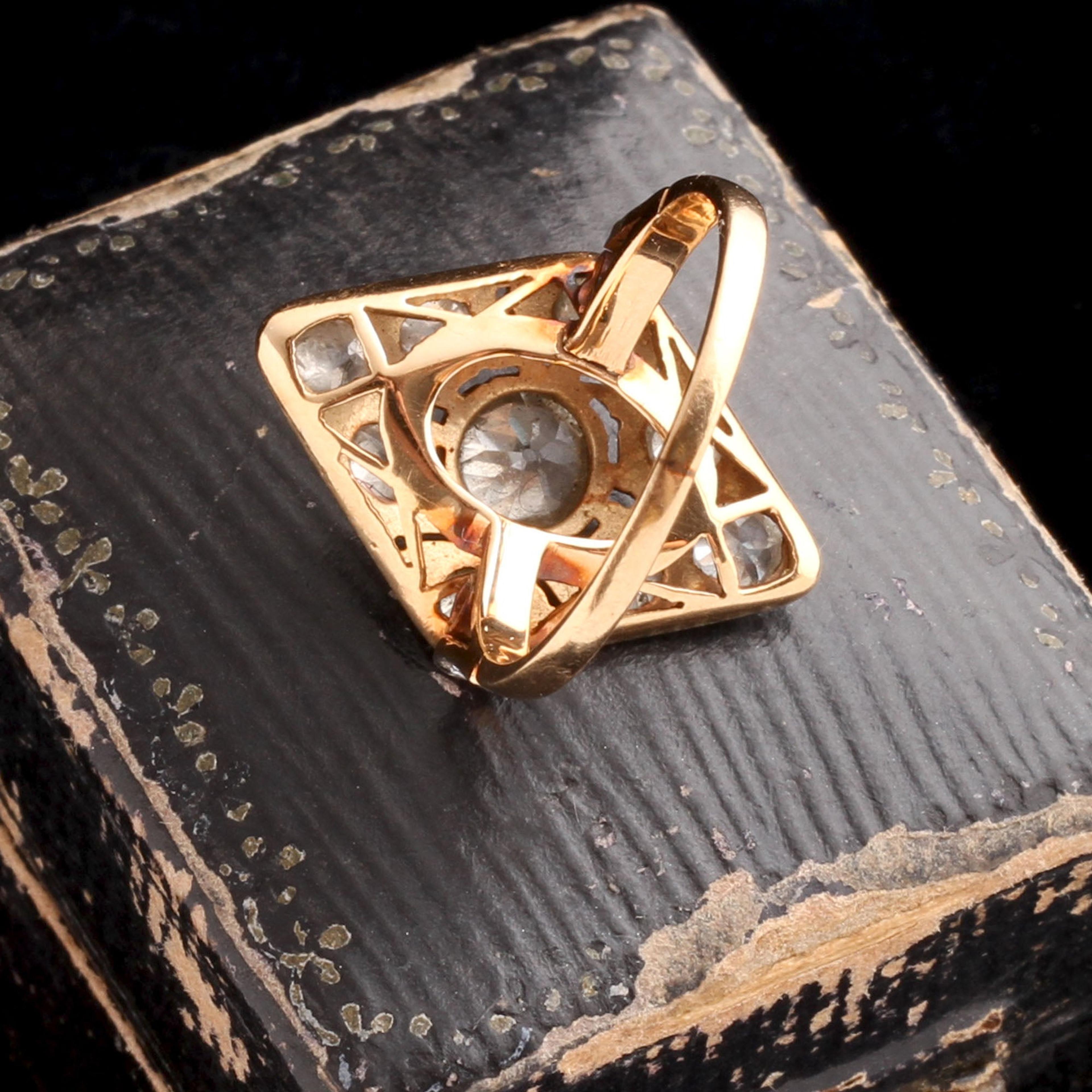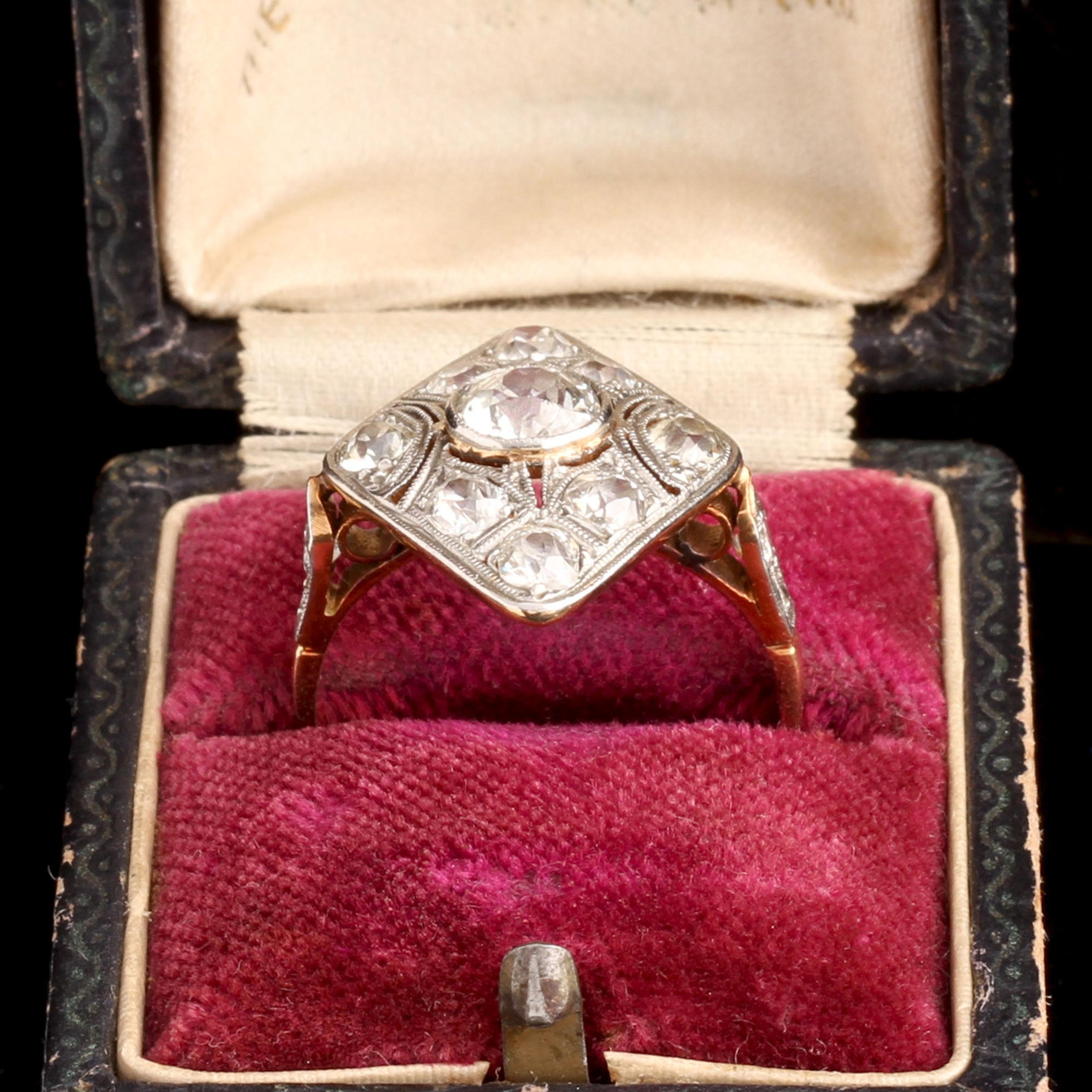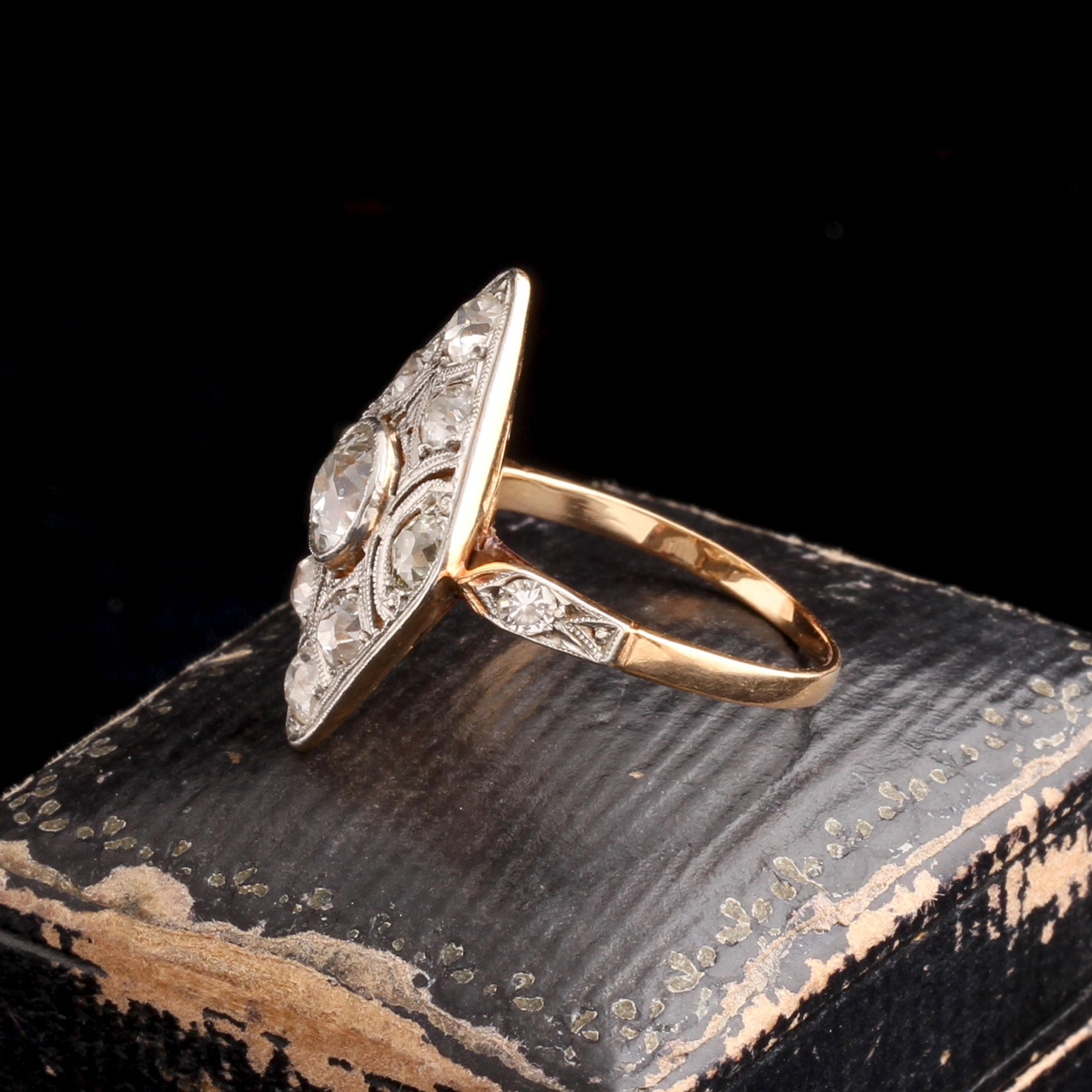 14k gold (tests), platinum, 1.9ctw old European cut diamonds (.70ct center stone, 8 side stones all approximately. 15ct)