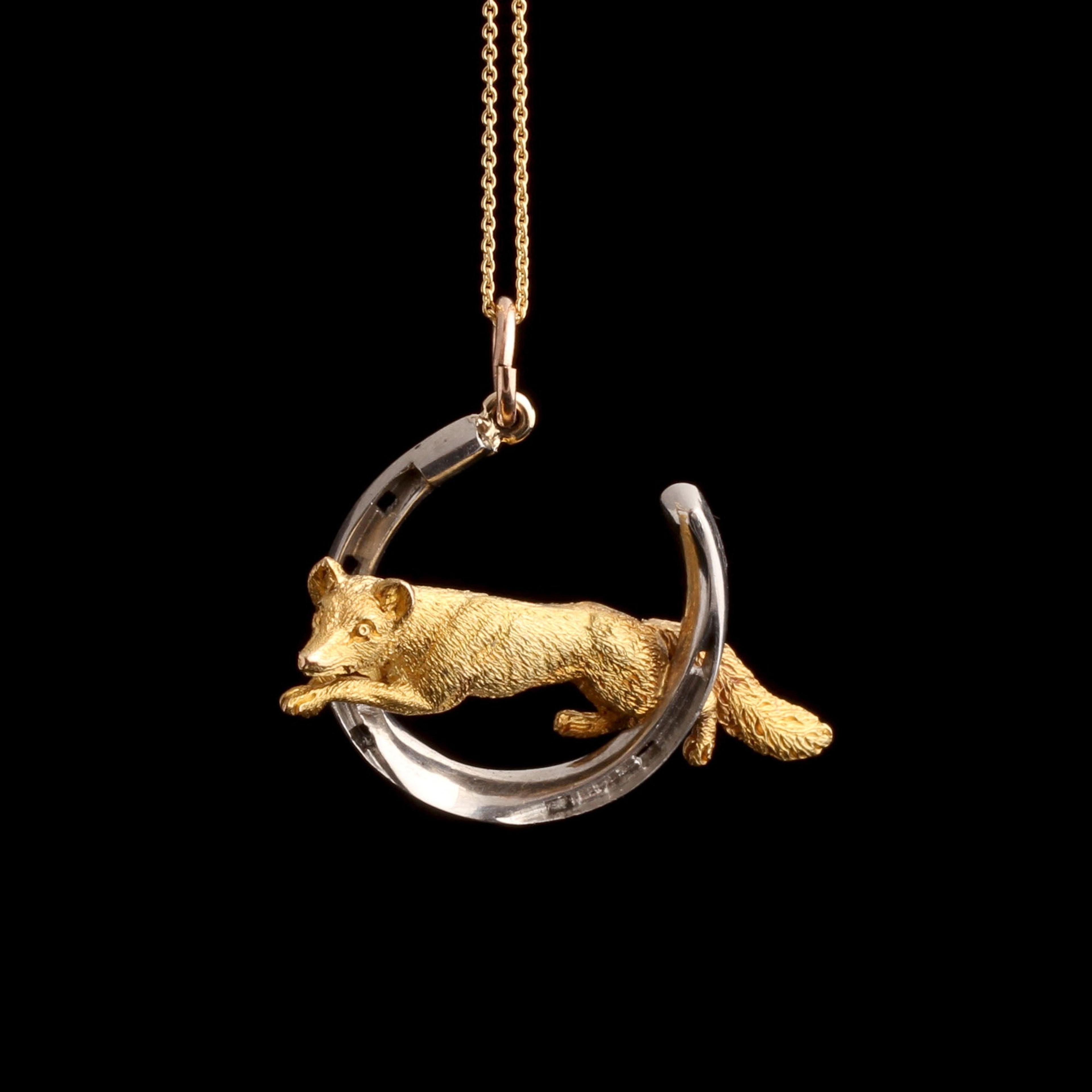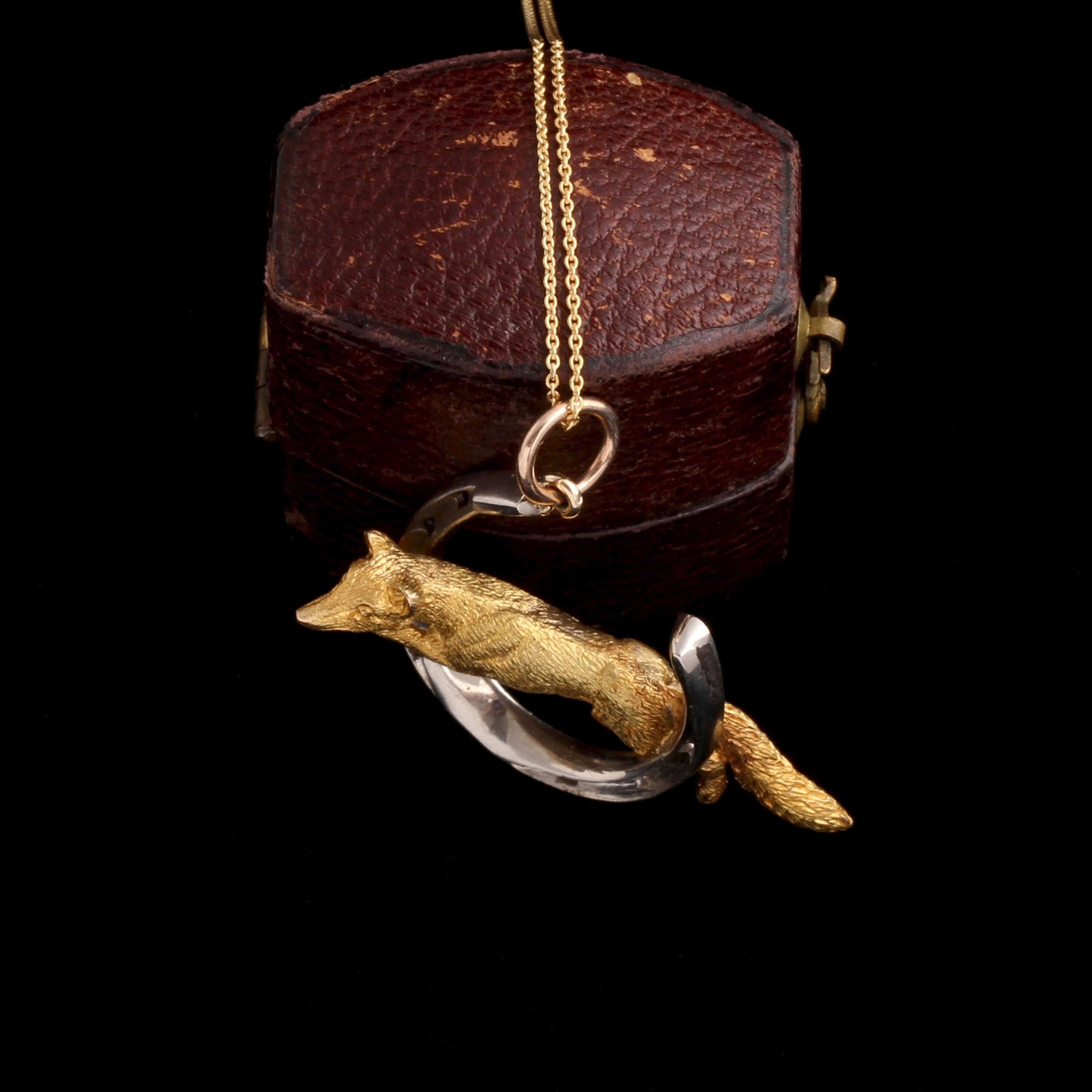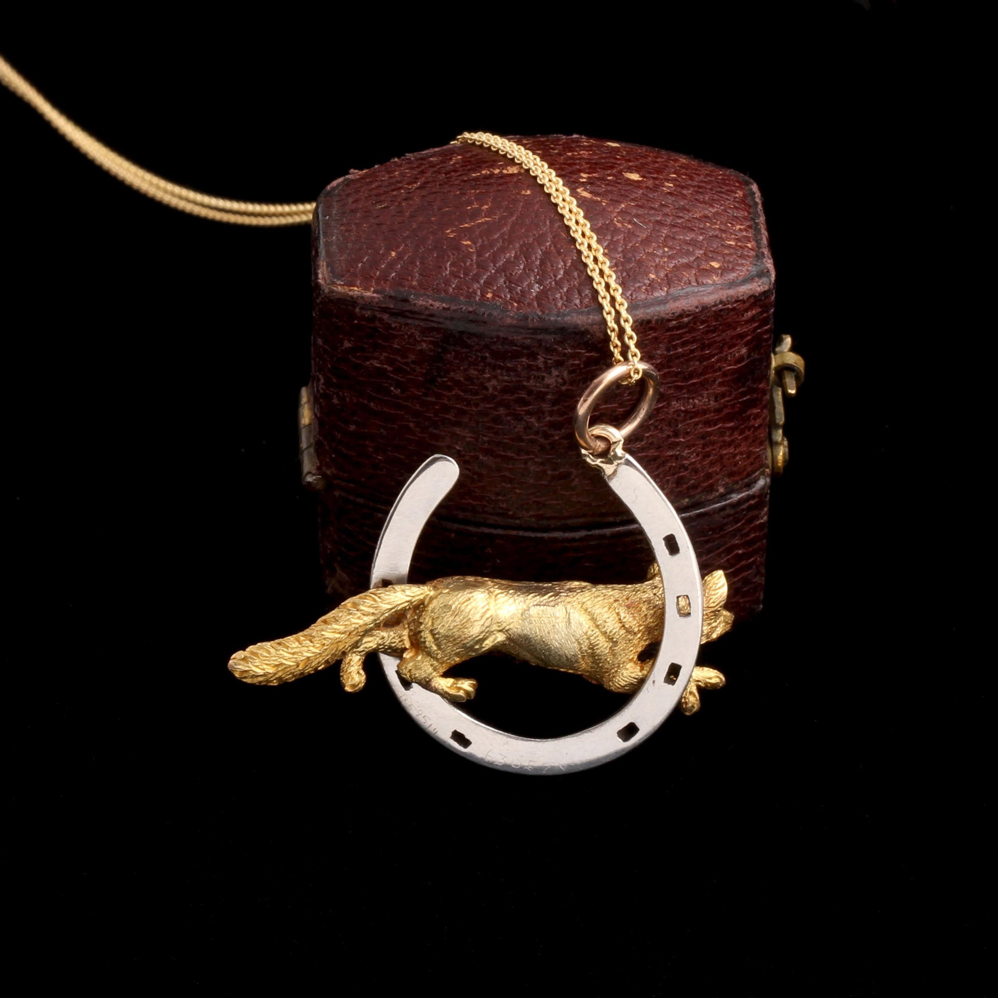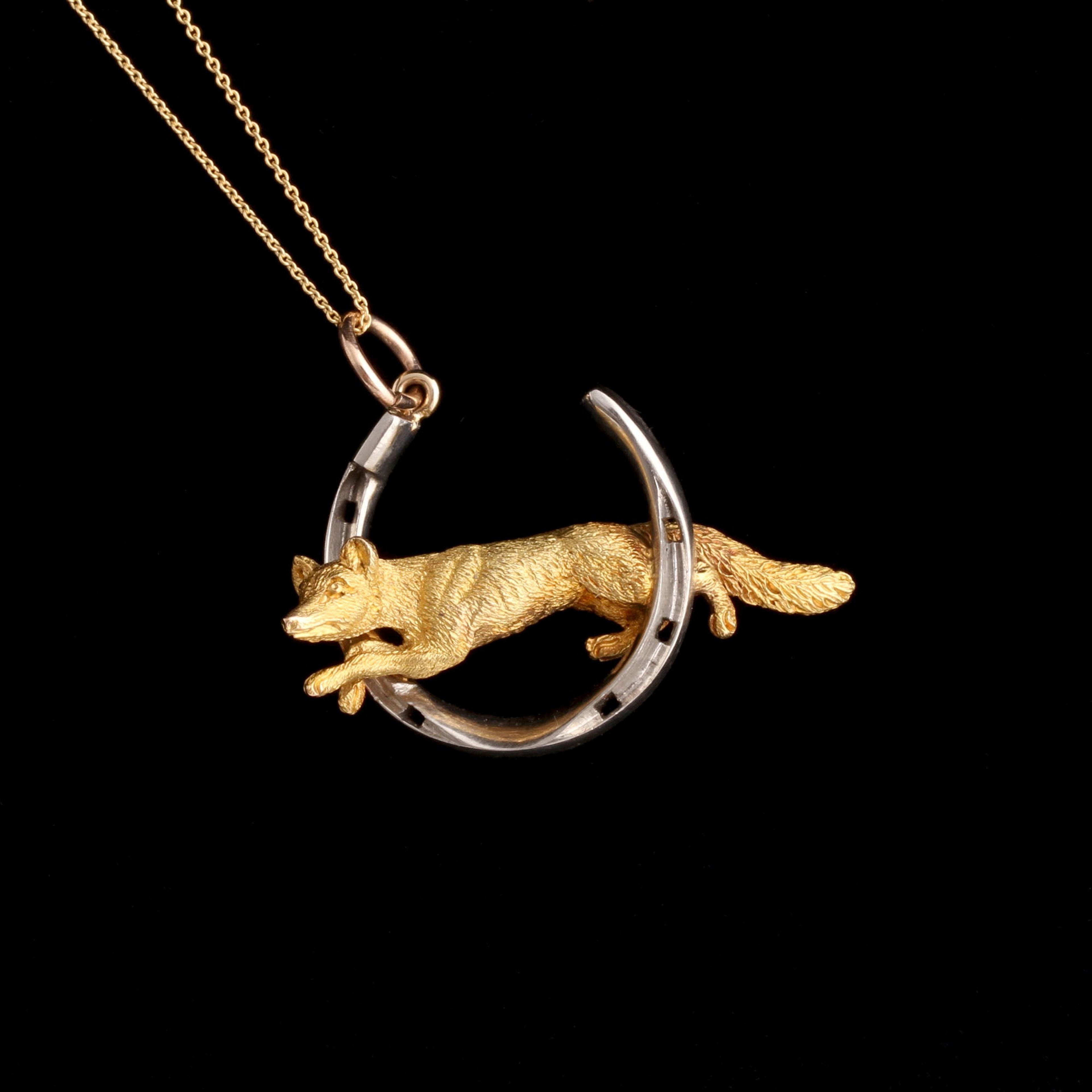 A beautifully rendered fox winding its way through a horseshoe dating to the early Art Deco period. Ultra fine craftsmanship matched with ultra fine materials - 18k yellow gold and platinum. On a new 14k gold chain.