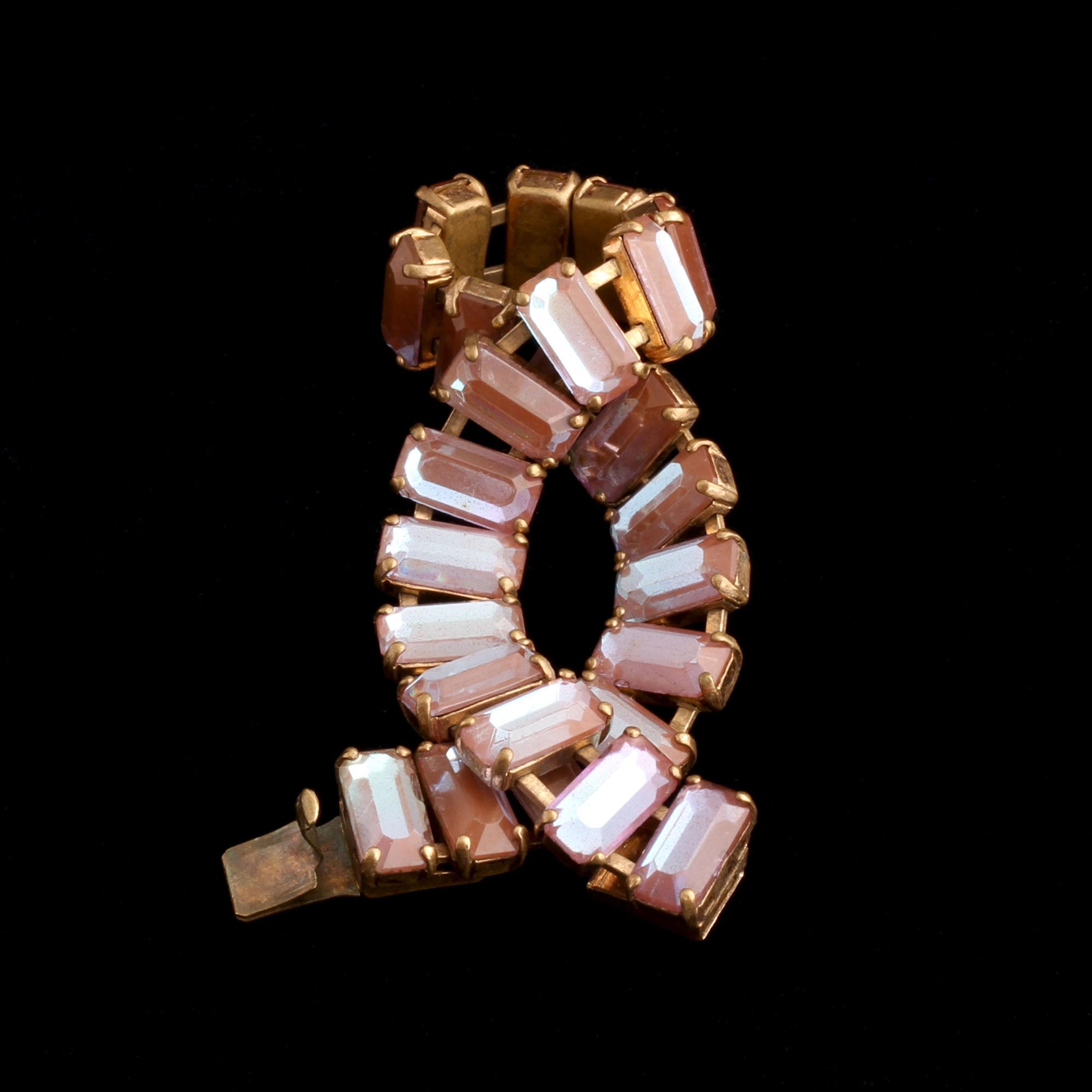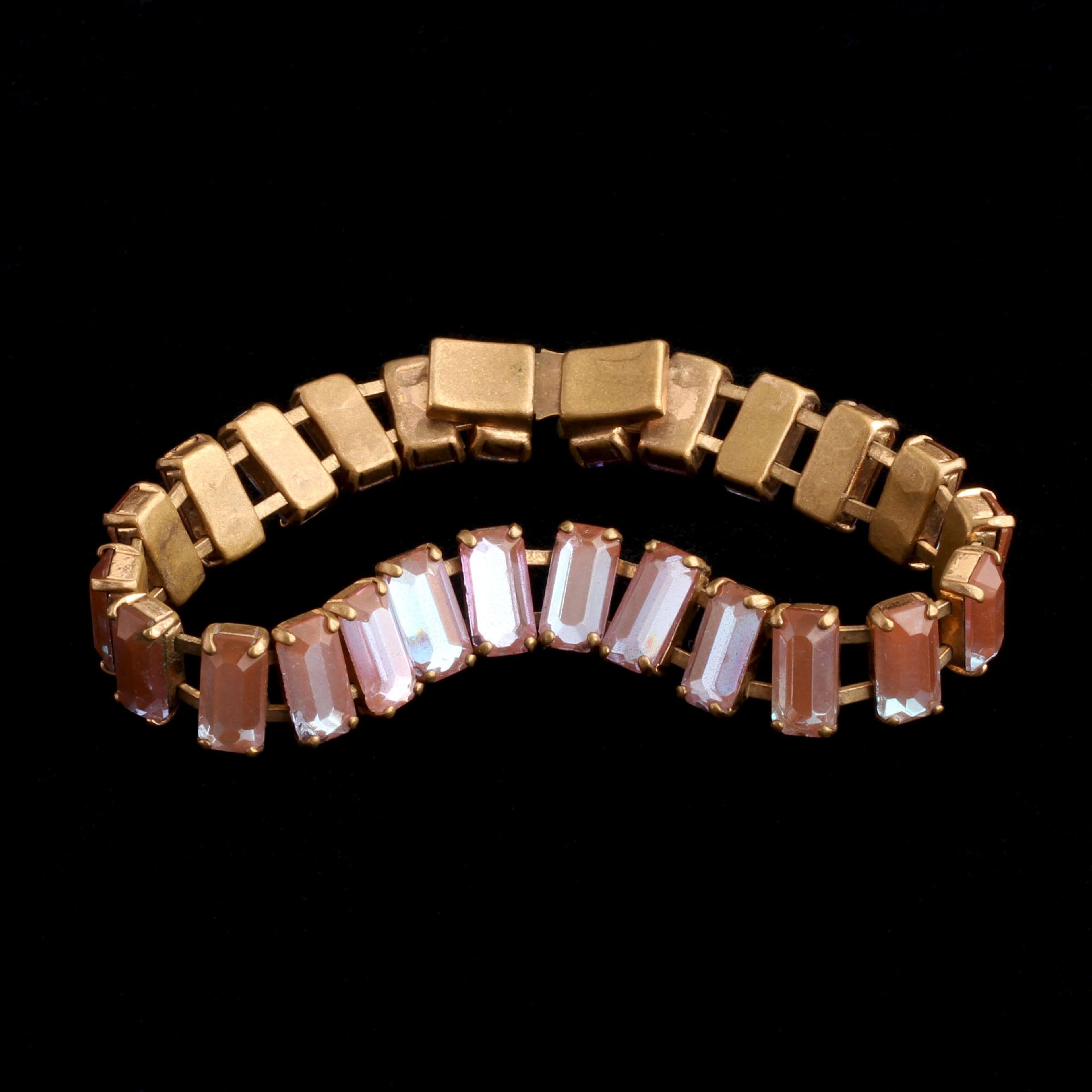 Saphiret is an early glass used in jewelry which was made by adding real gold to sapphire-colored molten glass. The base color ranges from a mocha or pinkish brown to a brick red color, when light strikes the stone the glass reflects the light as a soft blue glow similar to a labradorite's schiller. This 1930s bracelet features emerald cut saphirets mounted in base metal.