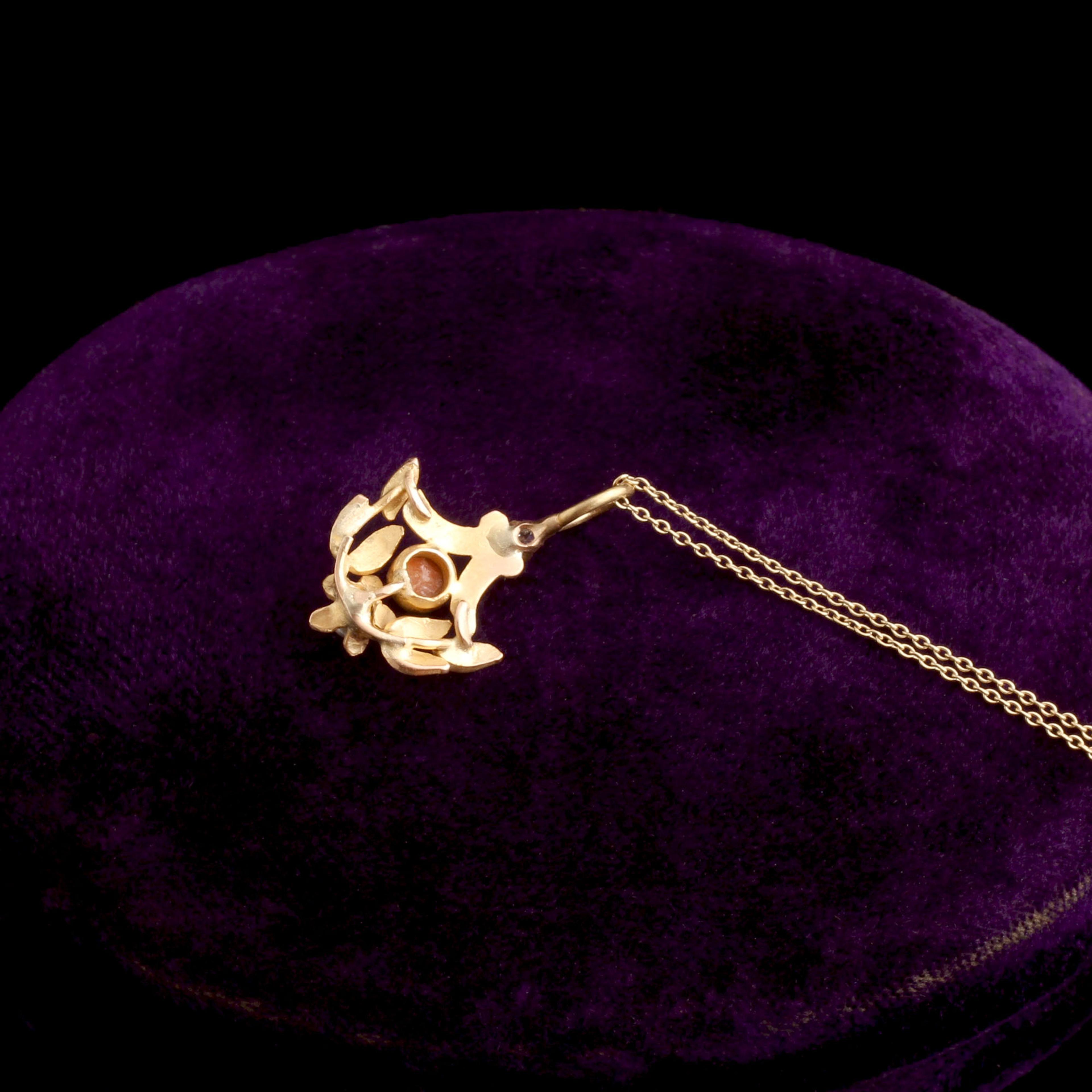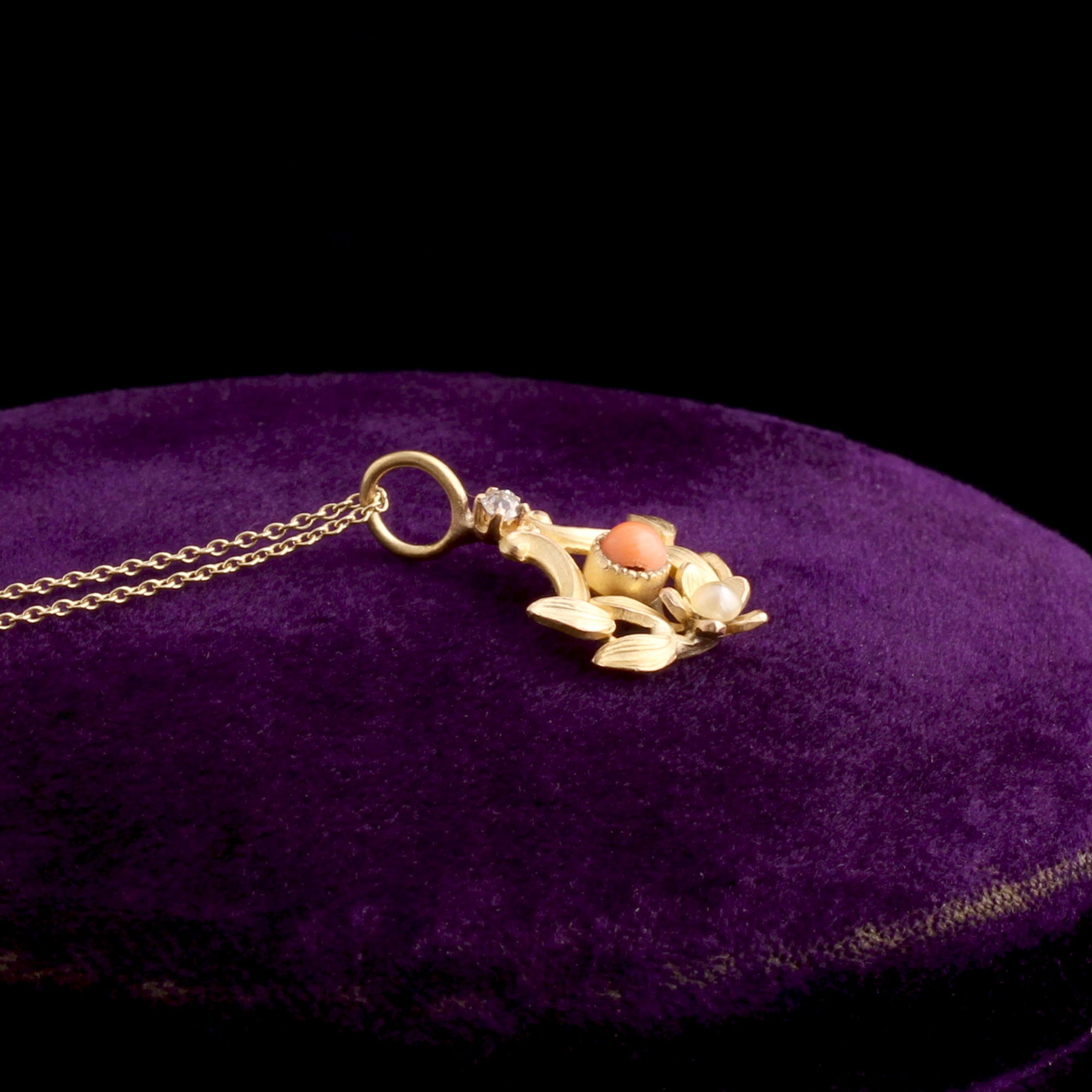 The Victorians and Edwardians loved a little bling at the neck. Stickpins could show what hobbies you were into AND served to secure your cravat/tie/ascot. In the 21st century, the complex neckwear is obsolete and most men (sadly) don't accessorize with jeweled animals. But these little sculptures were designed to be noticed, and many are complex works of craft. They've been reborn as pendants. This one is a classic Art Nouveau organic shape studded with a coral, diamond, and pearl.