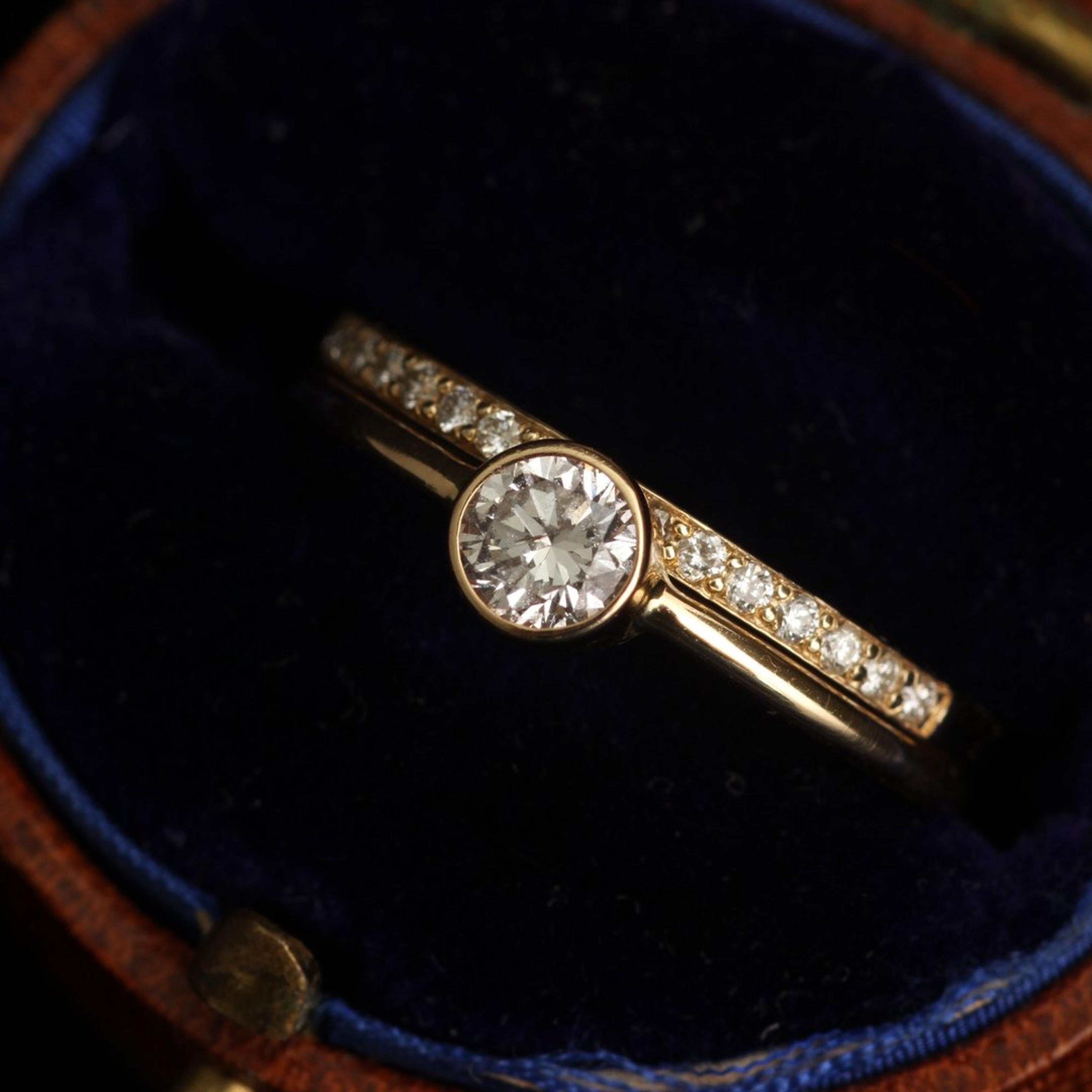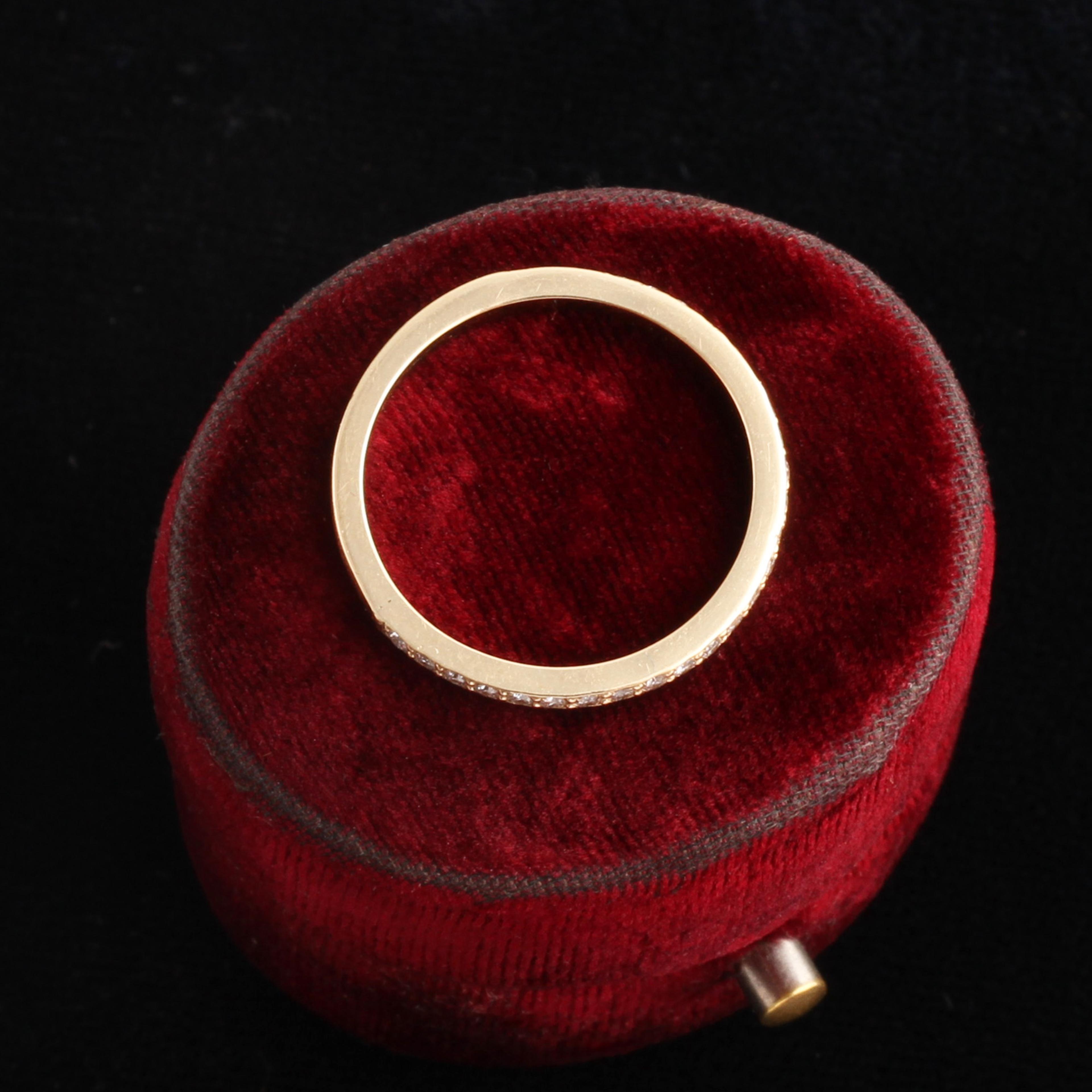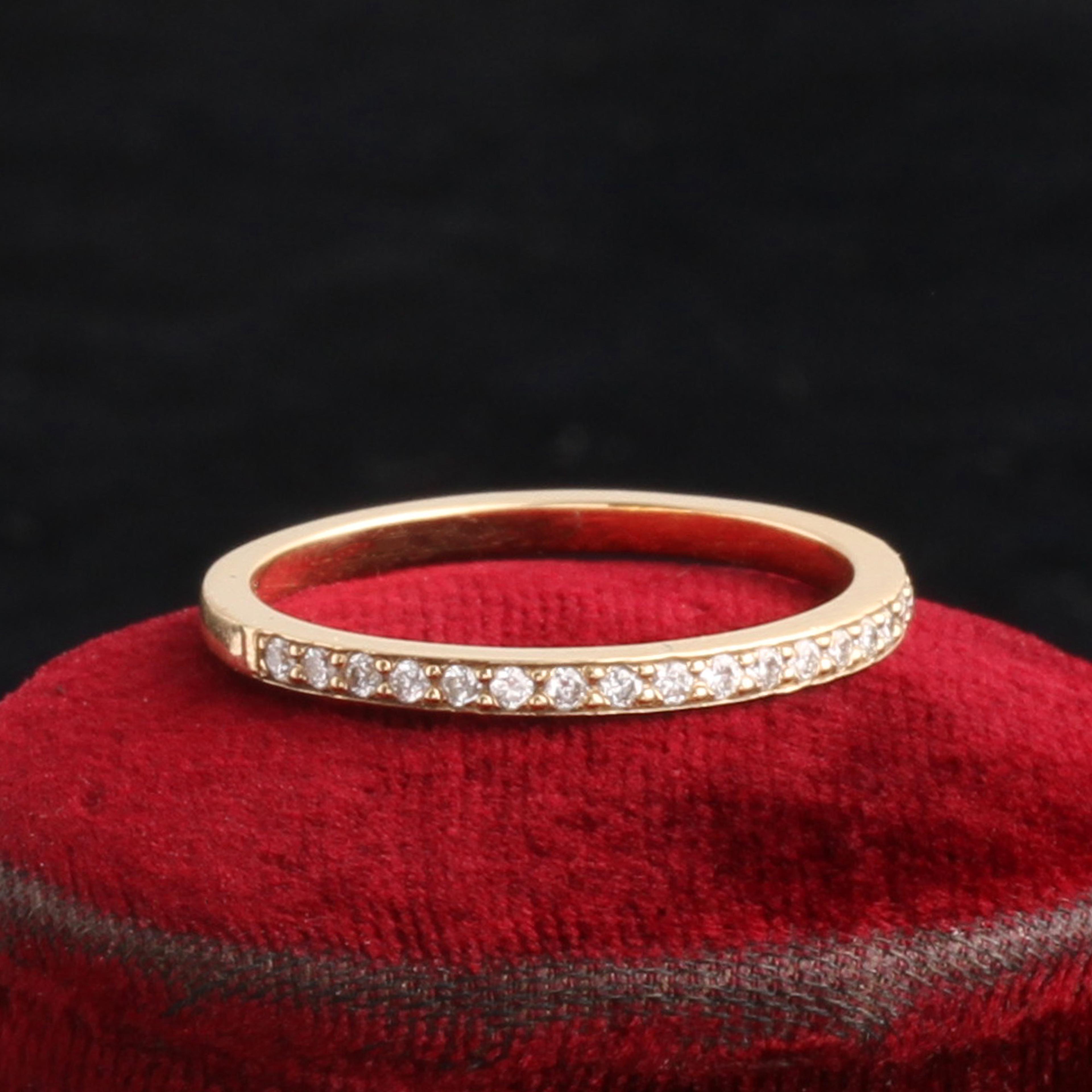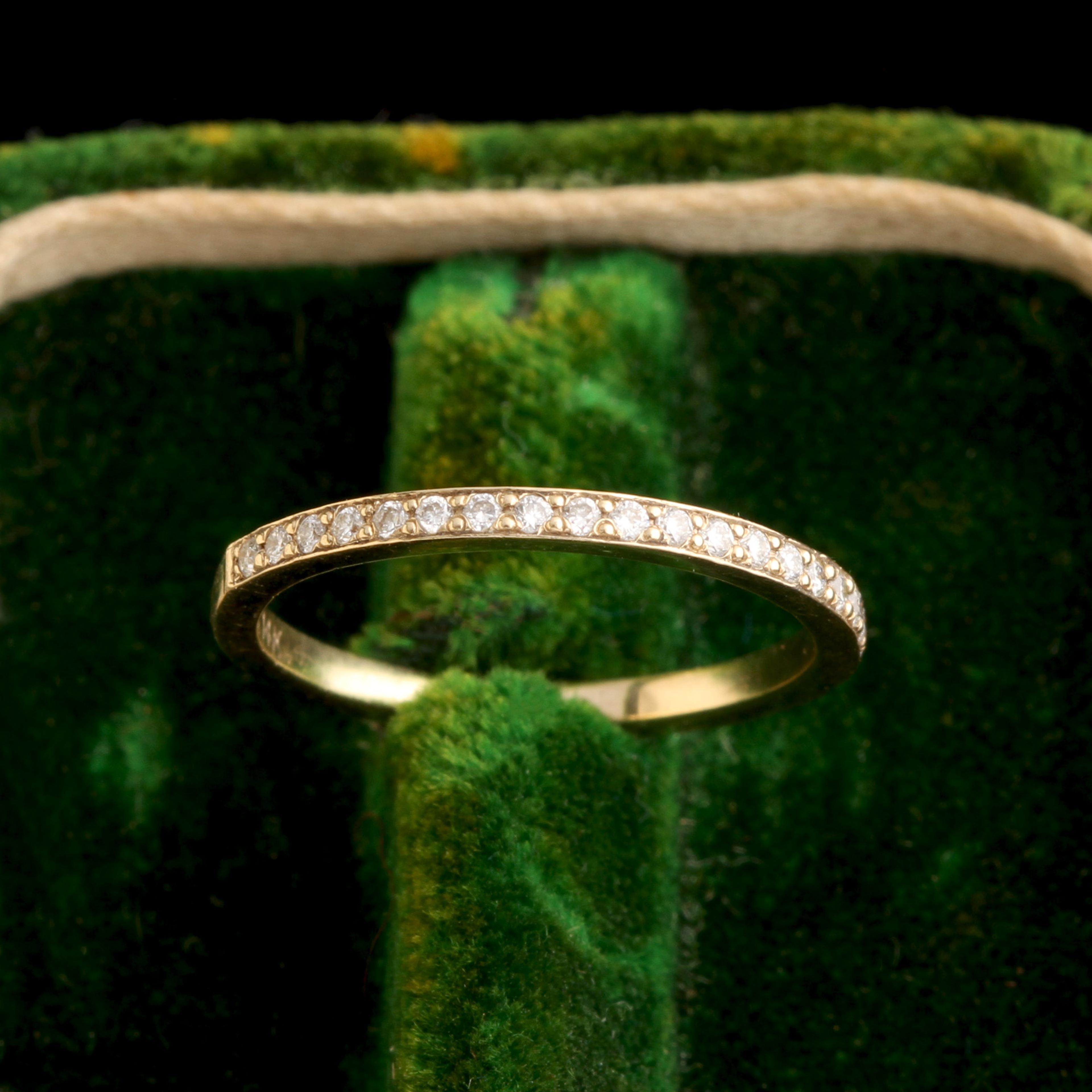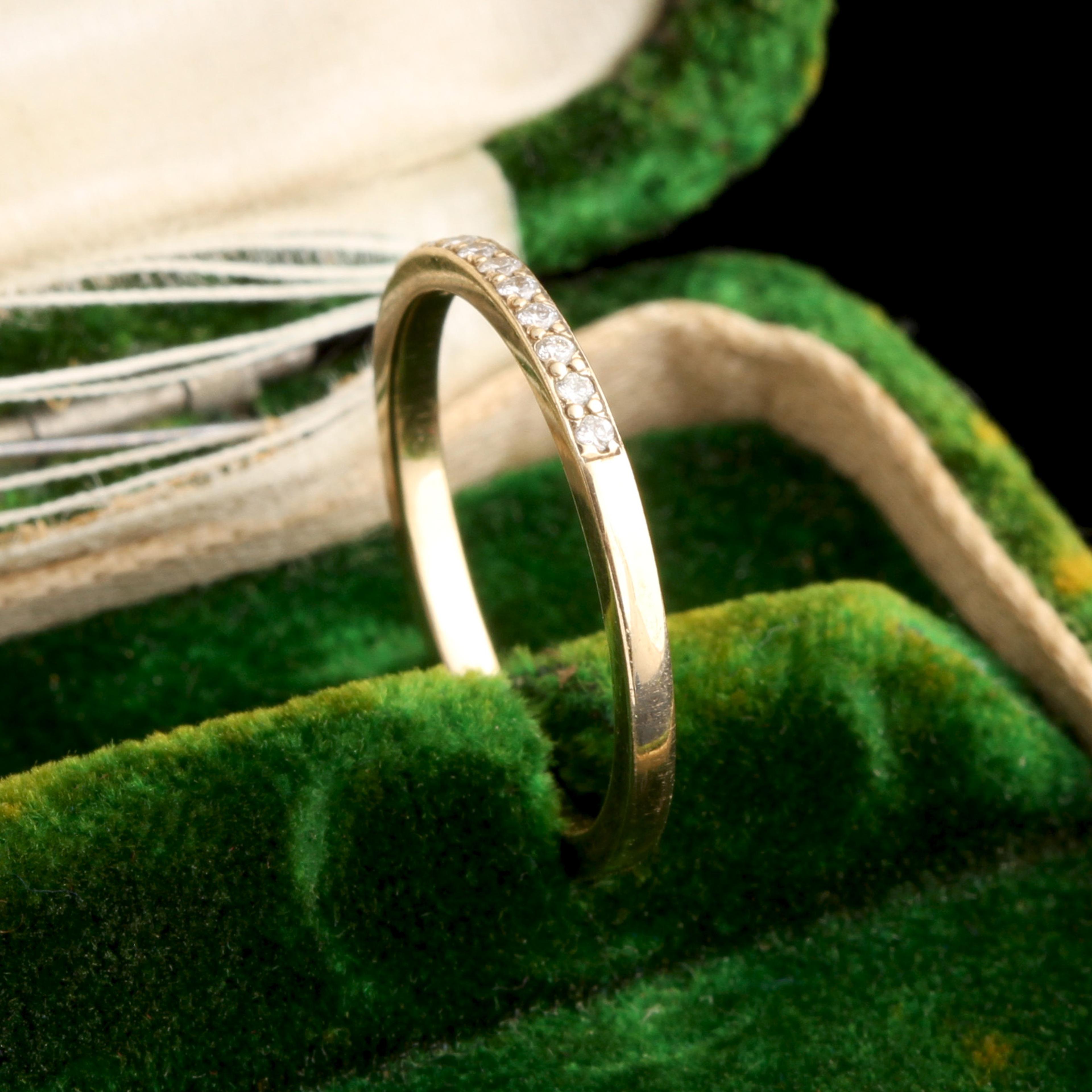 After much experimentation, we've developed a half-eternity diamond band that is perfect in almost every way: slim but not too delicate, sparkly but not too over-the-top blingy. These settings will never catch or snag on your clothing, and the stones will stand up to everyday wear beautifully. It has been designed as a wedding band, but we've had people give it to their spouse as an anniversary band, too. Staying married for any amount of time is worth celebrating with a stackable diamond ring, don't you think? Size 5.