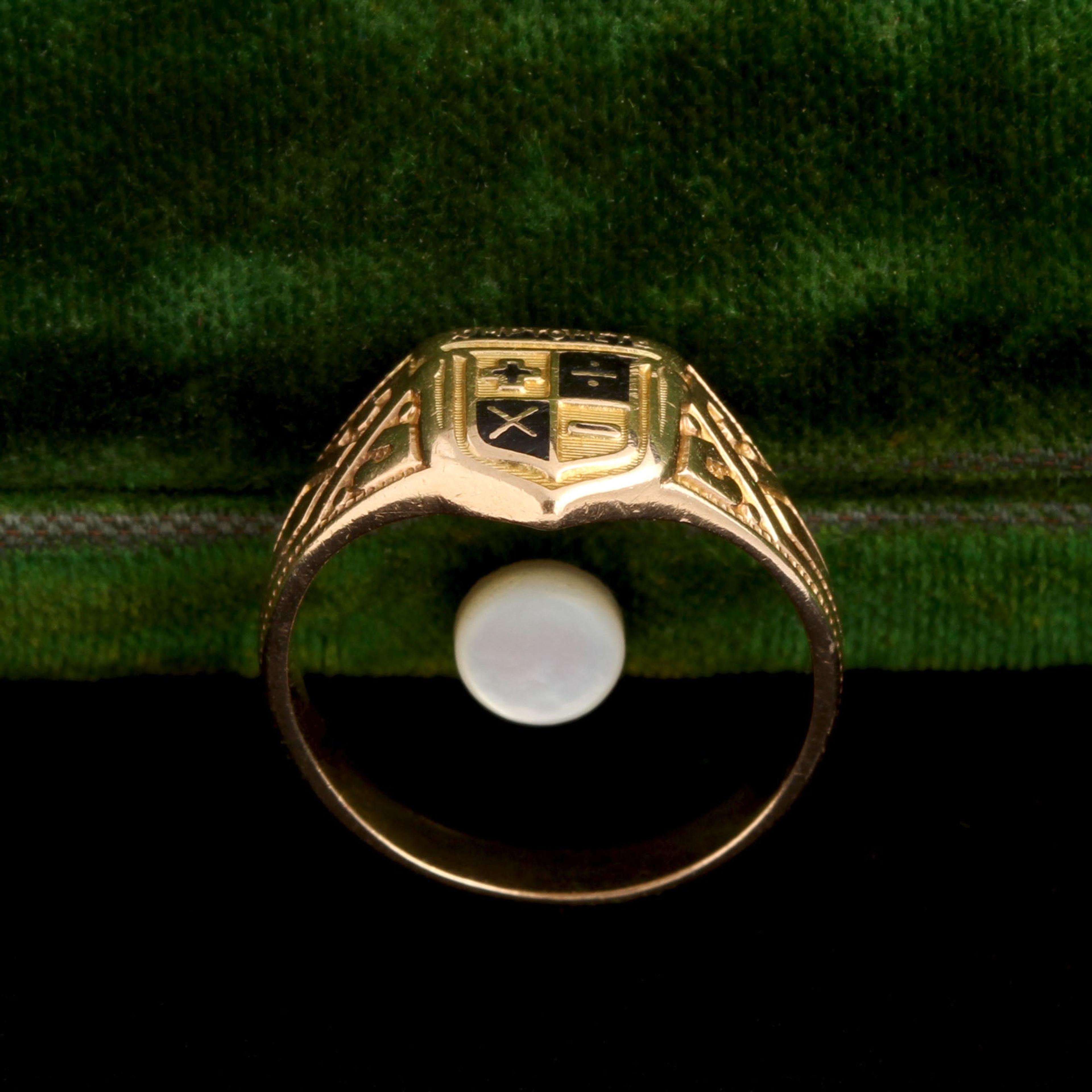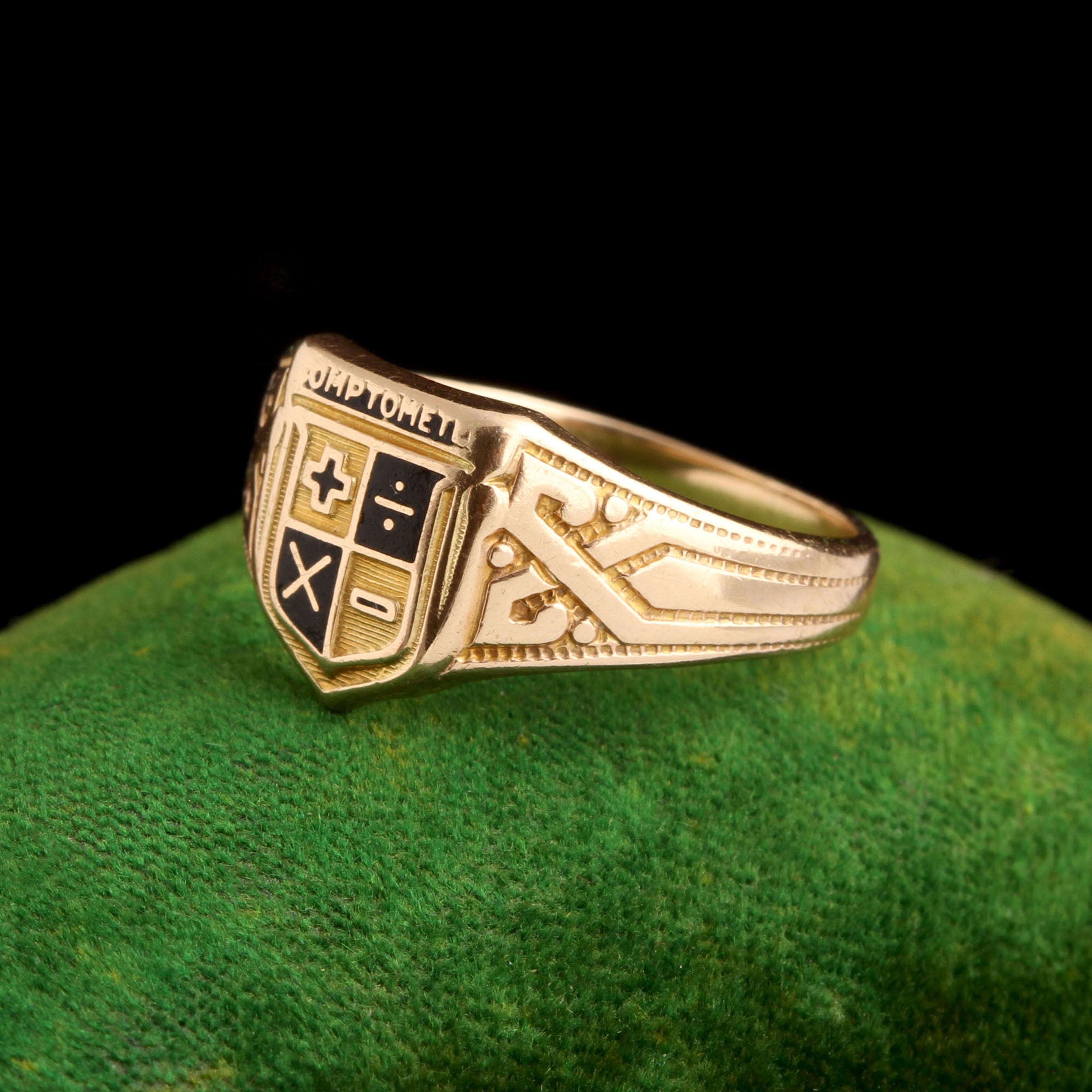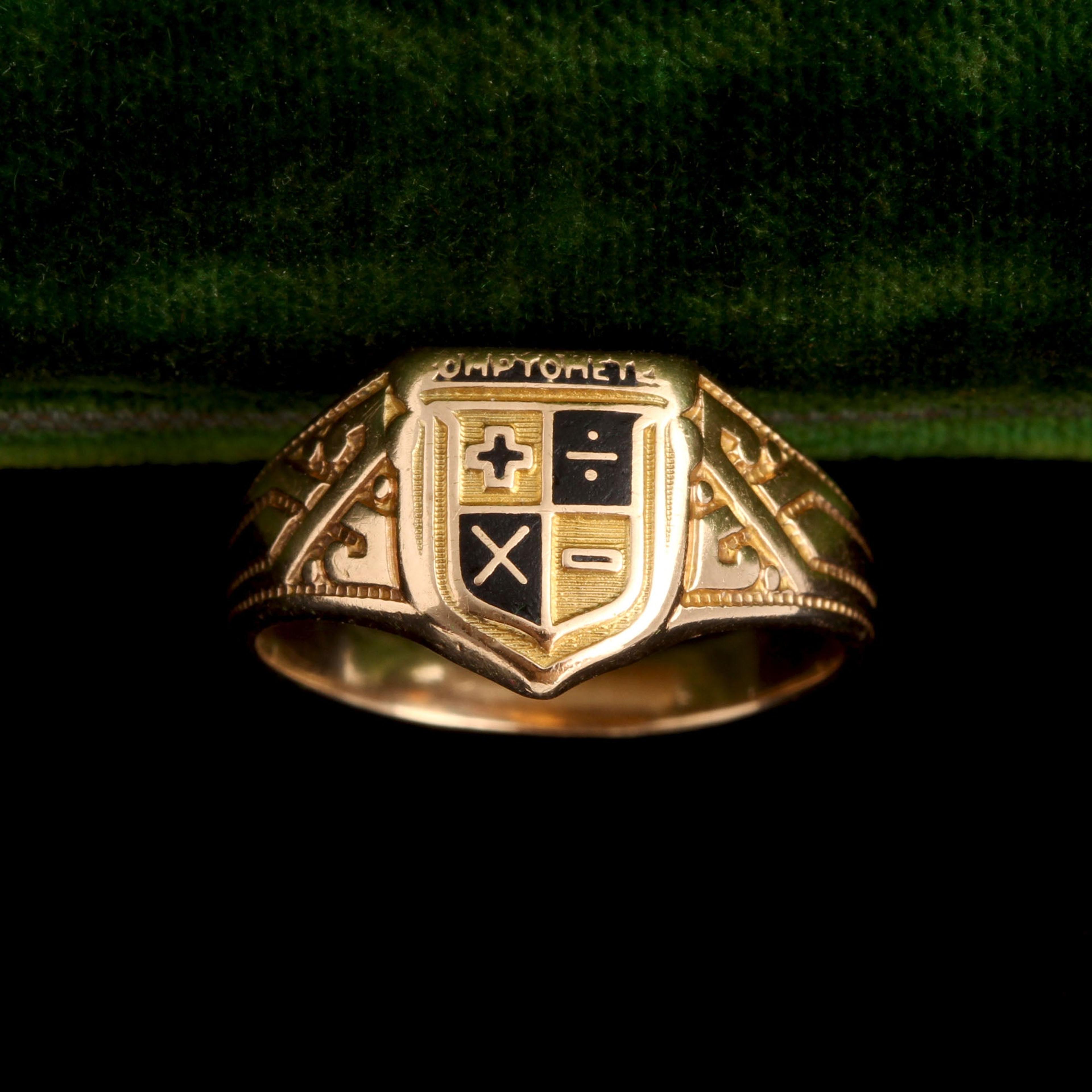 This gold family crest-style signet ring would have been awarded to students who performed exceptionally well while learning to use the Comptometer. This machine, made from 1887 to the mid-1970s, was the first push-button calculator. It could perform addition, subtraction, multiplication and division. Because each key depression accumulated the total, an operator could press multiple keys at the same time making it an extremely fast machine. Men at the factory who proved most talented at comptometing(?) received enameled tie pins and women got these + % X - rings so there would be no confusion over who was the biggest nerd in the room. Made by Ostby & Barton, an American jewelry manufacturer with fascinating ties to the Titanic (Ostby was an unlucky passenger).