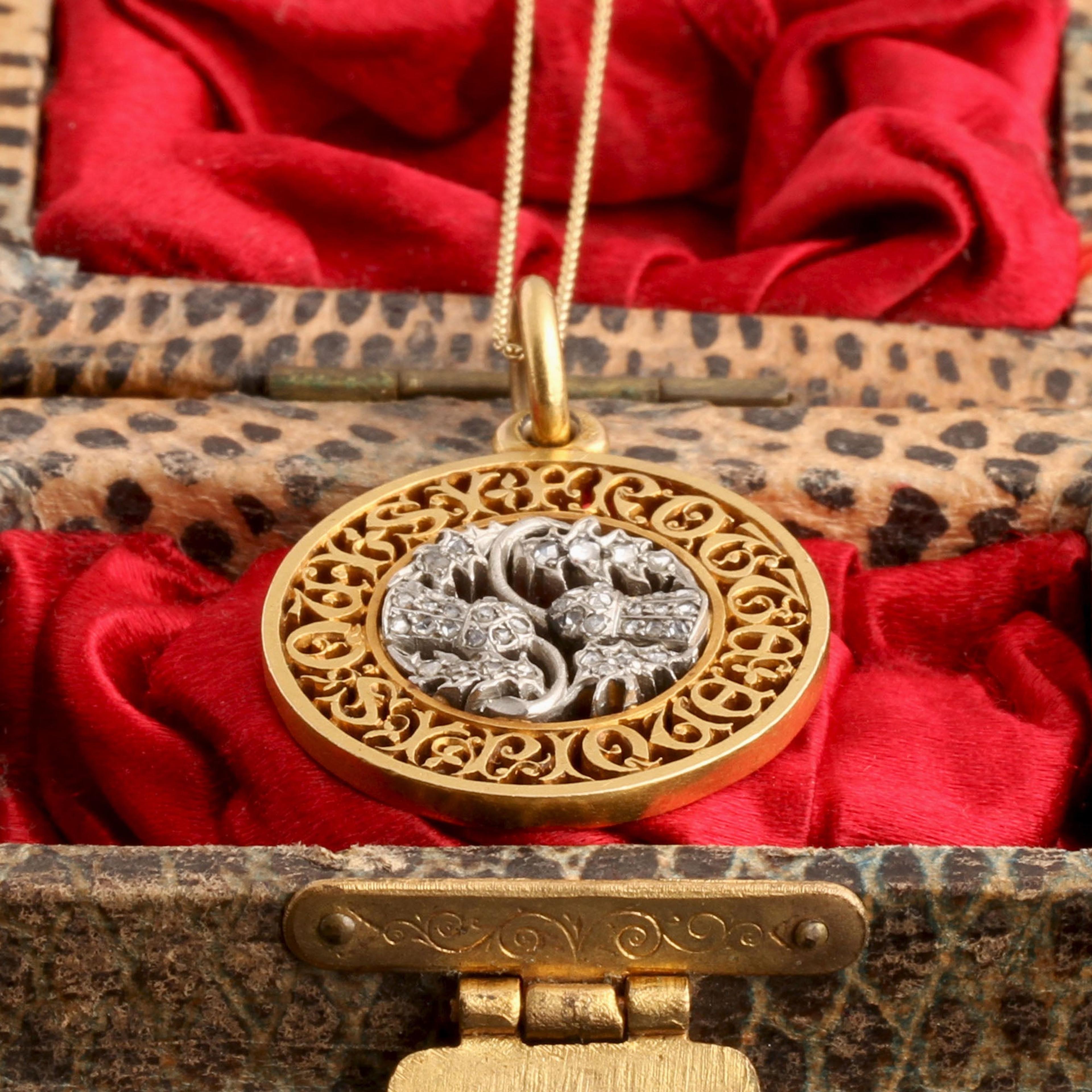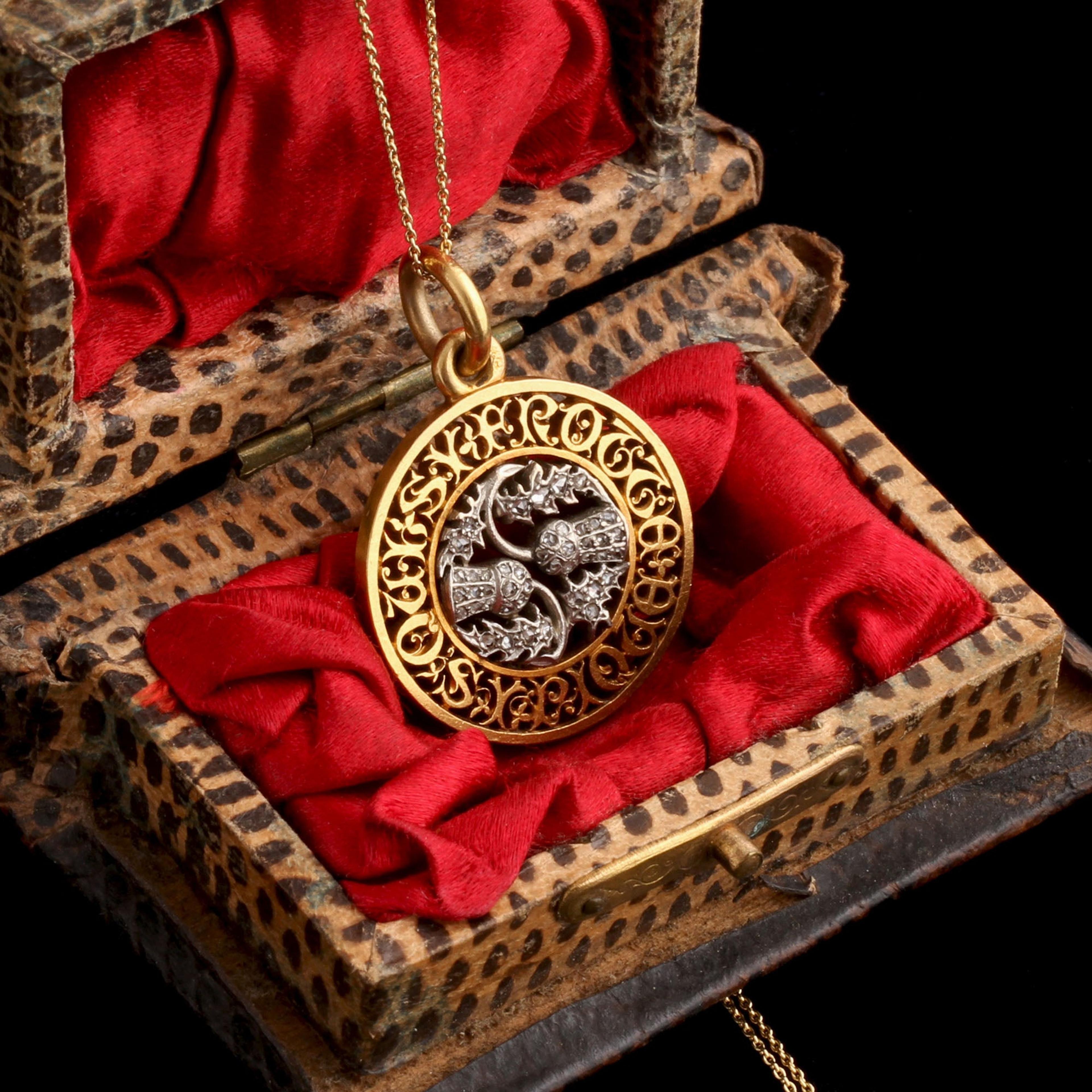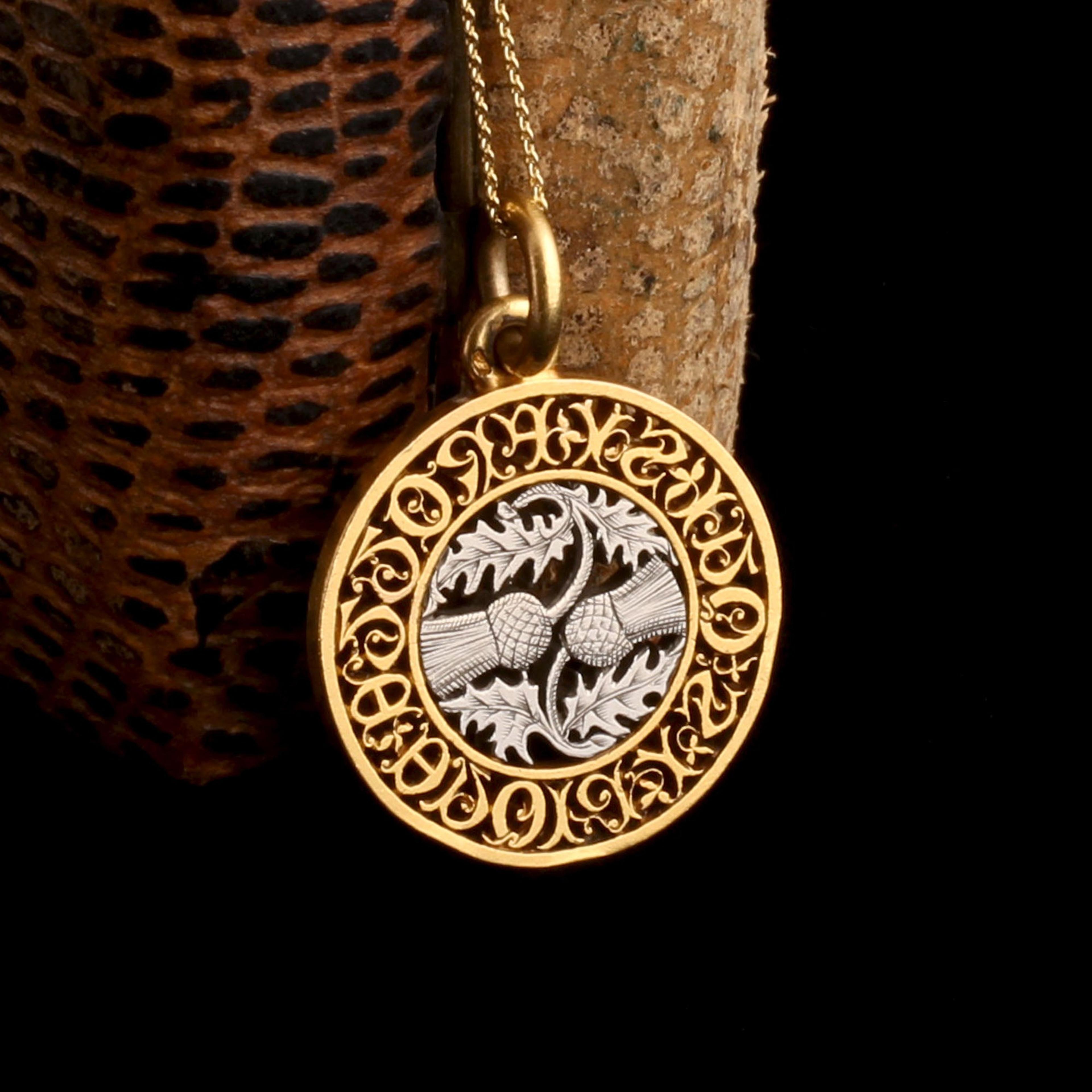 It translates to "gather thistles, expect prickles" (much like the saying "if you play with fire you'll get burned"). An Aesop's fable comes to mind about a boy and nettles. It goes like this: a boy, stung by a nettle, runs home crying to his mother to get her to kiss it better. "Son," said the boy's mother, when she had comforted him, "the next time you come near a nettle, grasp it firmly, and it will be as soft as silk." Moral of the story: Whatever you do, do it with all of your might. So the meaning here can be mind your own damn business, or FORTITUTE! It's heavy, exceptionally crafted, with the highest quality materials. We imagine it was a special commission. Note the thistles are engraved platinum on the front, diamond-encrusted on the reverse.