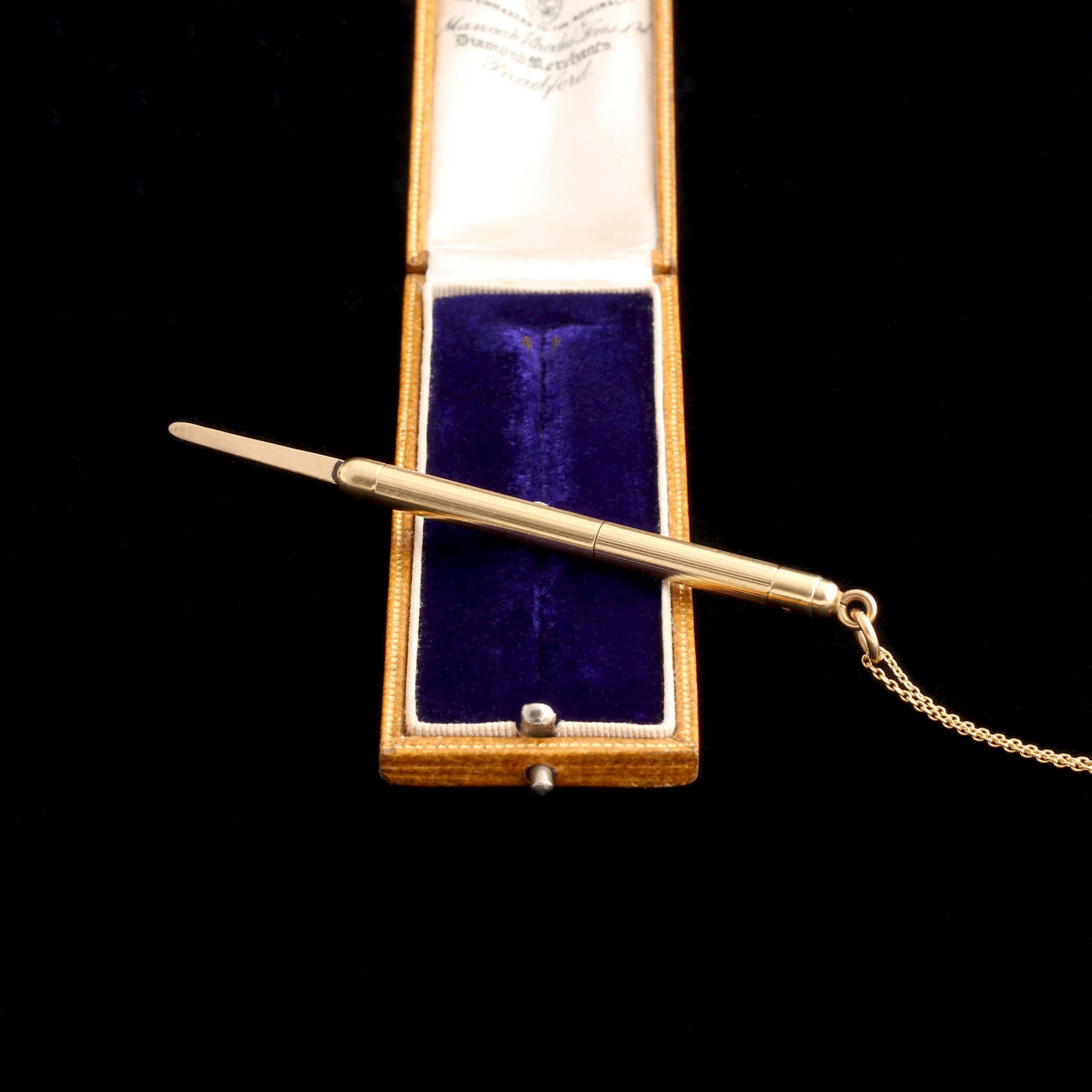 Utility, but make it fashion. A flat little toothpick swivels out when you twist the gold pendant. In the Edwardian era, no object was too quotidian to cover in gold.
