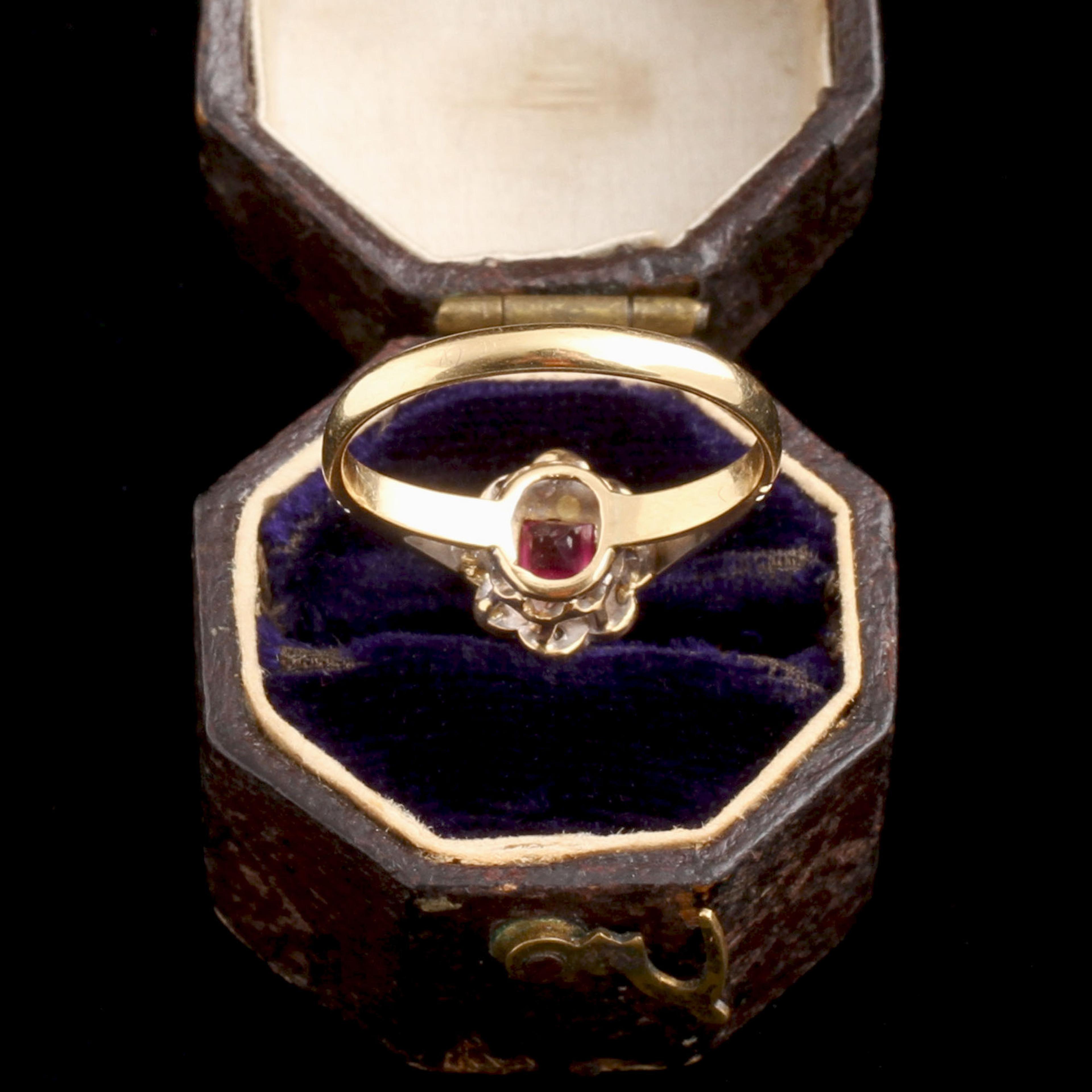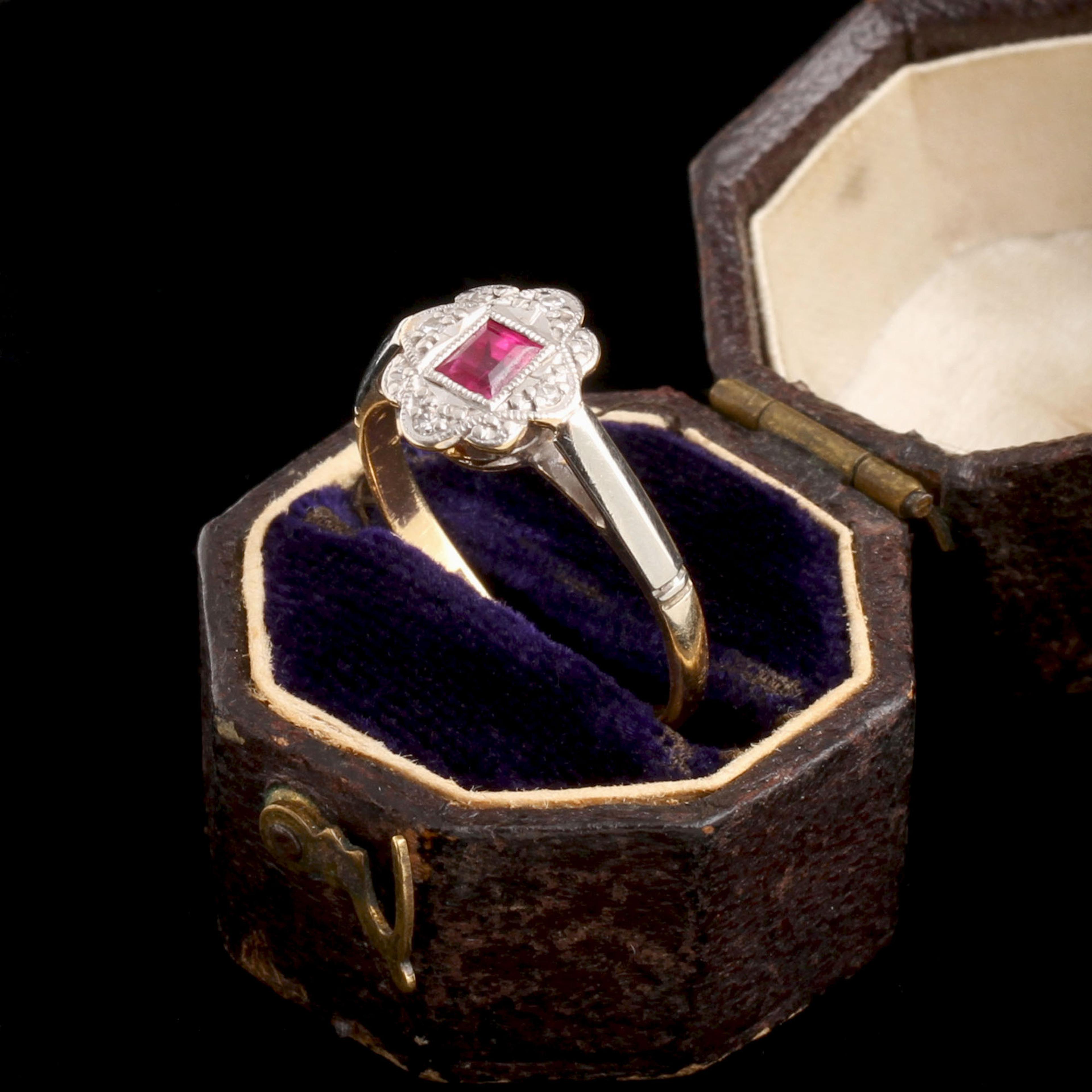 18k gold & platinum (marked), .37ct synthetic ruby, 4 1.5mm single cut diamonds