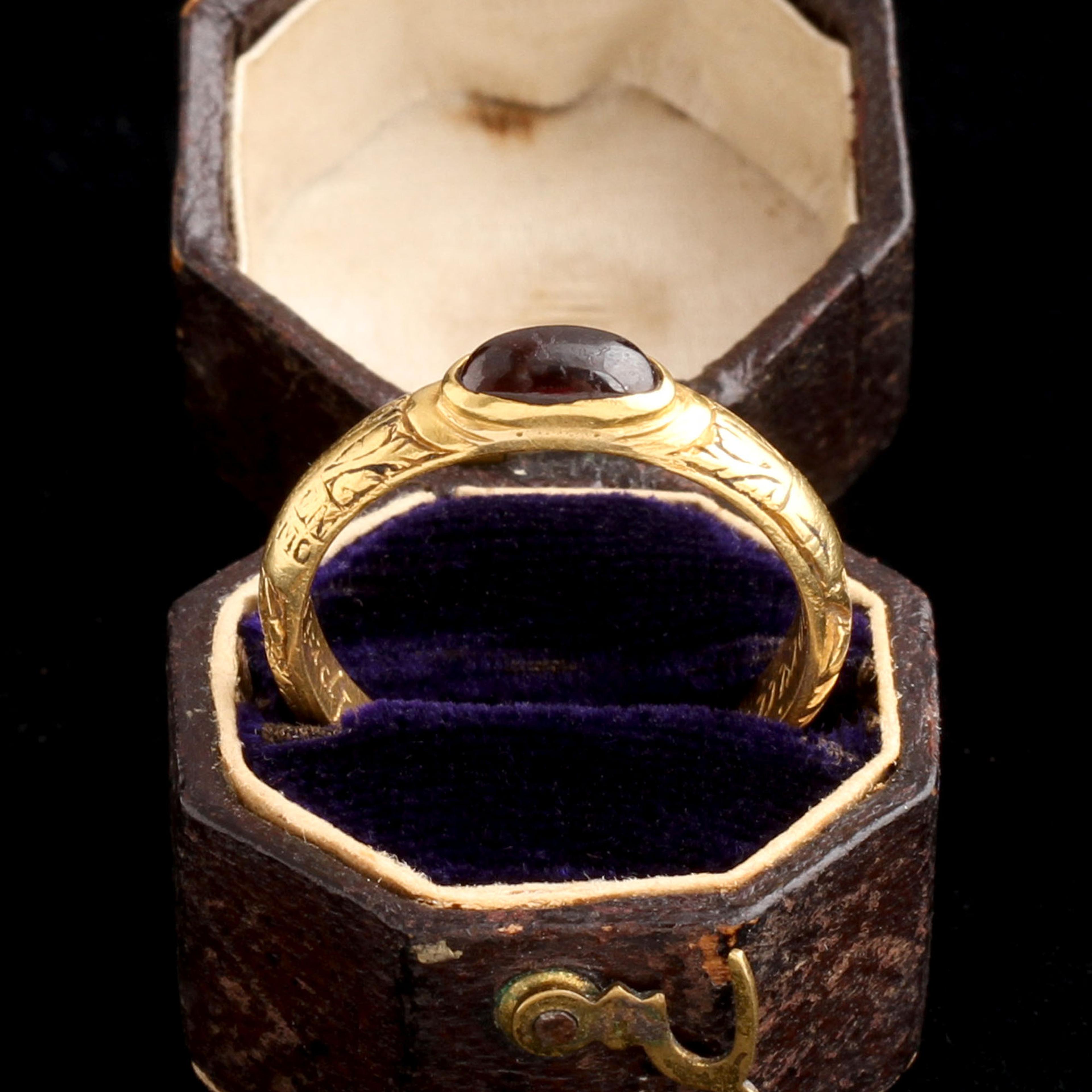 22k gold (tests), remnants of black enamel, 7.5mm x 4mm garnet cabochon