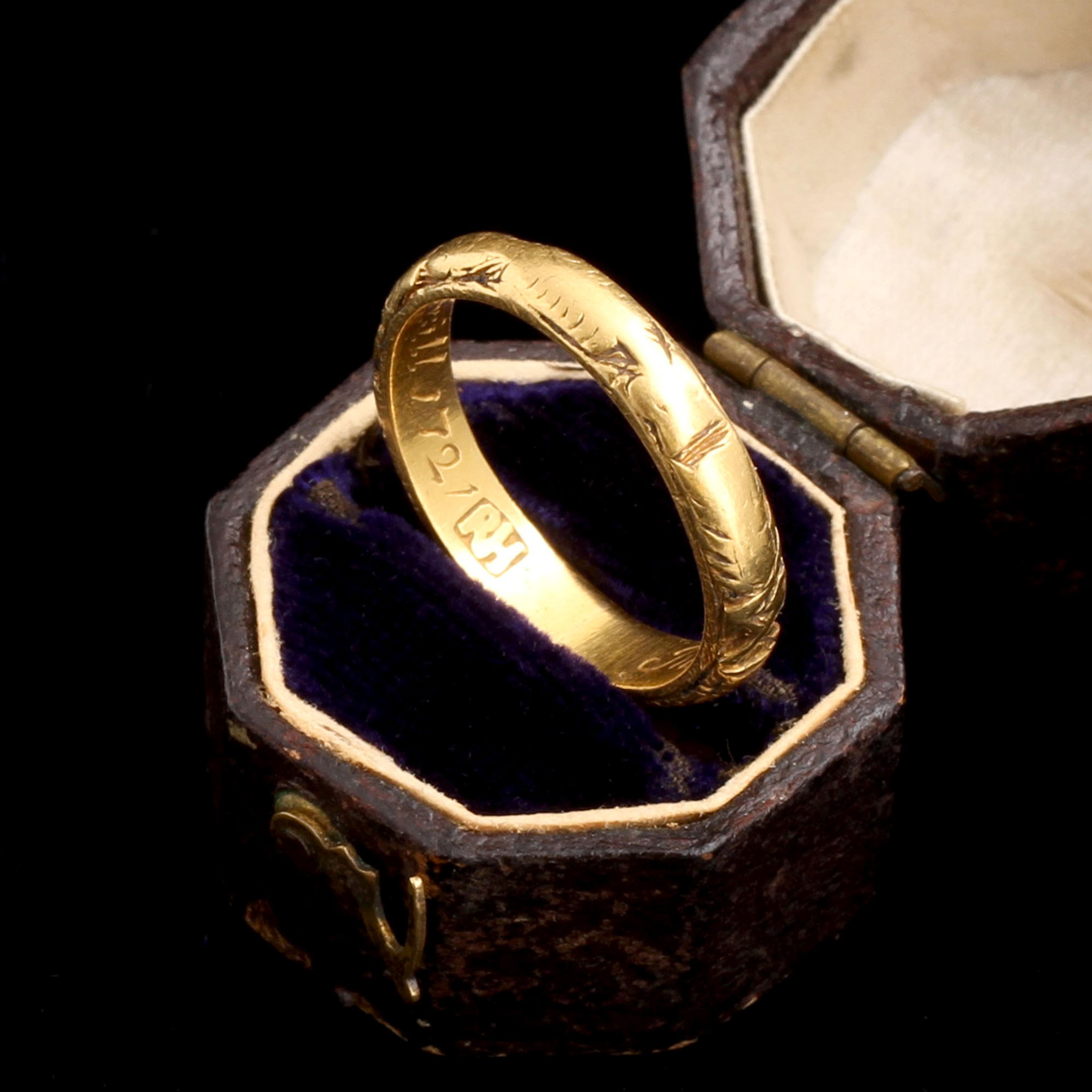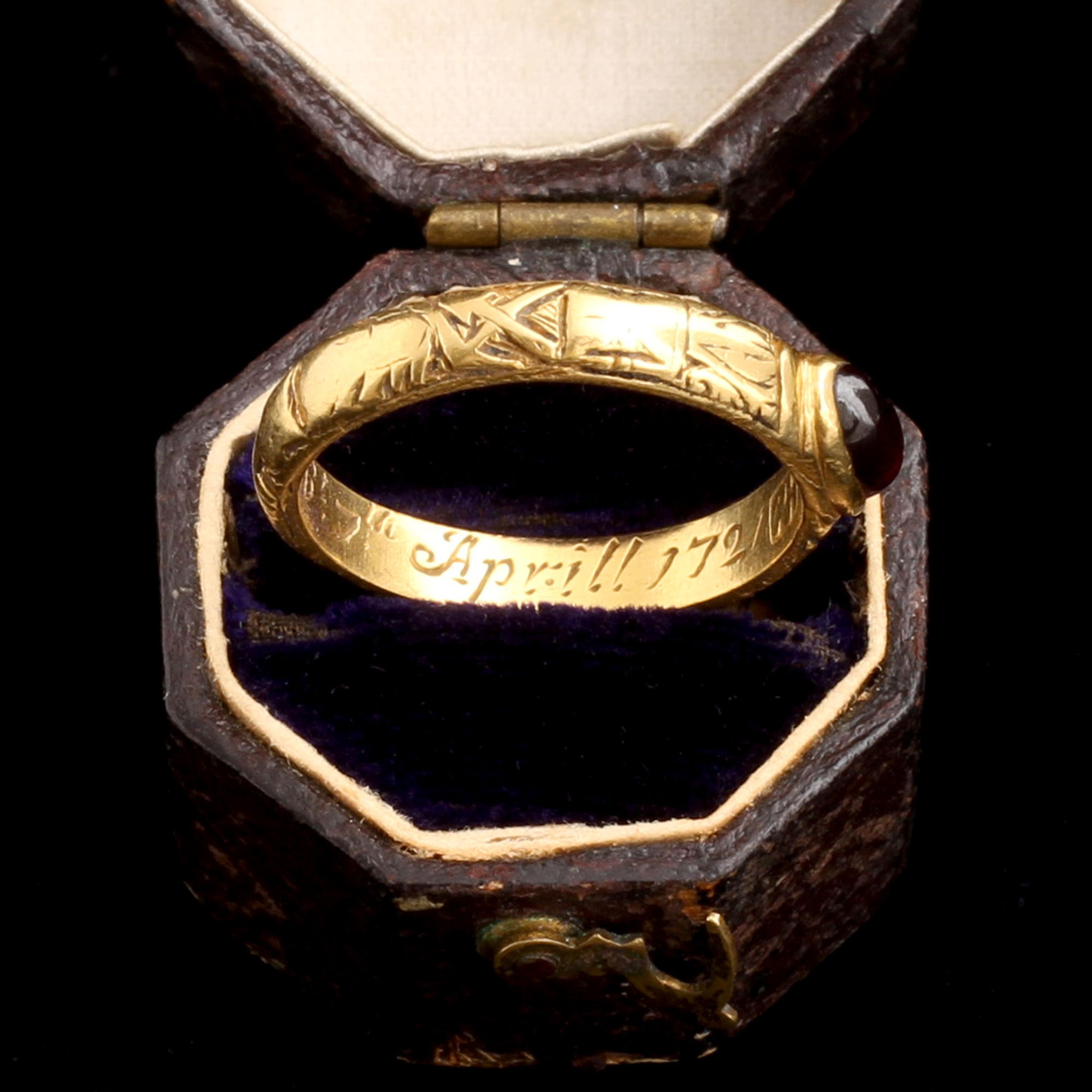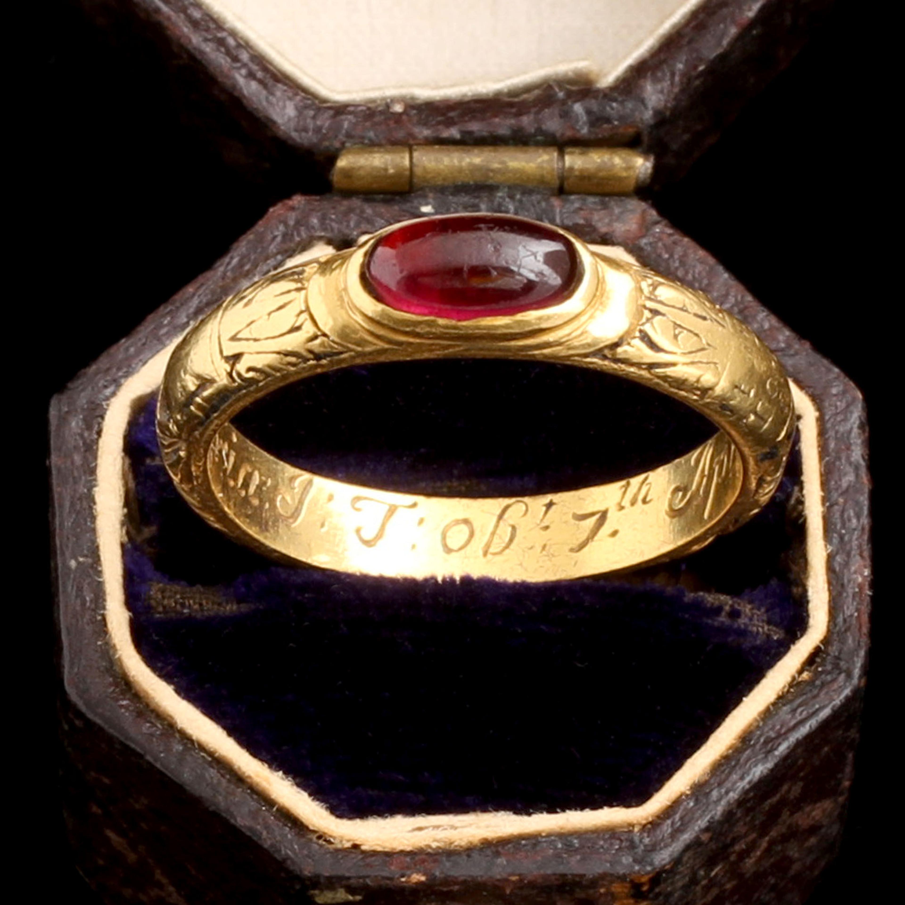 VERY RARE SKELETON memorial rings (sometimes called "body" rings in the biz) are already vanishingly scare. Here we have a true prize: a garnet-set example dedicated in 1721, fresh from a long-held private collection. We almost never purchase from non-professional dealers, but this one - a single heirloom piece, kept for decades - was irresistible. Inside the band is engraved: "In memoria J:T: obt 7th Aprill 1721." The ring bears the RH goldsmith's mark; three of this maker's skeleton rings are preserved in the British Museum's collection. Much of the original black enamel has worn away, and the skeleton details are softened with age. But for collectors (and for daily wear) these imperfections make it all the more approachable. The oval cabochon garnet - called a "carbuncle" in the 18th century - anchors the design. Look closely and you'll spot classic memento mori emblems: my favorite are a pair of crossed gravediggers' tools.