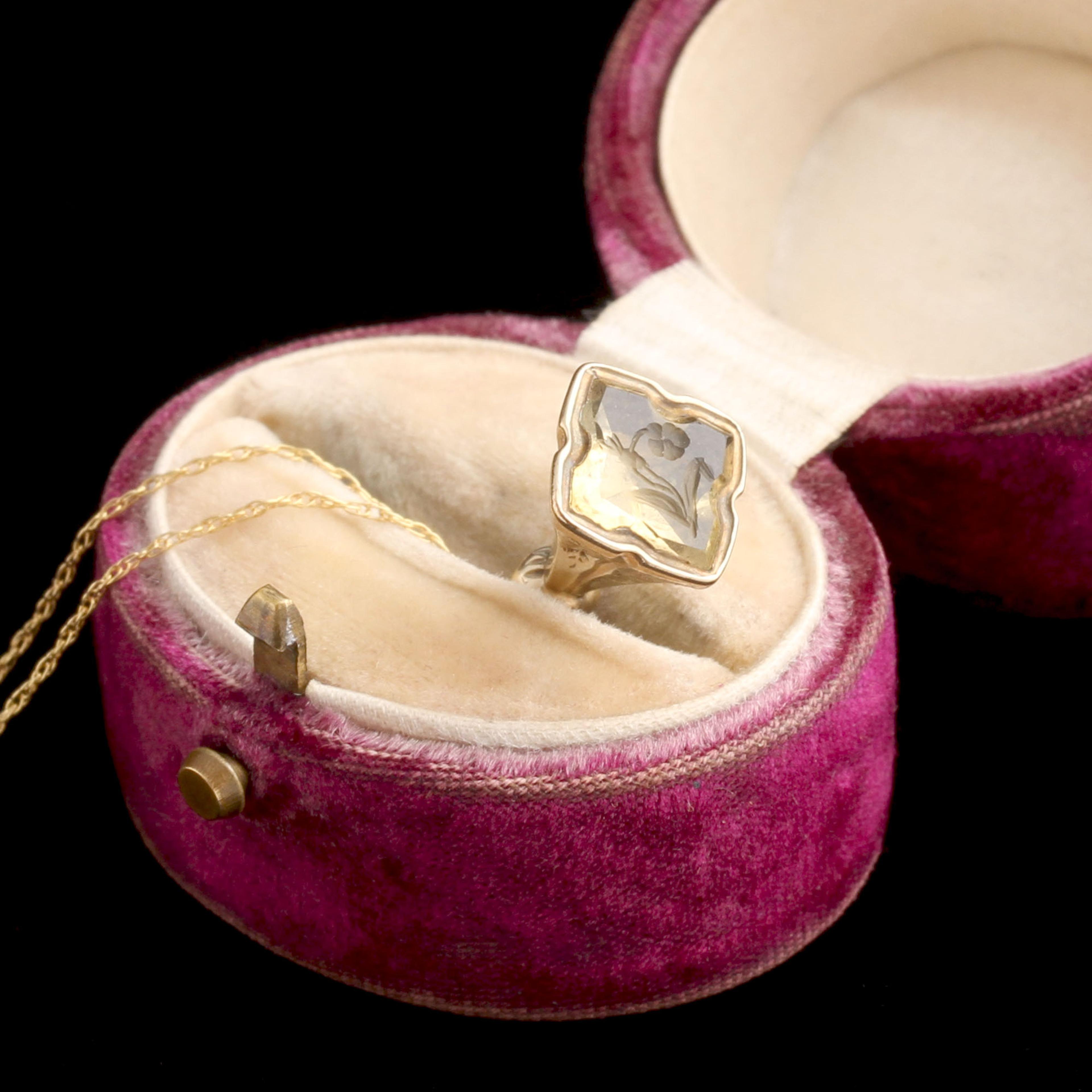A wee little wax seal modeled in gold with a quatrefoil citrine base etched with a pansy. “Pansy” comes from the French pense meaning “to think.” Lovers of a hidden meaning, the five-petaled flower was frequently used in 18th and 19th century love token jewelry to express the sentiment “think of me.”
