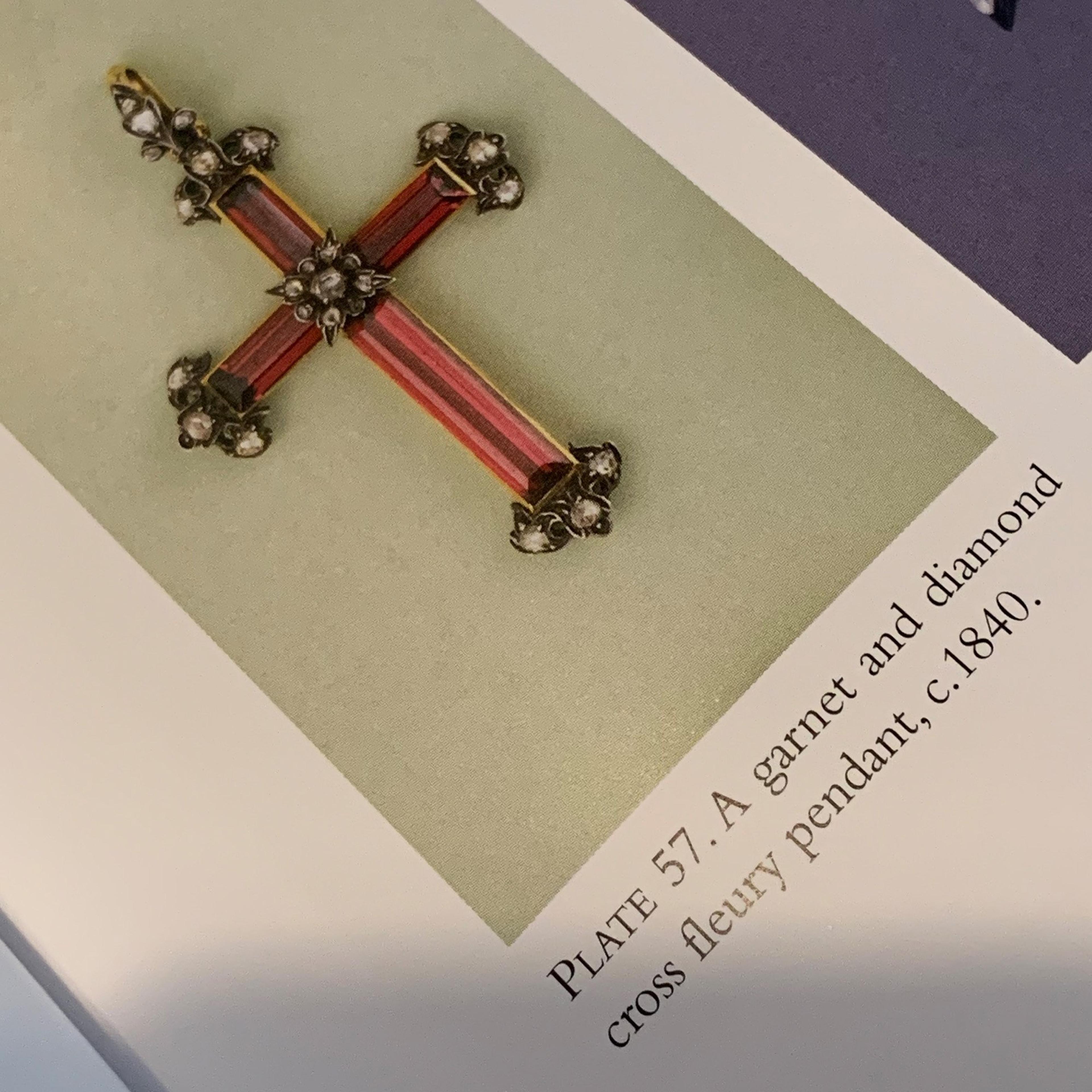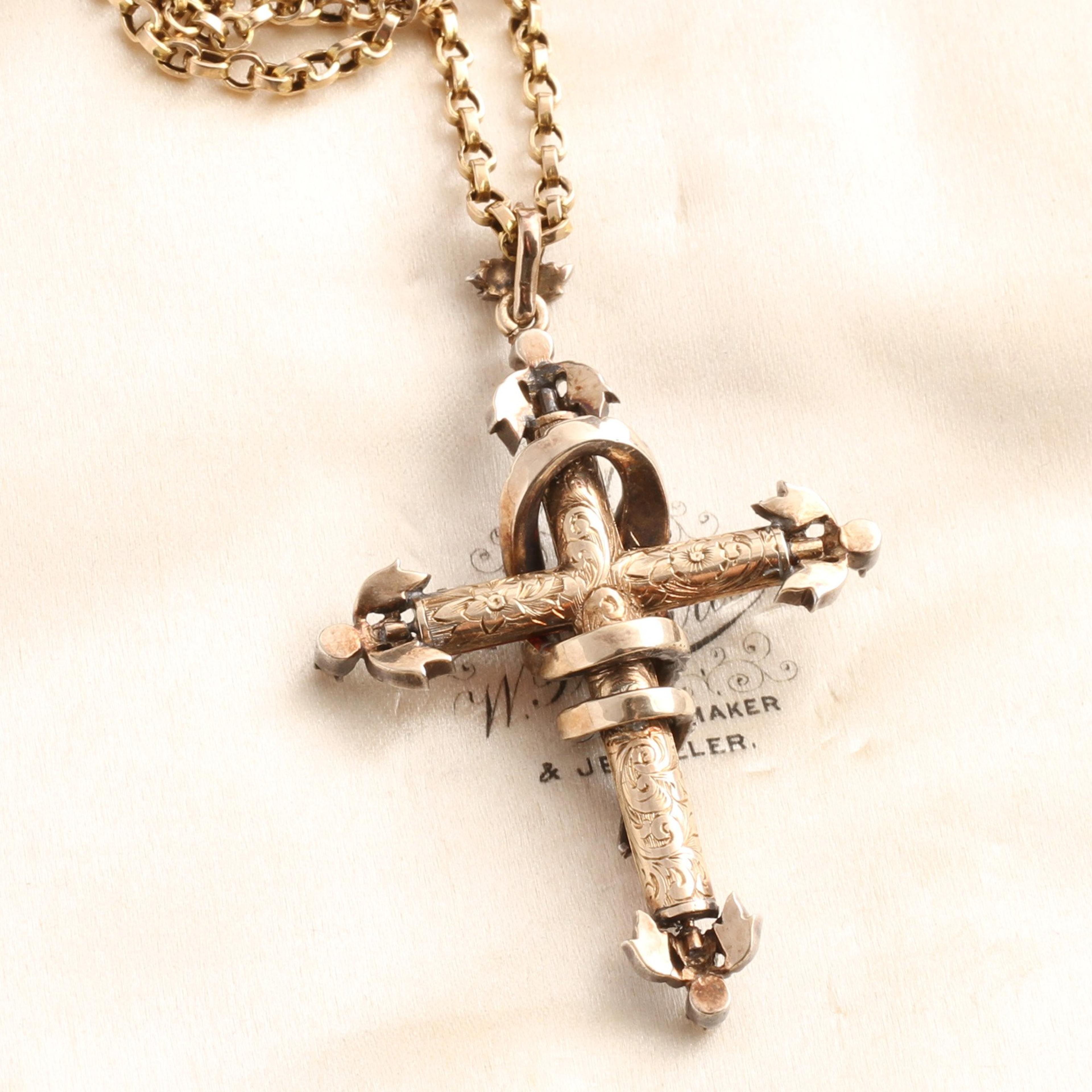 This exceptional and very rare pendant dates to the early Victorian period. This style of cross is known as a "fleury cross," so named for the petaled elements at the end of each arm of the cross inspired by the fleur-de-lis (or lily). It was often used as a symbol of the resurrection. The three petals of the fleur-de-lis can also be interpreted as a representation of the father, son, and holy spirit; or when used in heraldry, the fleury cross represents the virtues of wisdom, faith and chivalry. This outstanding example employs garnets (yes, those are garnets!) as the body of the cross around which is coiled a diamond-studded snake with ruby eyes and a forked golden tongue. In Christianity, the serpent is not only a symbol of chaos and evil but also of fertility, life and healing. The reverse side is embellished with engraved flowers and scrollwork. A similar, and dare I say slightly less impressive, fleury cross is referenced in the excellent jewelry reference book Understanding Jewellery by Daniella Mascetti and David Bennett. Hangs from a later Victorian 32" 9k gold chain.