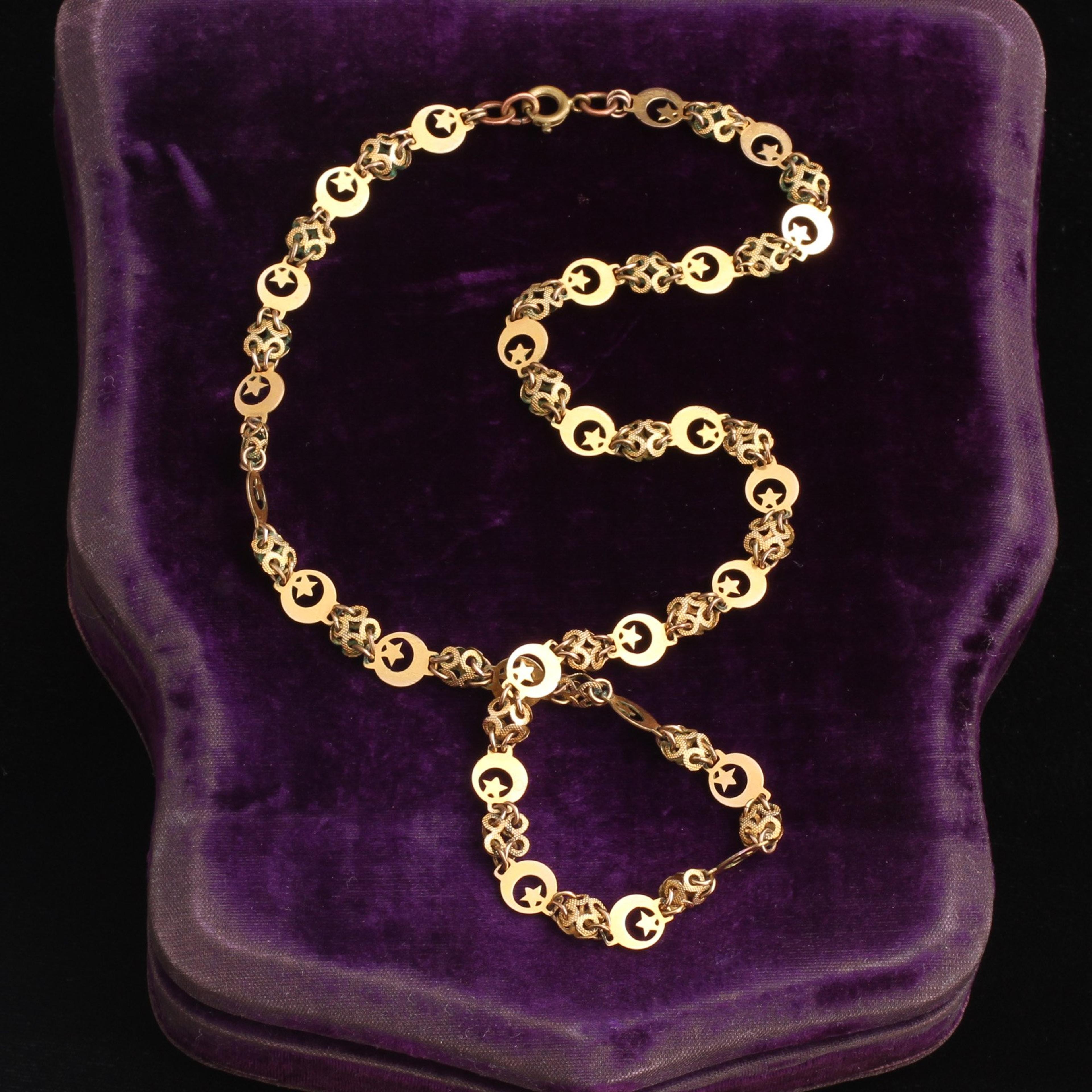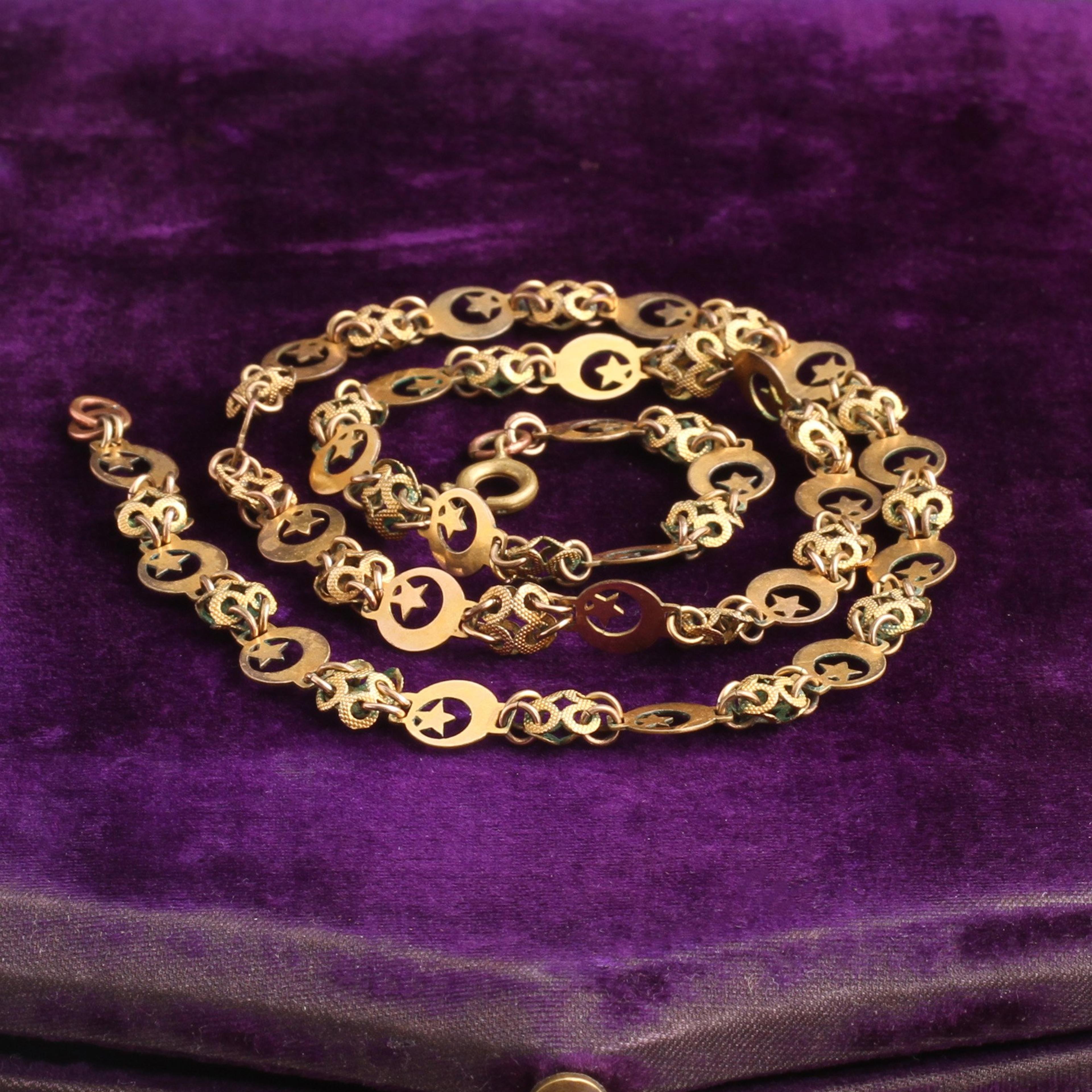 This one's for my witch sisters. A pinchbeck moon-and-star chain made in the 1850s, at the height of the spiritualism movement's popularity. I can't be sure that someone wore this to a seance, but I wouldn't rule it out.
