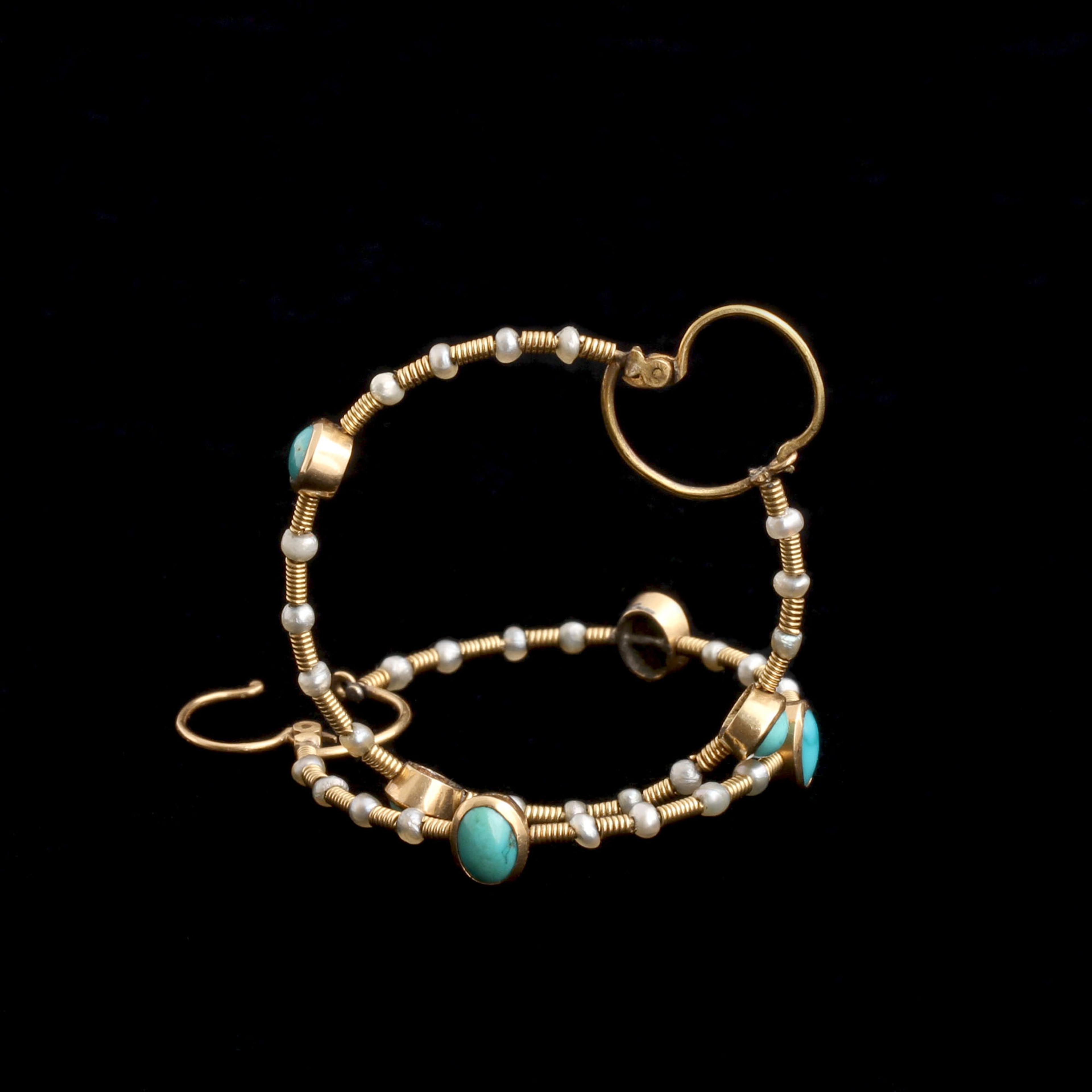 Luminous turquoise ovals appear around the circumference of these generously sized hoop earrings, along with wrapped rows of seed pearls. The long, linear silhouette is typical of the early Victorian period, when graceful restraint was prized over showy excess. There's a whiff of Neoclassicism here, but it's understated.