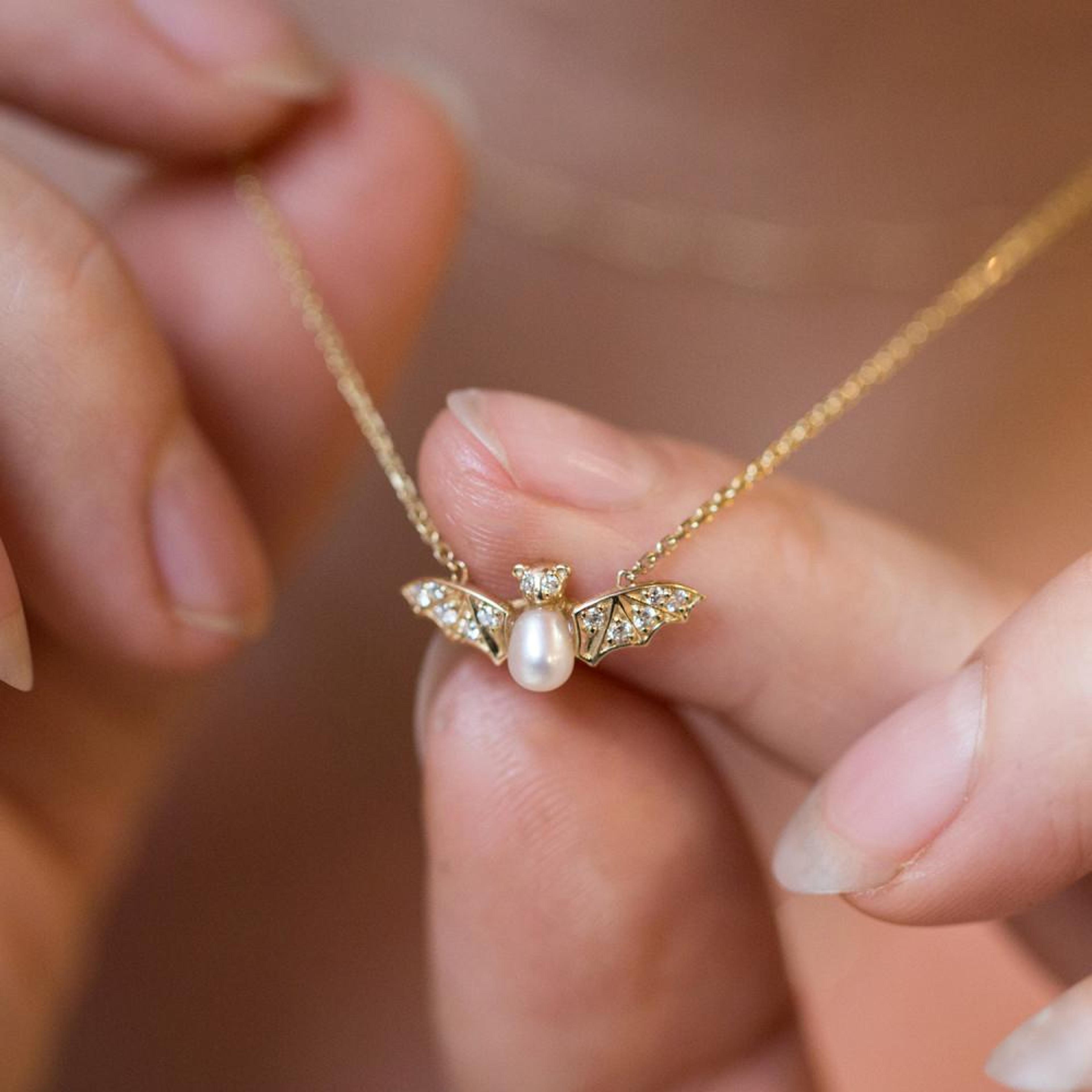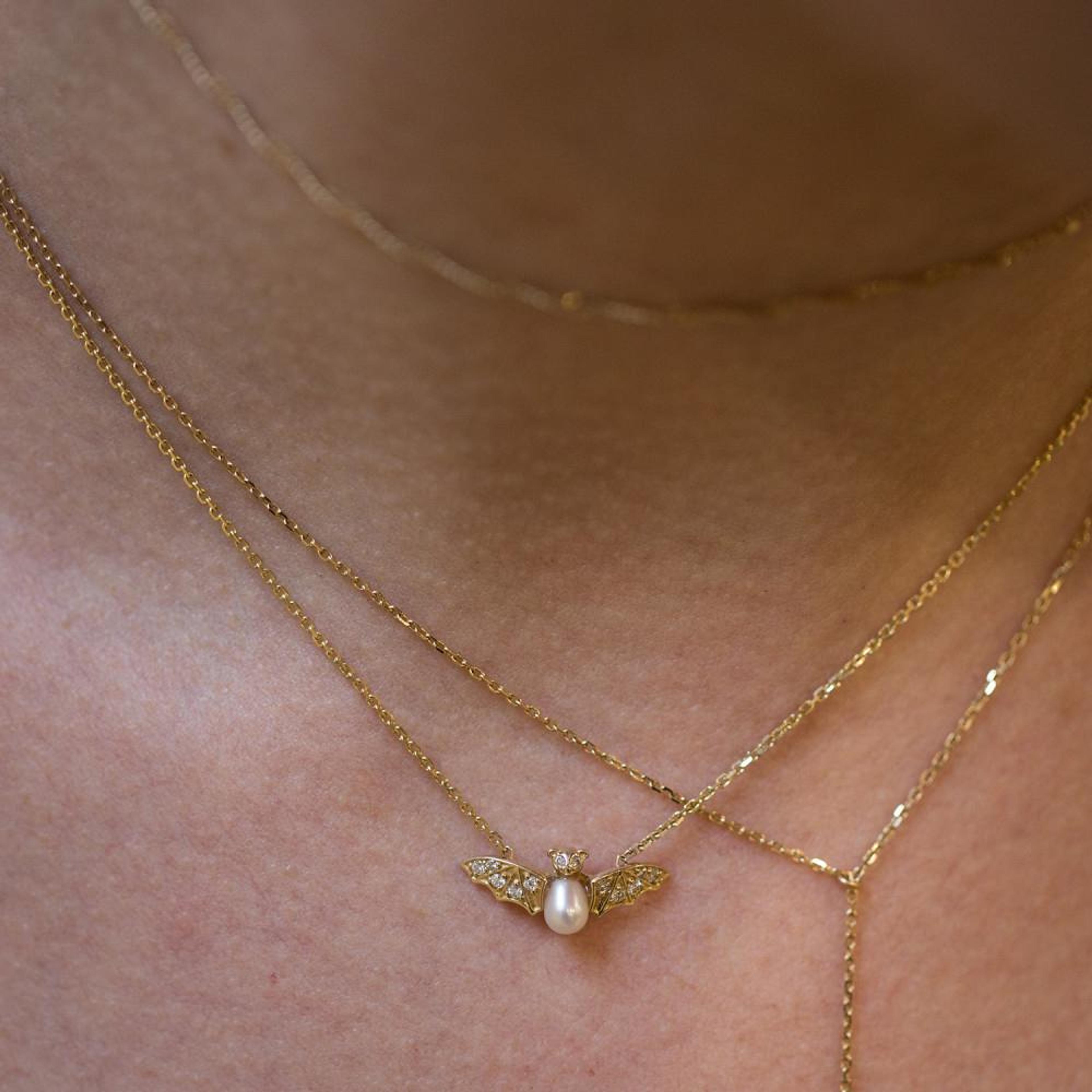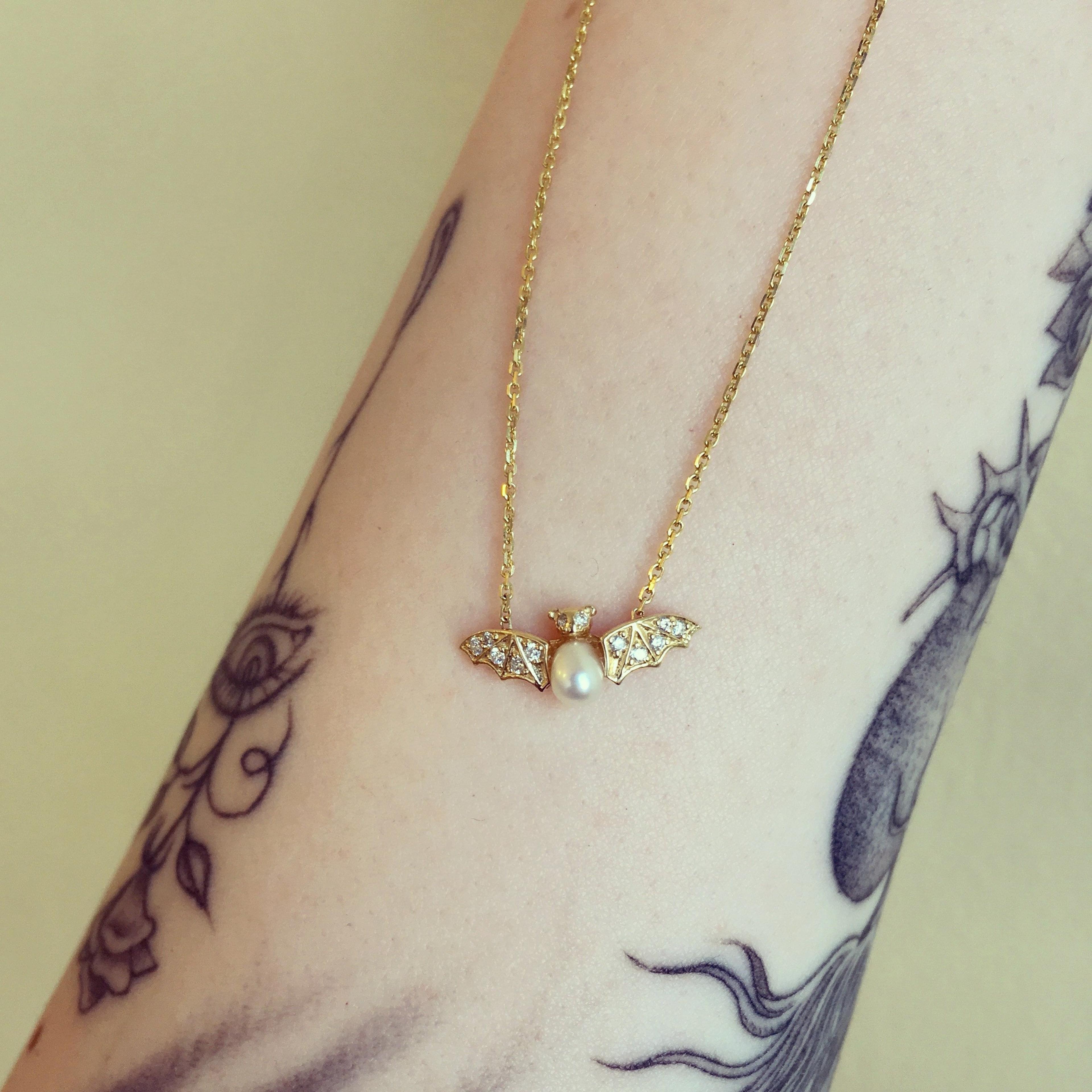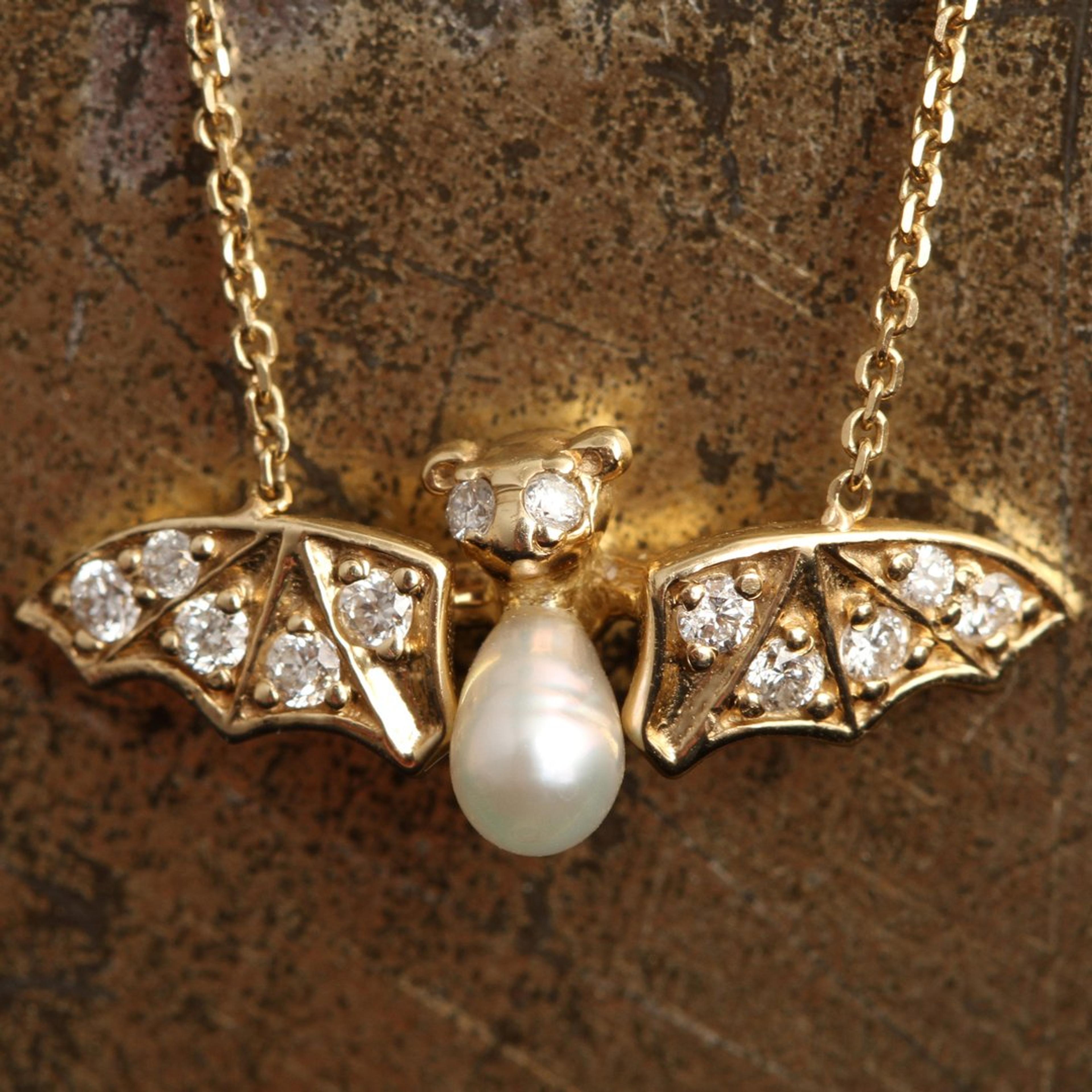 A diamond-encrusted gold bat is suspended from fine golden chains. Her body is a natural pearl, and her eyes glitter fiercely. Originally I made this piece for myself because I've always loved bats. Did you know they're the only mammal that can fly?