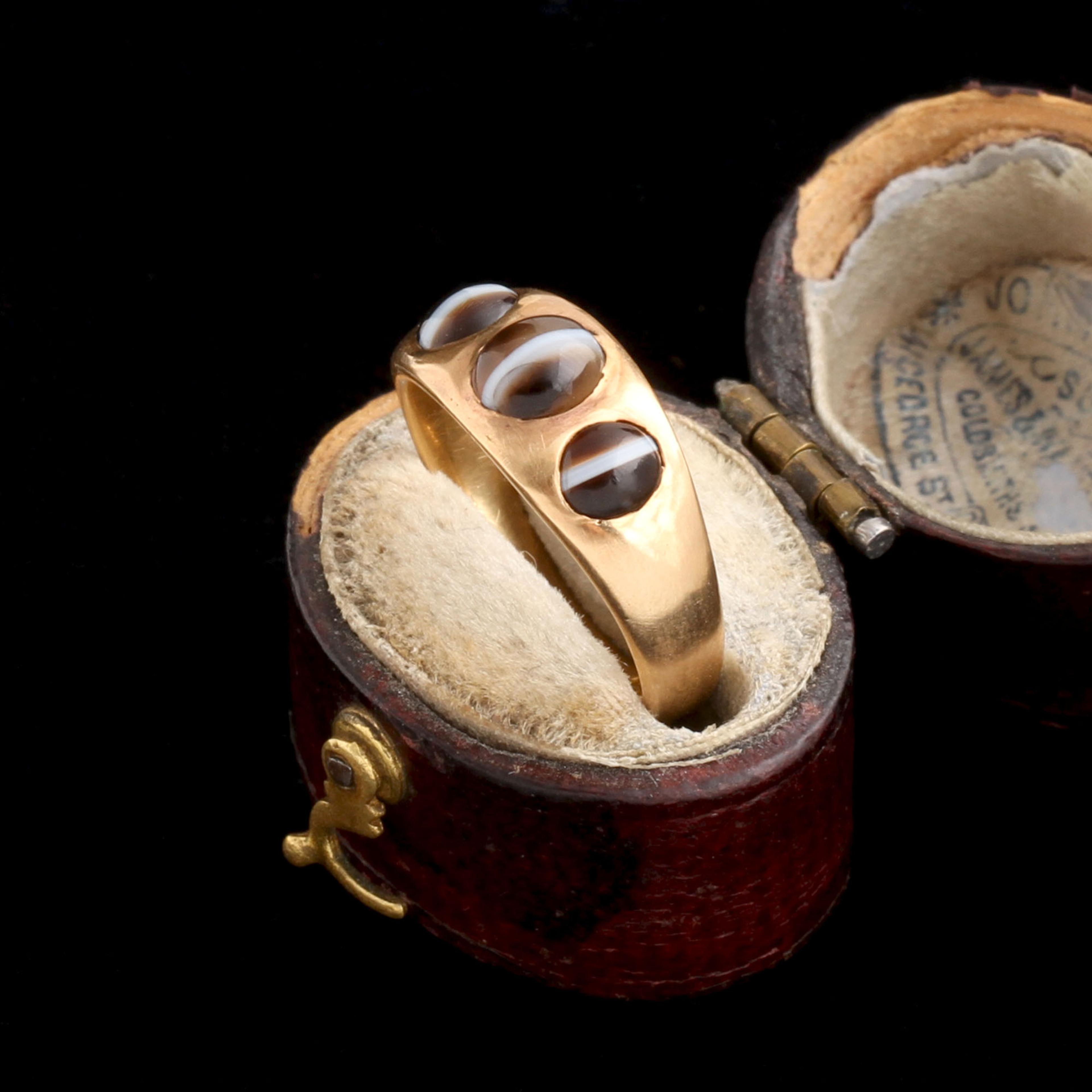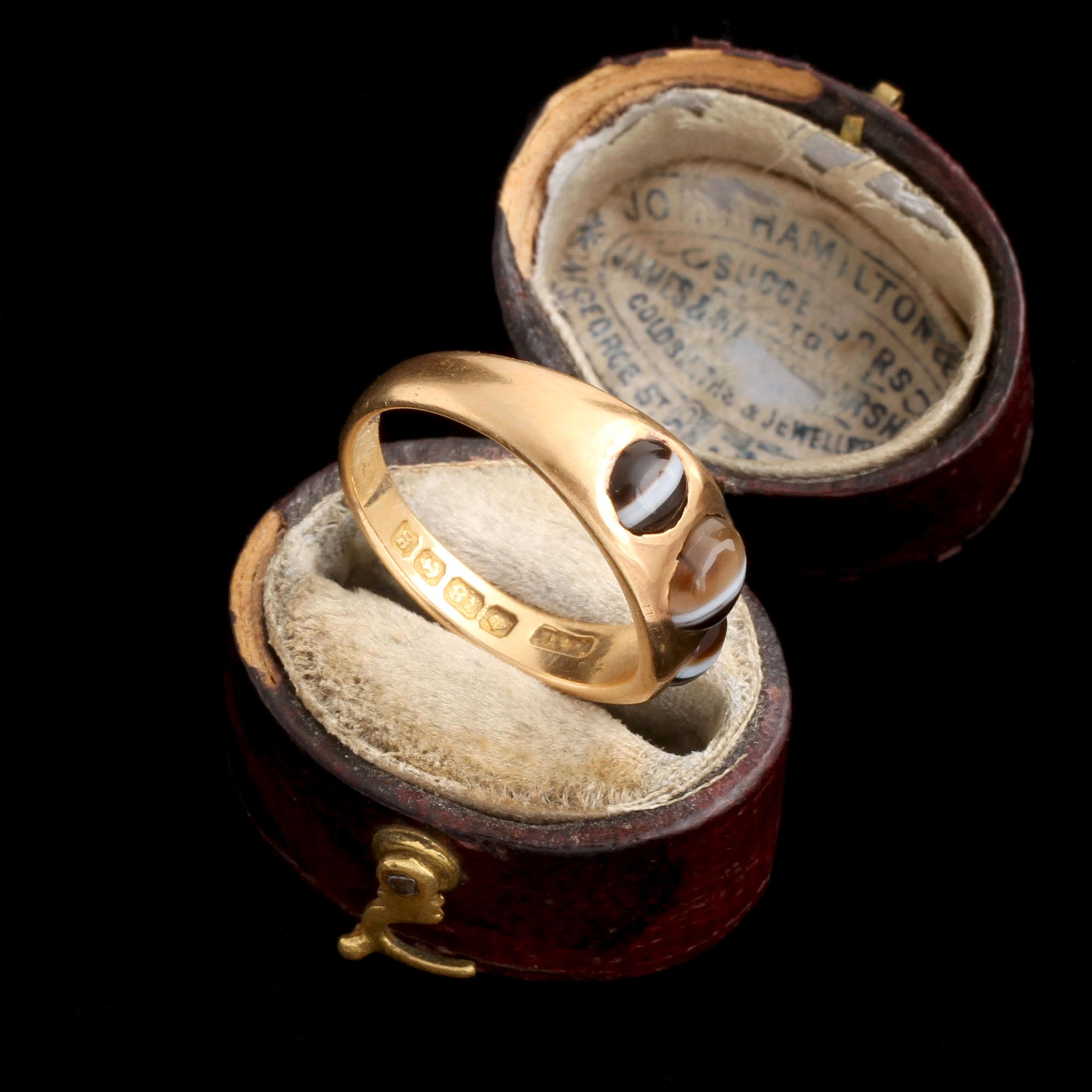 Banded agate (also known as onyx) is the stone most often used in carving cameos and intaglios. It's been that way since ancient times. But cutting them en cabochon like this, showcasing the sexy white stripe, became popular in the mid 19th century.