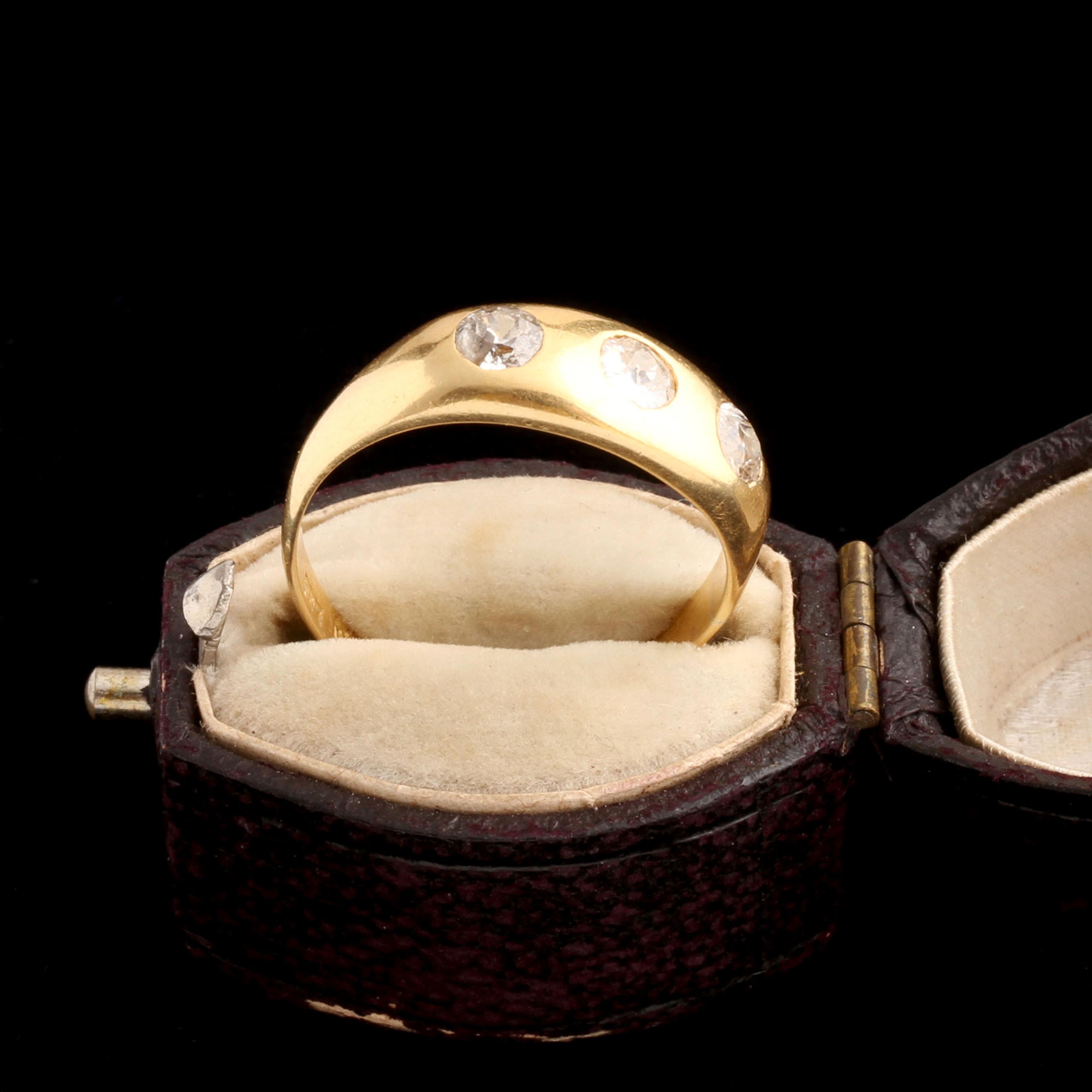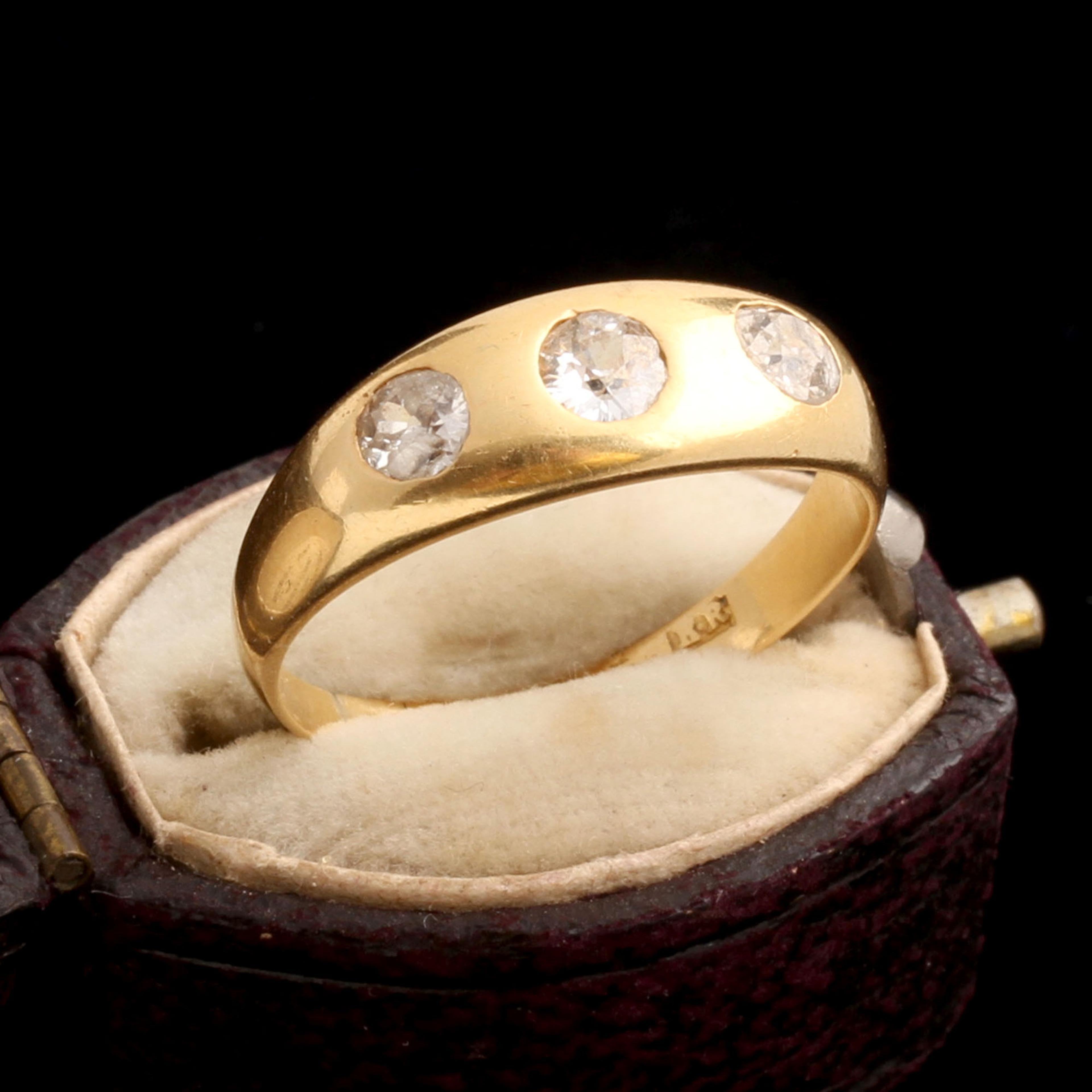 18k gold (marked), 3 old European cut diamonds (.21ct, .23ct, .16ct)