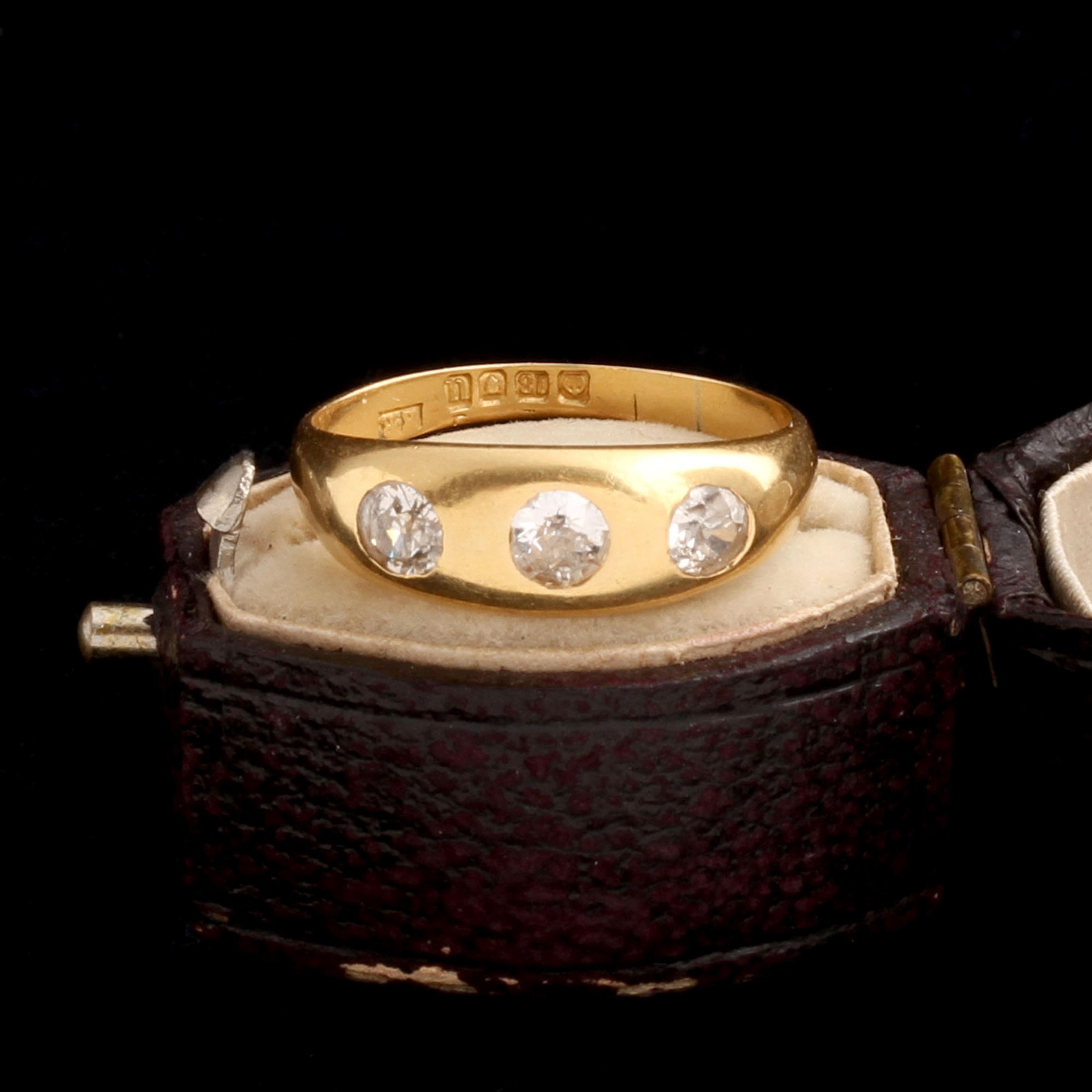 This burnished diamond band was assayed in London in 1915, in the midst of World War I. Jewelry from this period often reflects a quieter kind of luxury, pared down from the extravagant Edwardian styles of the previous decade. While countless young men were away at the front, those at home clung to sentimental tokens like this. The three stones, an enduring symbol of past, present, and future, would have carried extra poignancy when the future itself was so precarious.