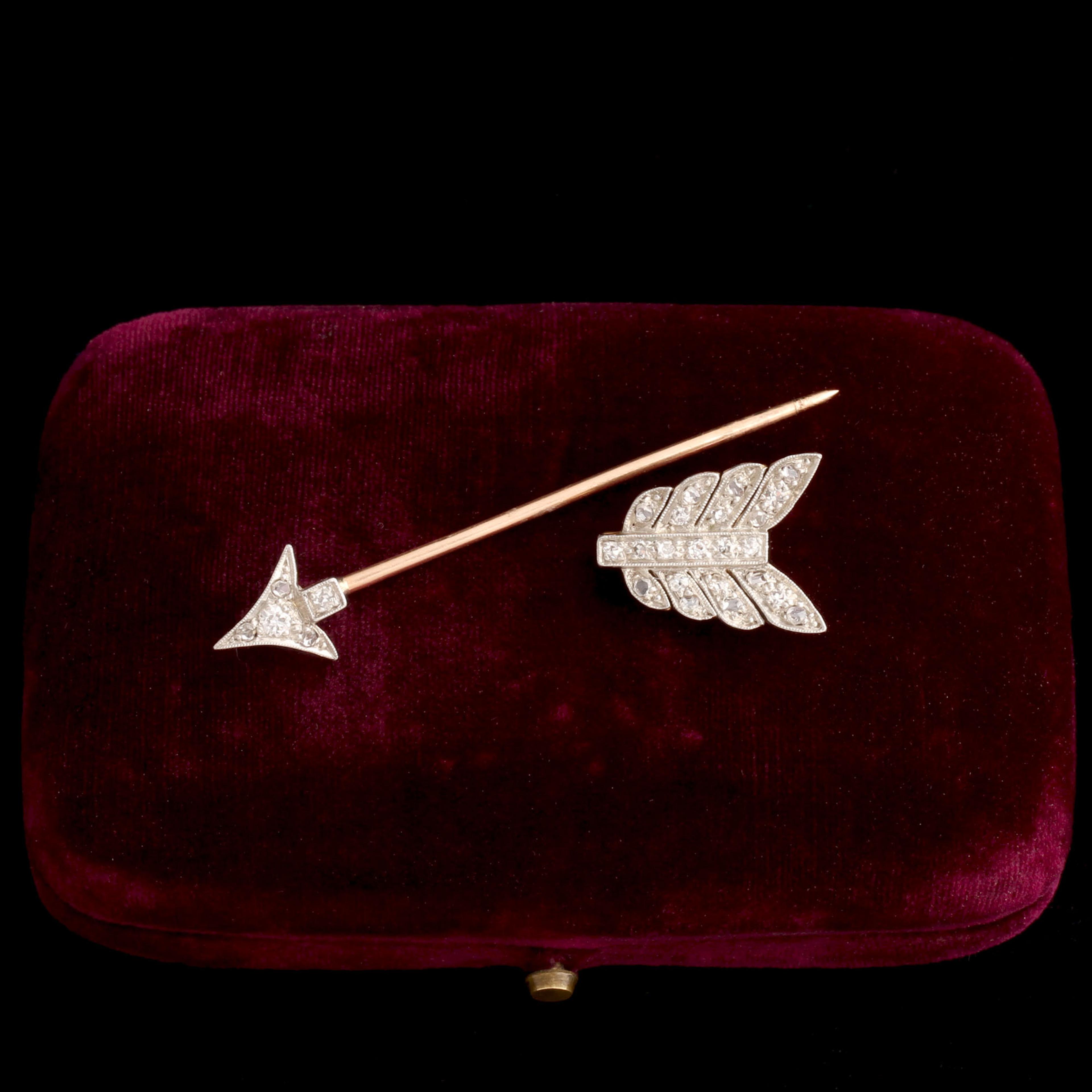 Beginning in the 17th century, this type of pin was used to fasten one's jabot (ruffled or pleated collar of a blouse). This jabot pin modeled in the shape of an arrow dates from much later than that - the transitional years between the Edwardian and Art Deco periods. Lindsay and I both own one and wear it as a single, very dramatic earring. Made in platinum and 18k gold and set with 27 rose & old Euro cut diamonds.