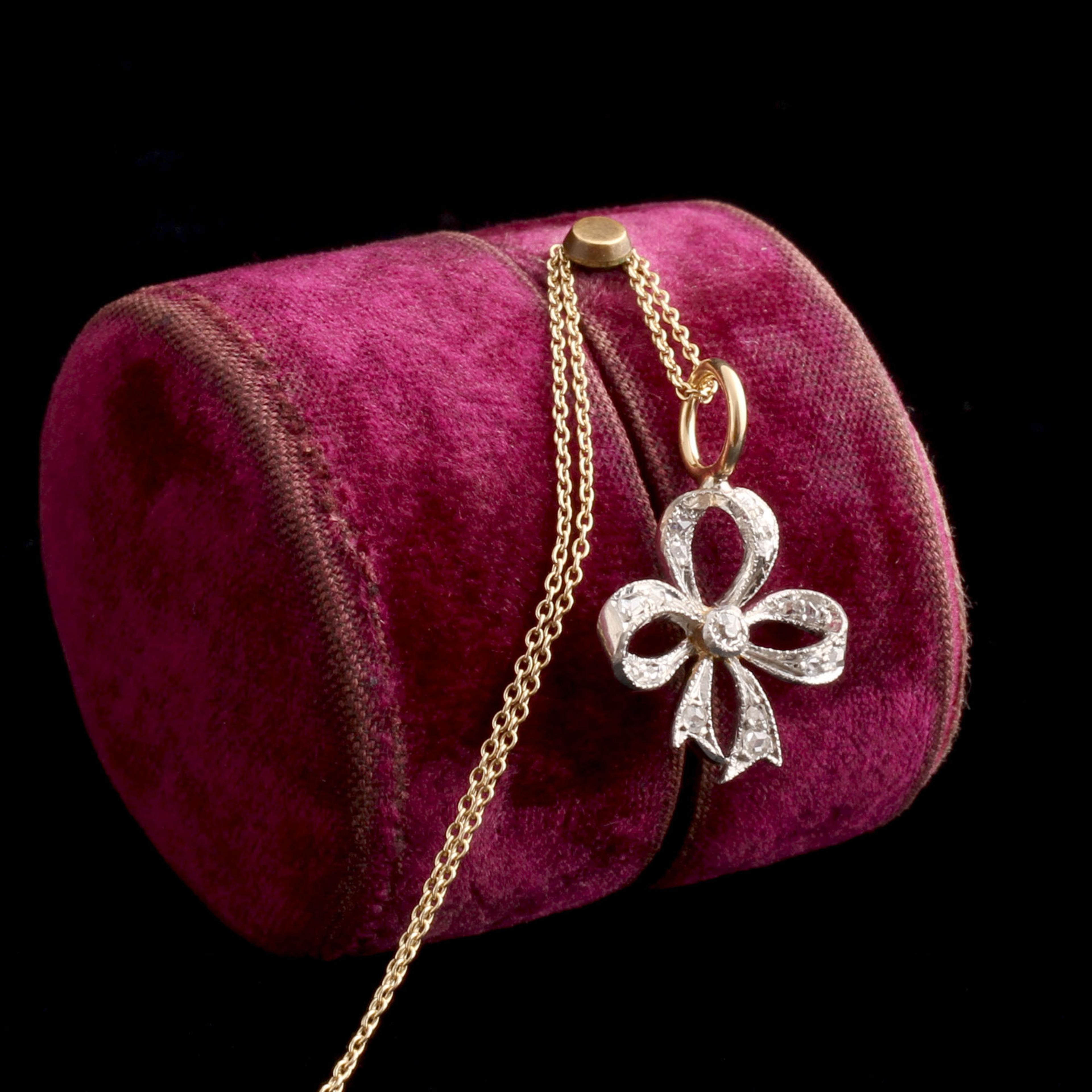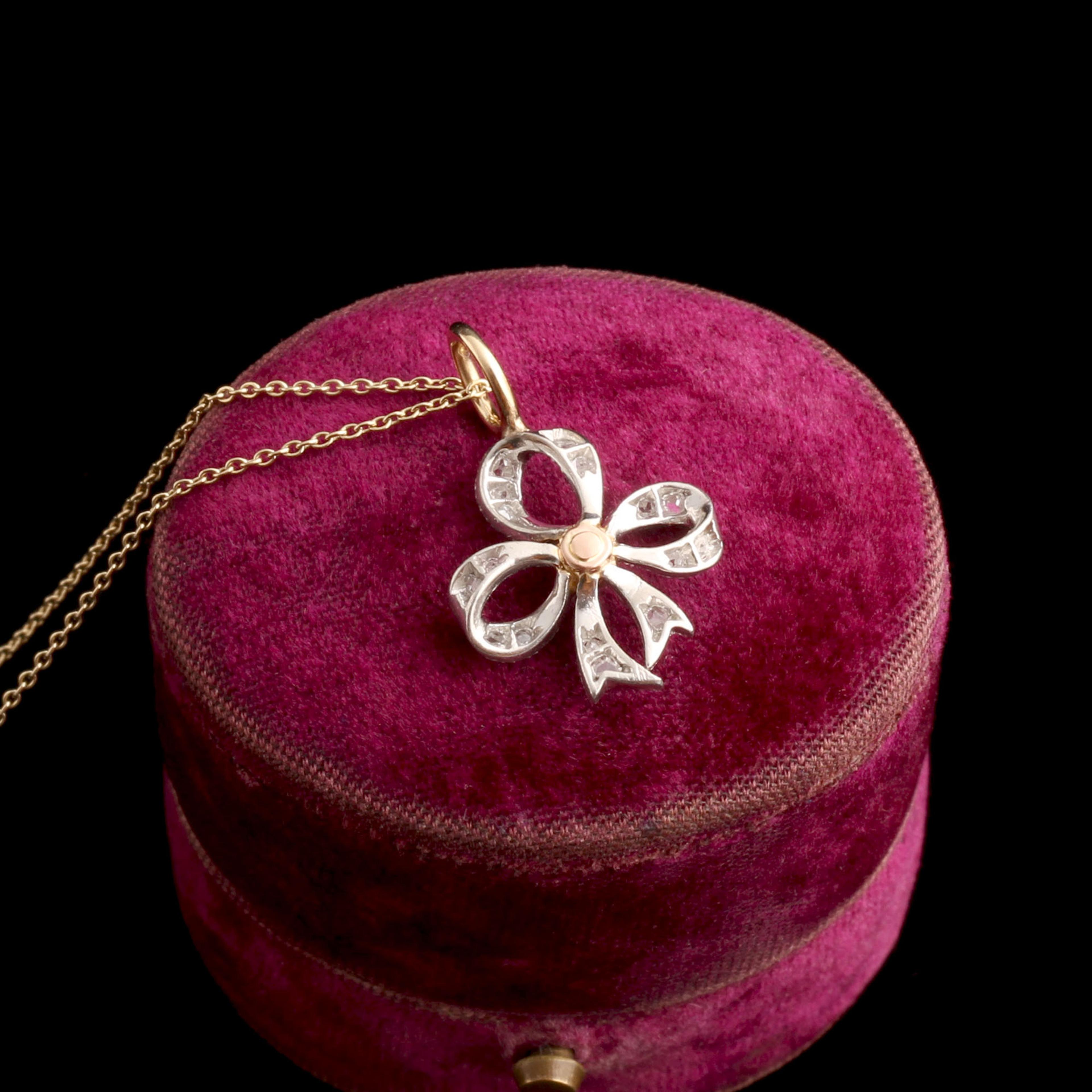 The Victorians and Edwardians loved a little bling at the neck. Stickpins could show what hobbies you were into AND served to secure your cravat/tie/ascot. In the 21st century, the complex neckwear is obsolete and most men (sadly) don't accessorize with jeweled animals. But these little sculptures were designed to be noticed, and many are complex works of craft. They've been reborn as pendants. This one is a bow decorated with an array of diamonds.