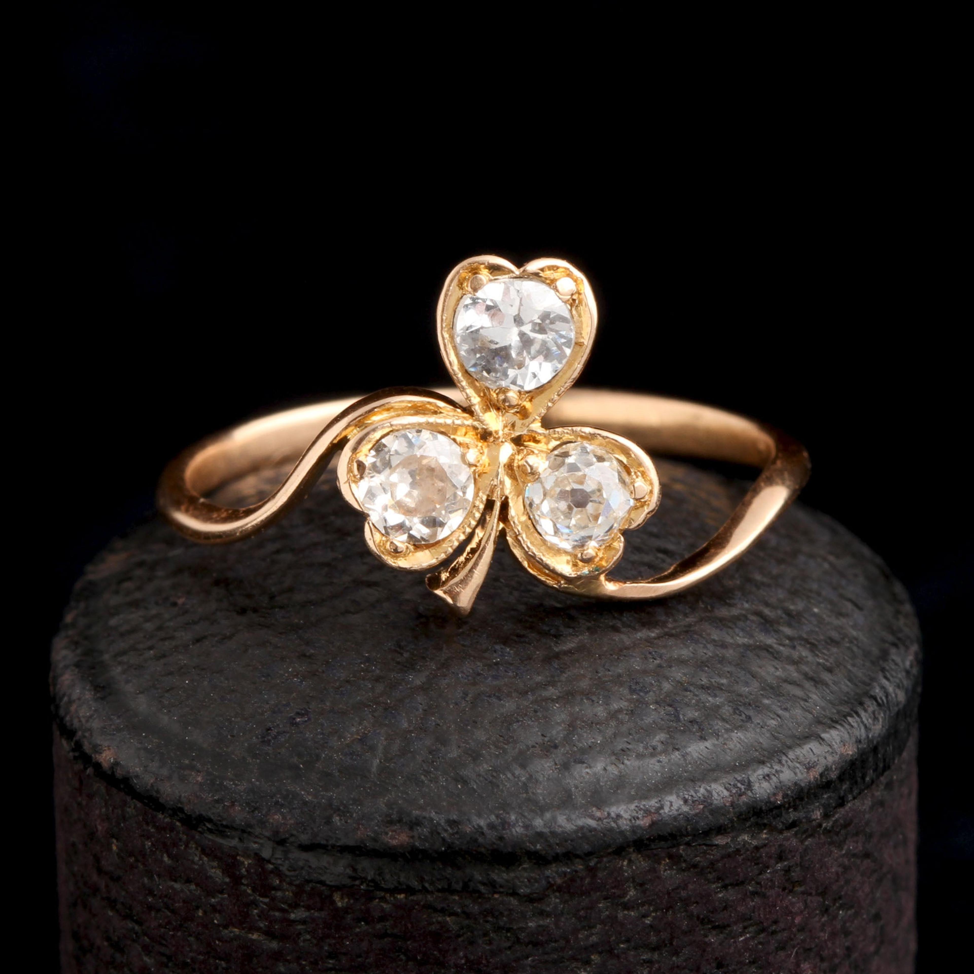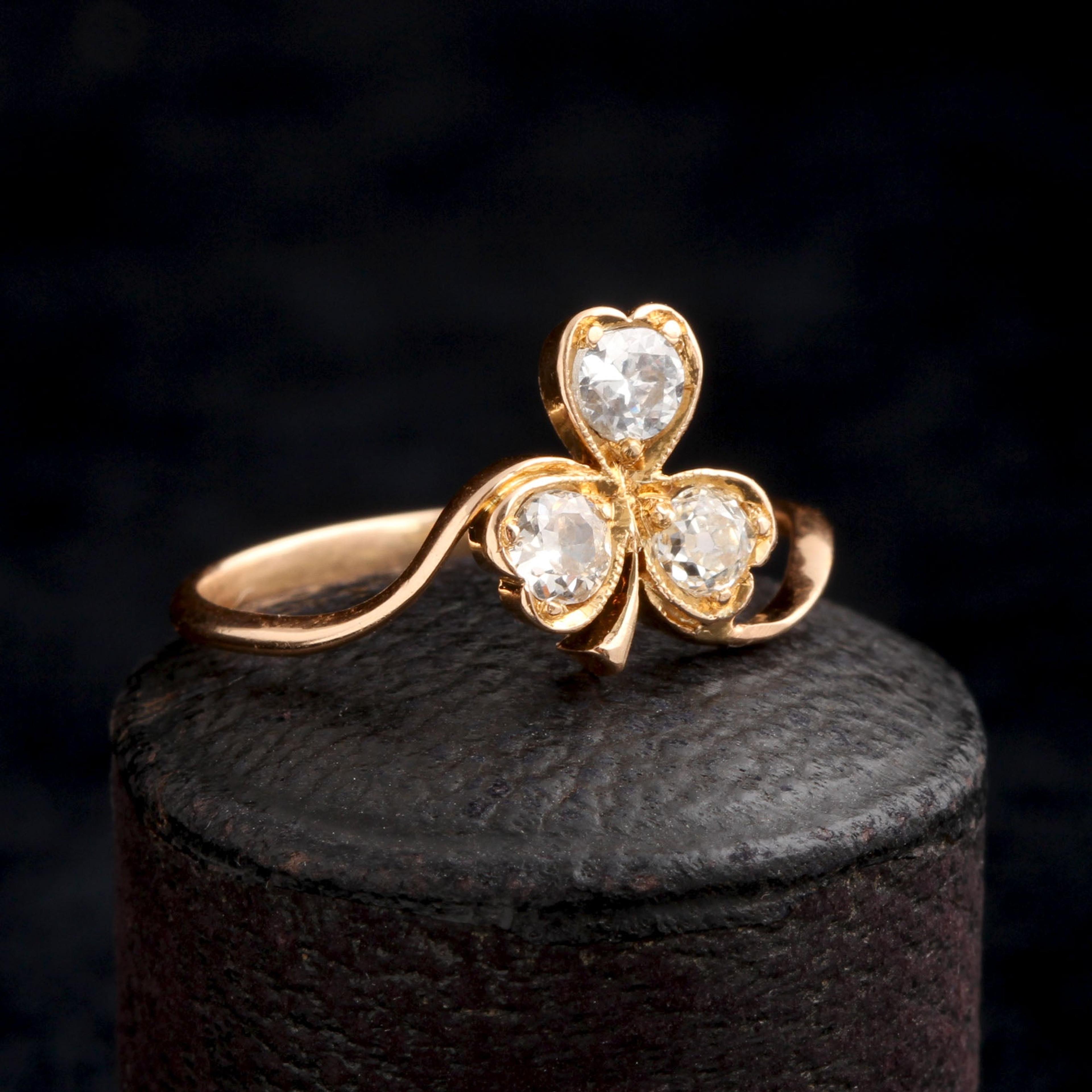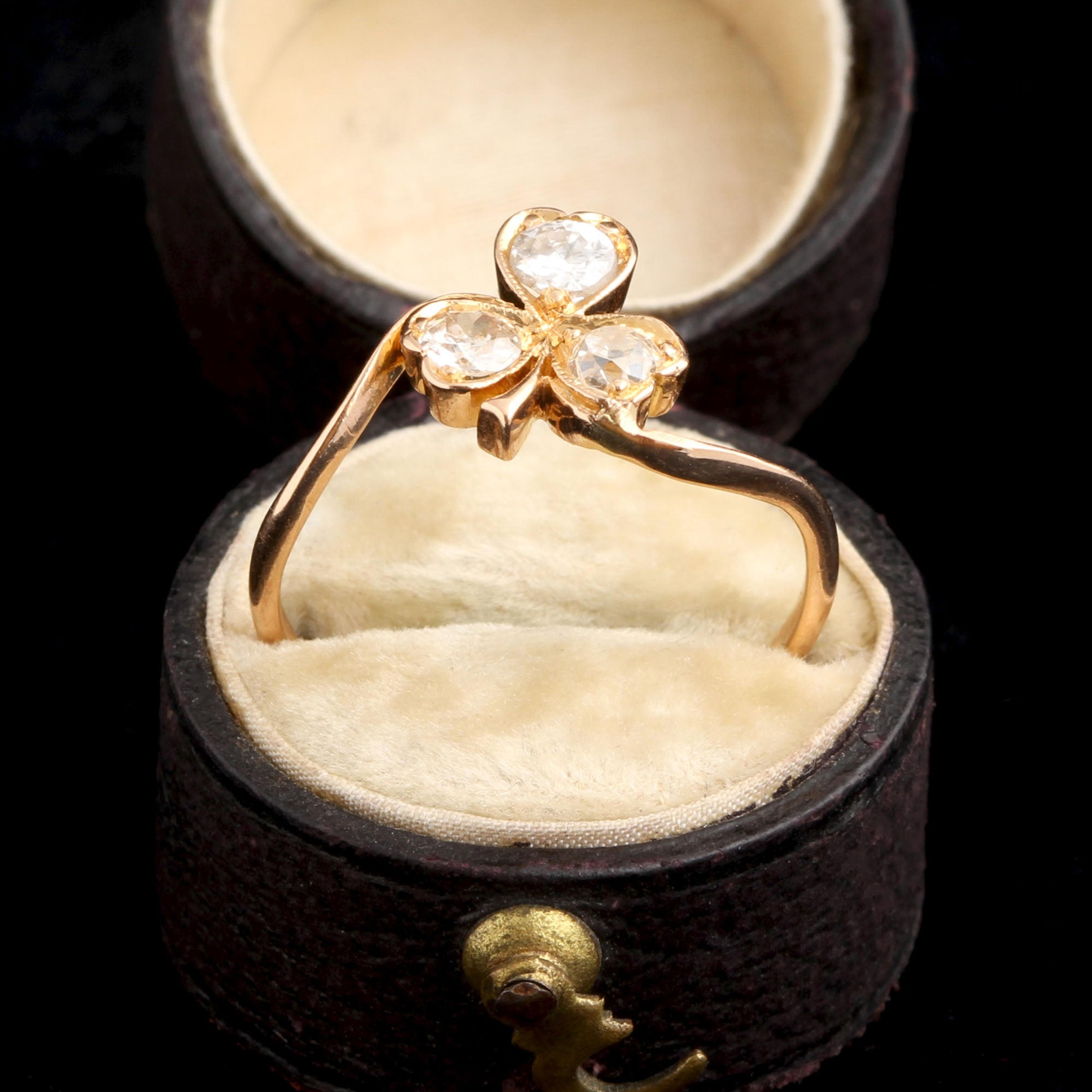 All shamrocks are clovers, but not all clovers are shamrocks. We know the four-leafed variety to be lucky - they're rare genetic mutations. But a normal three-leafed clover is linked to Saint Patrick and the holy trinity; it's also the unofficial symbol of Ireland. Here, an early 20th century ring holds a sparkly diamond in each heart-shaped flower setting.