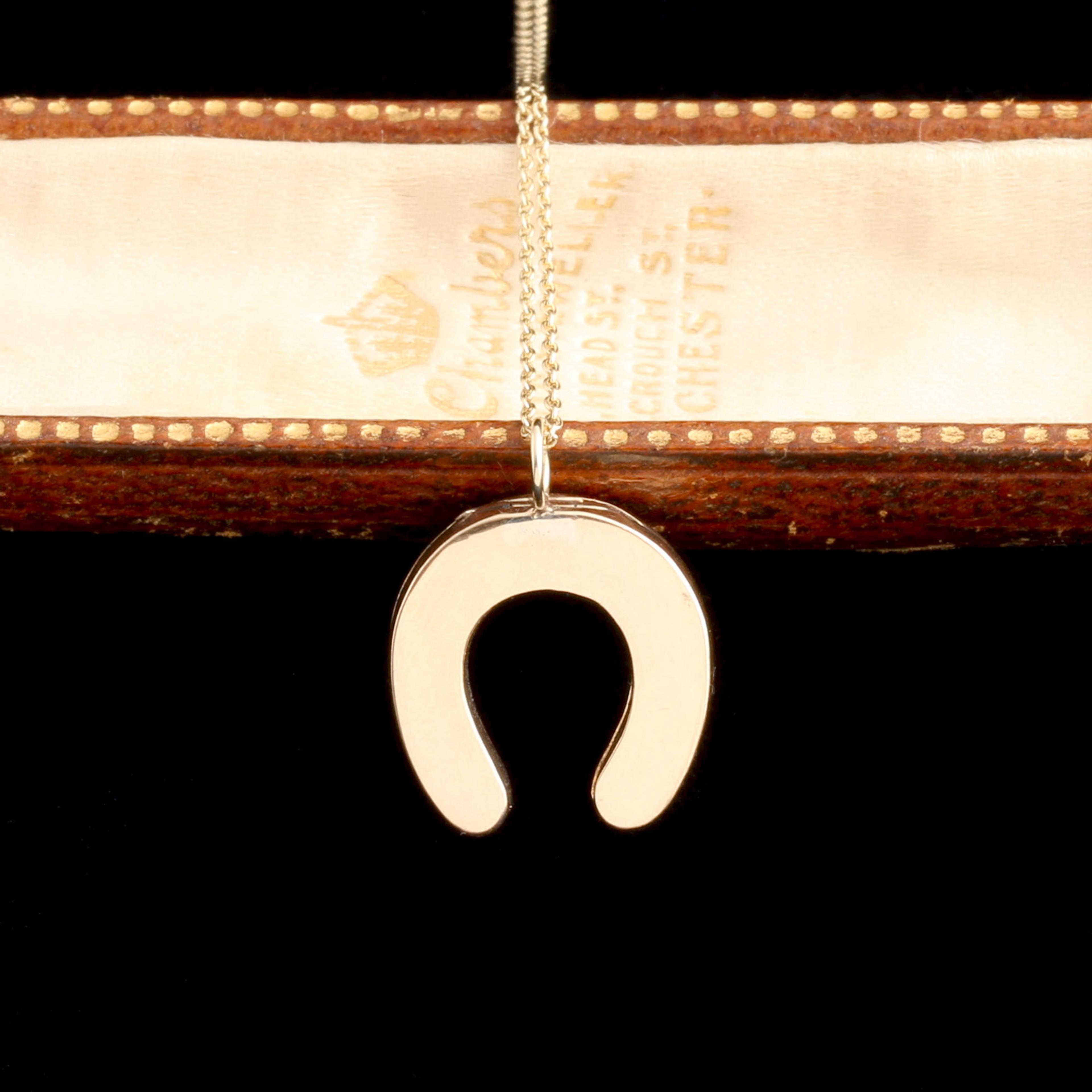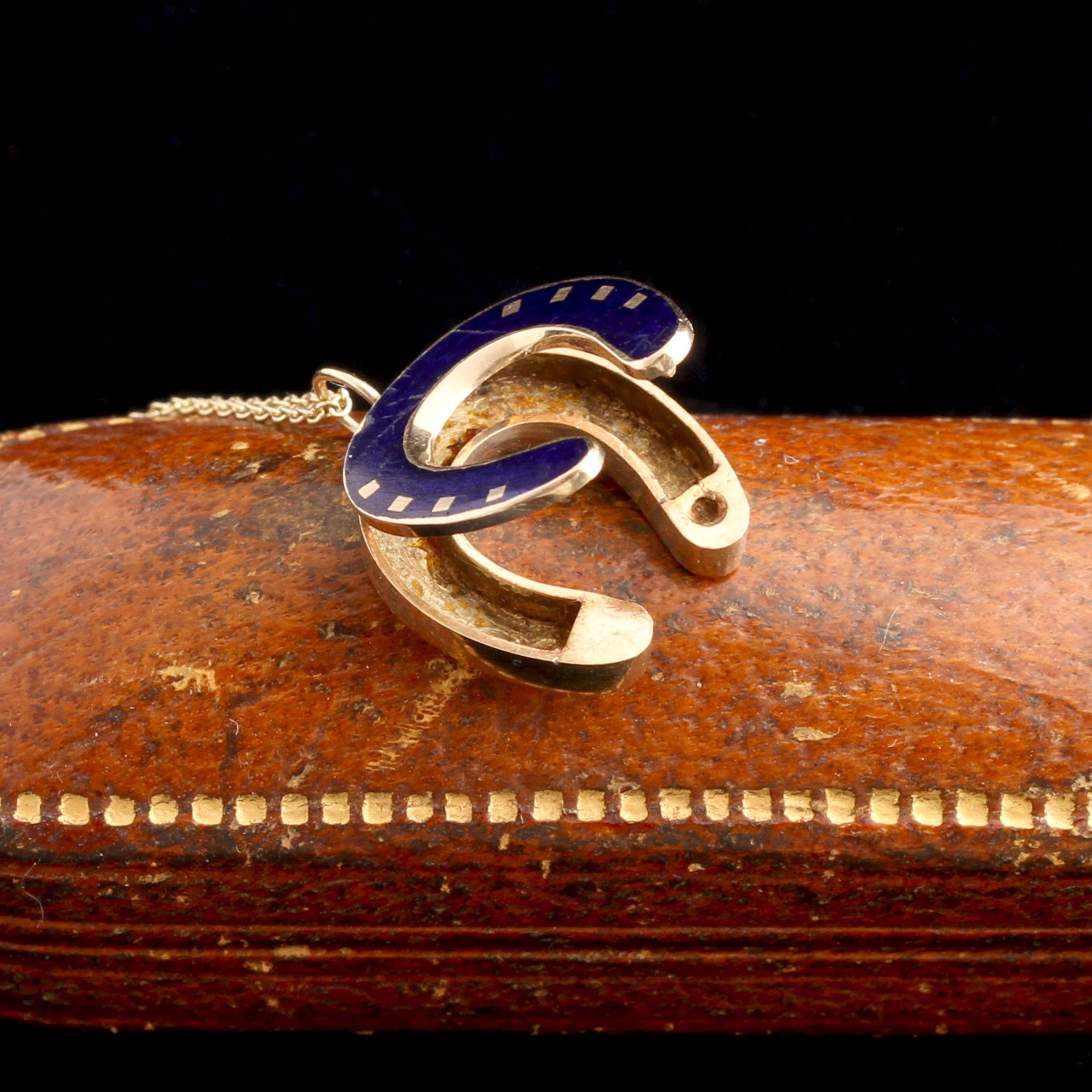 Formerly the head of a stickpin, we've converted this usual enamel horseshoe into a pendant. Not just a charm, this token of good luck is also a U-shaped locket! Hangs on a new 18" gold chain.