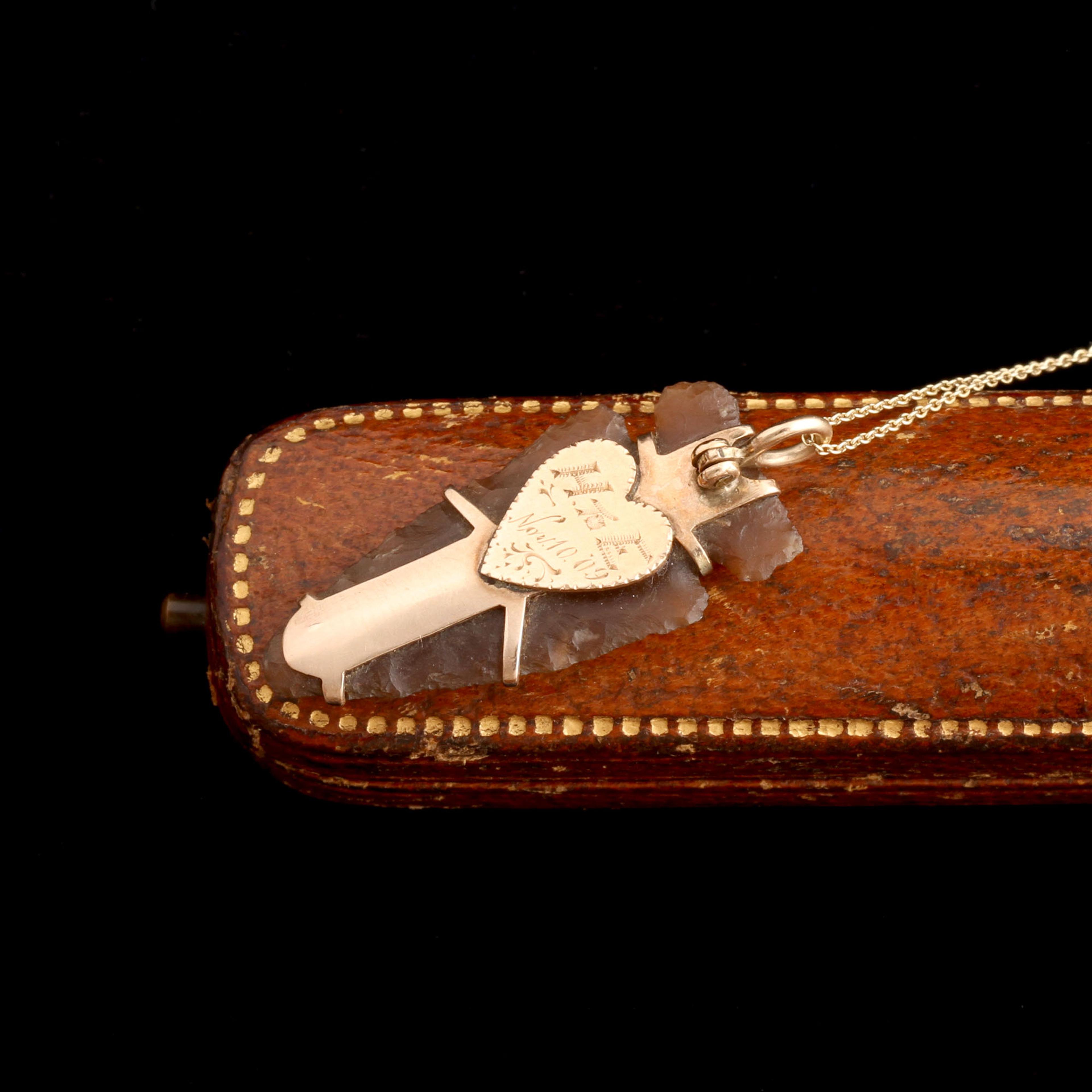 I once found an arrowhead on the ground, and the feeling when I picked it up, knowing I was first person to touch it in centuries? Electrifying. It still sits in my jewelry box next to my diamonds. The same feeling must have motivated H in 1909, who had this spear point mounted in gold and engraved to E. A special memory, a special object.