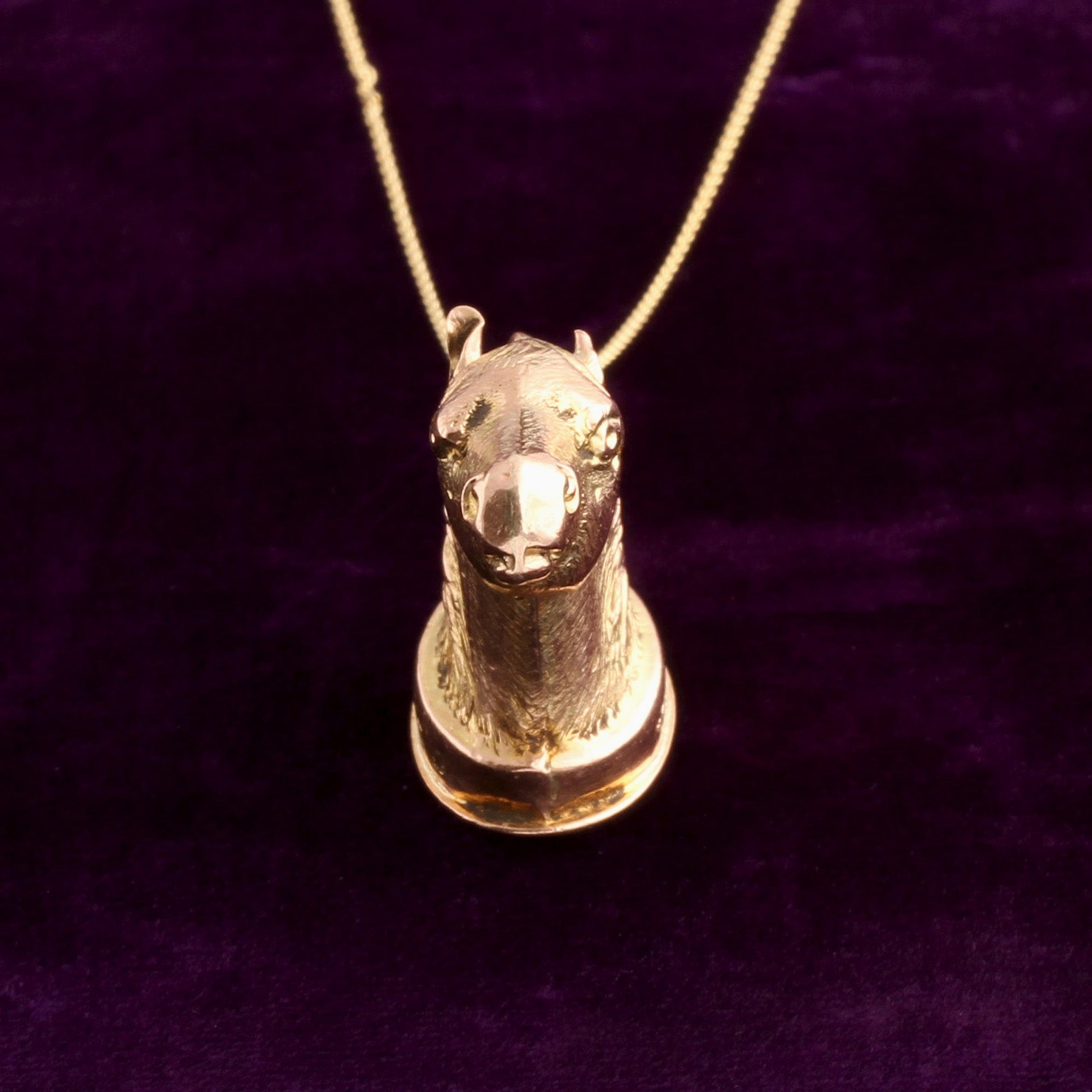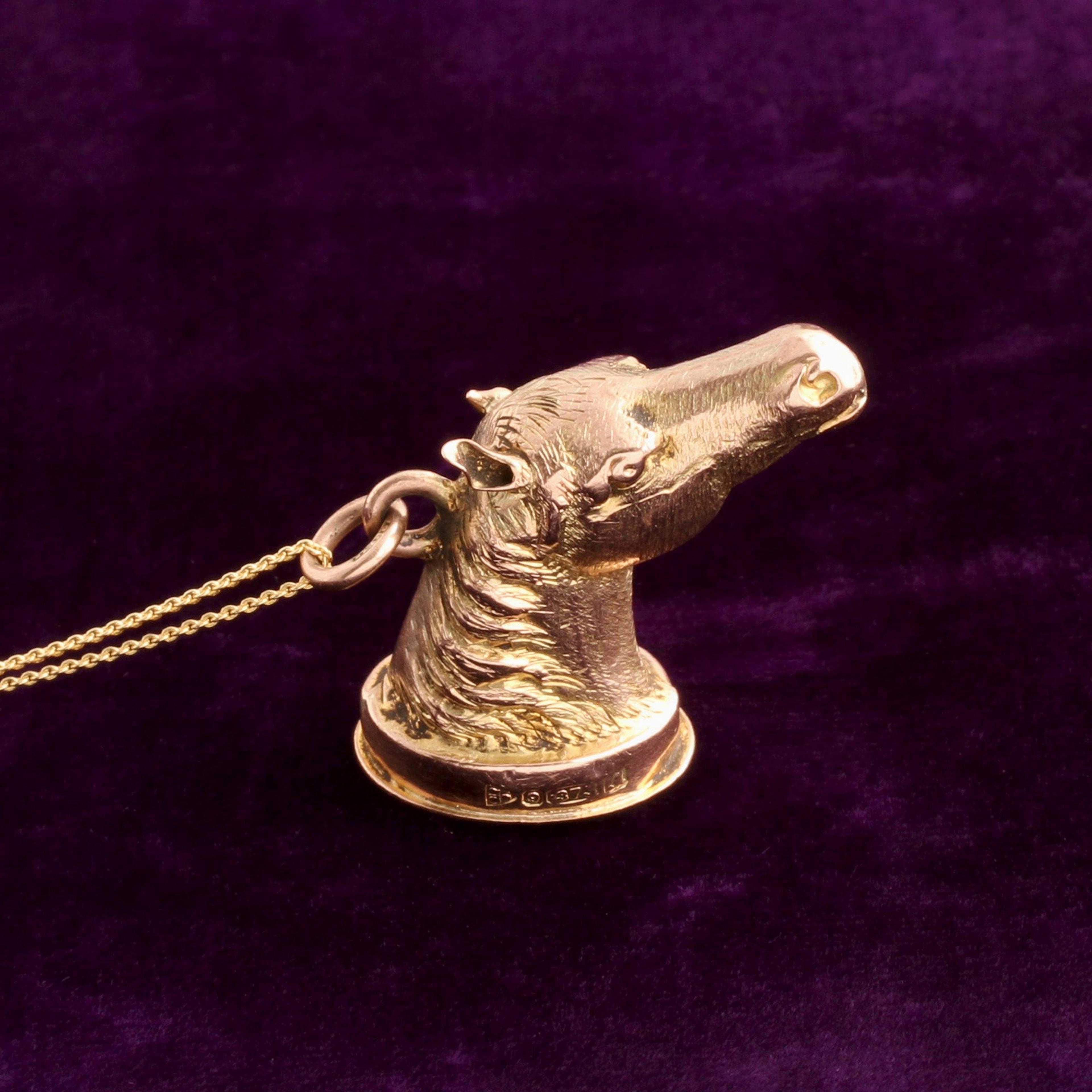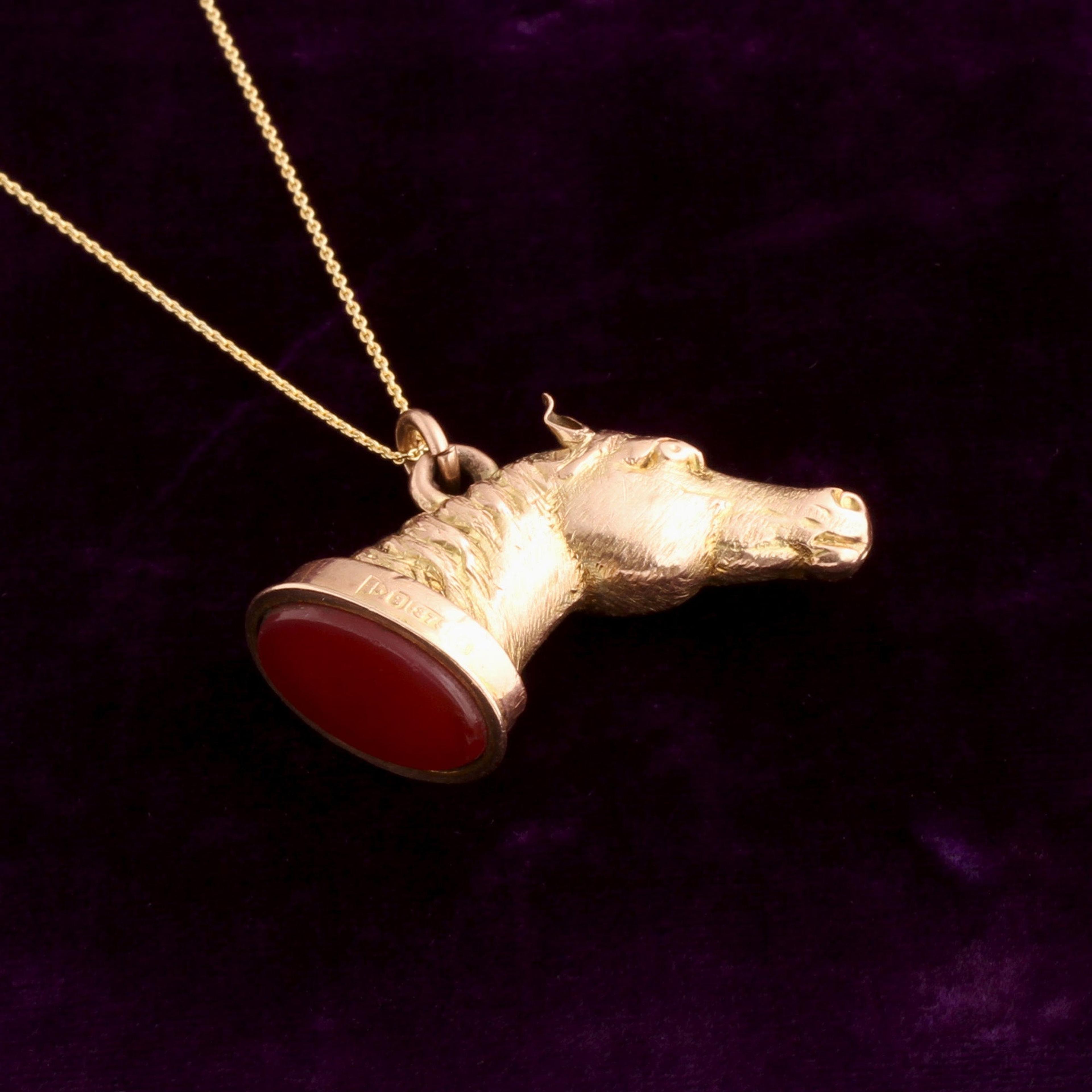 An Edwardian gold horse head fob with a red glass base. British hallmarks stamped along the collar tell us this majestic equine was assayed in Chester in the year 1912.