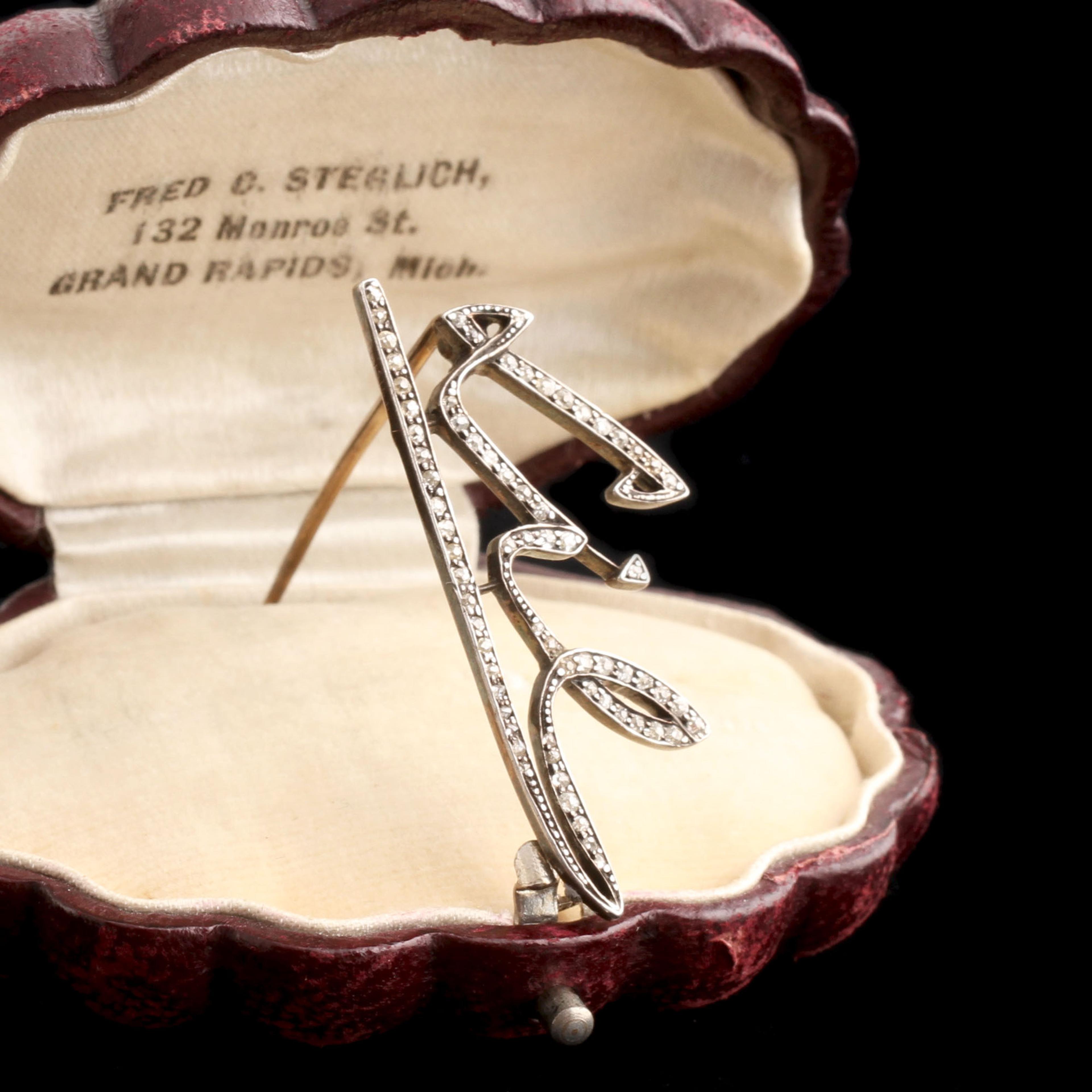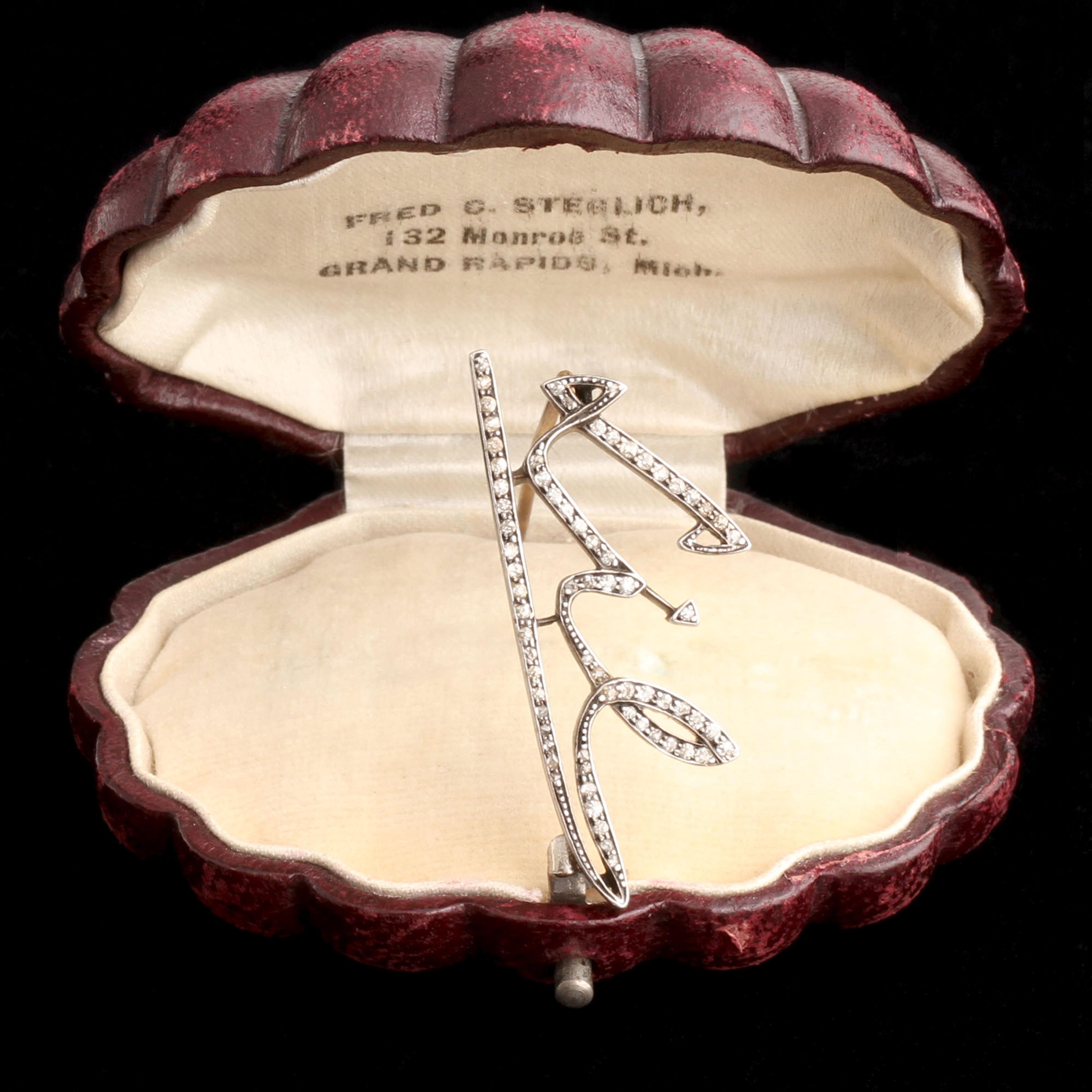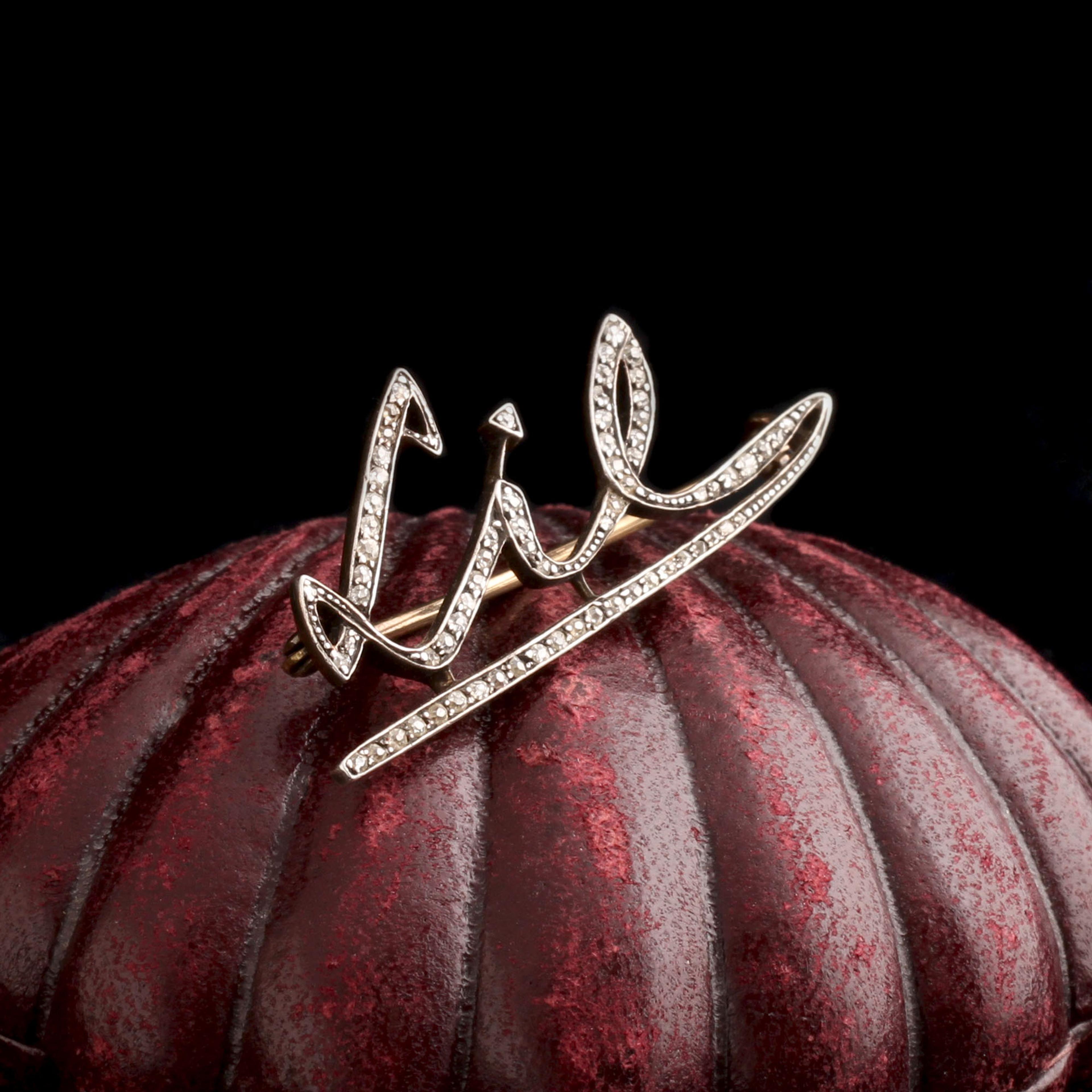 This Edwardian pin technically says "Lil", a nickname for Lily or Lillian. Or a term of endearment for someone small. We initially read it as "LIE", which is pretty great too. Seventy mixed rose cut and old European cut diamonds are individually fitted into custom settings to trace the curves of a handwritten name. So intimate.