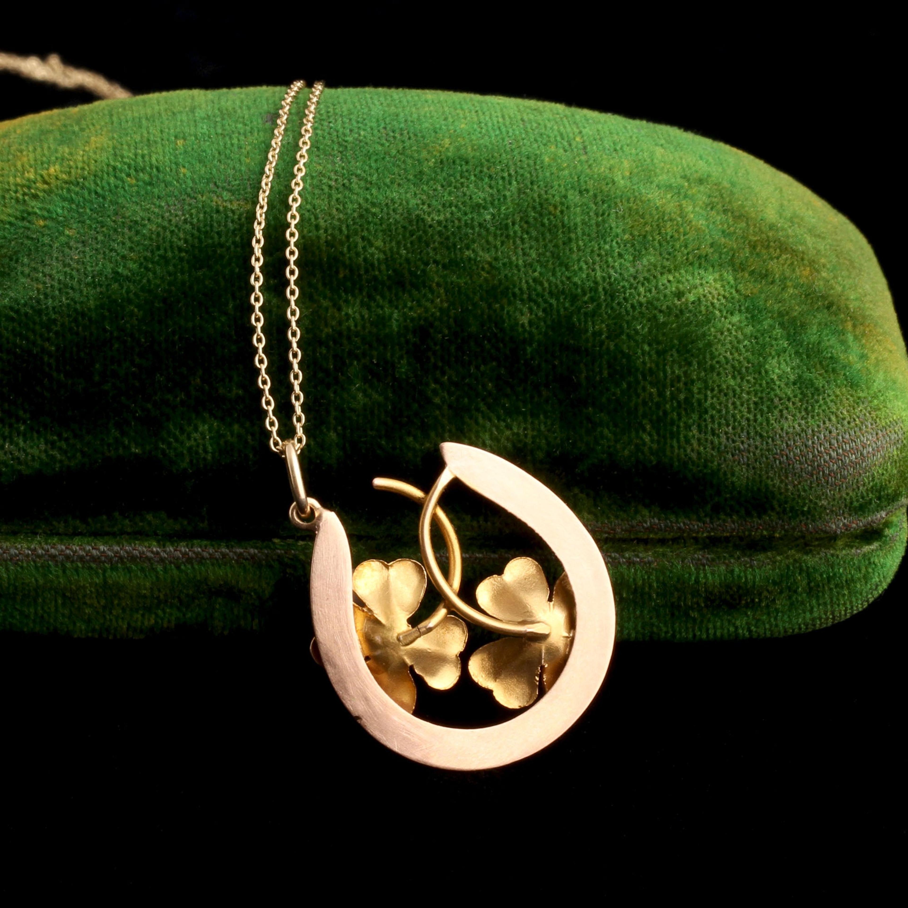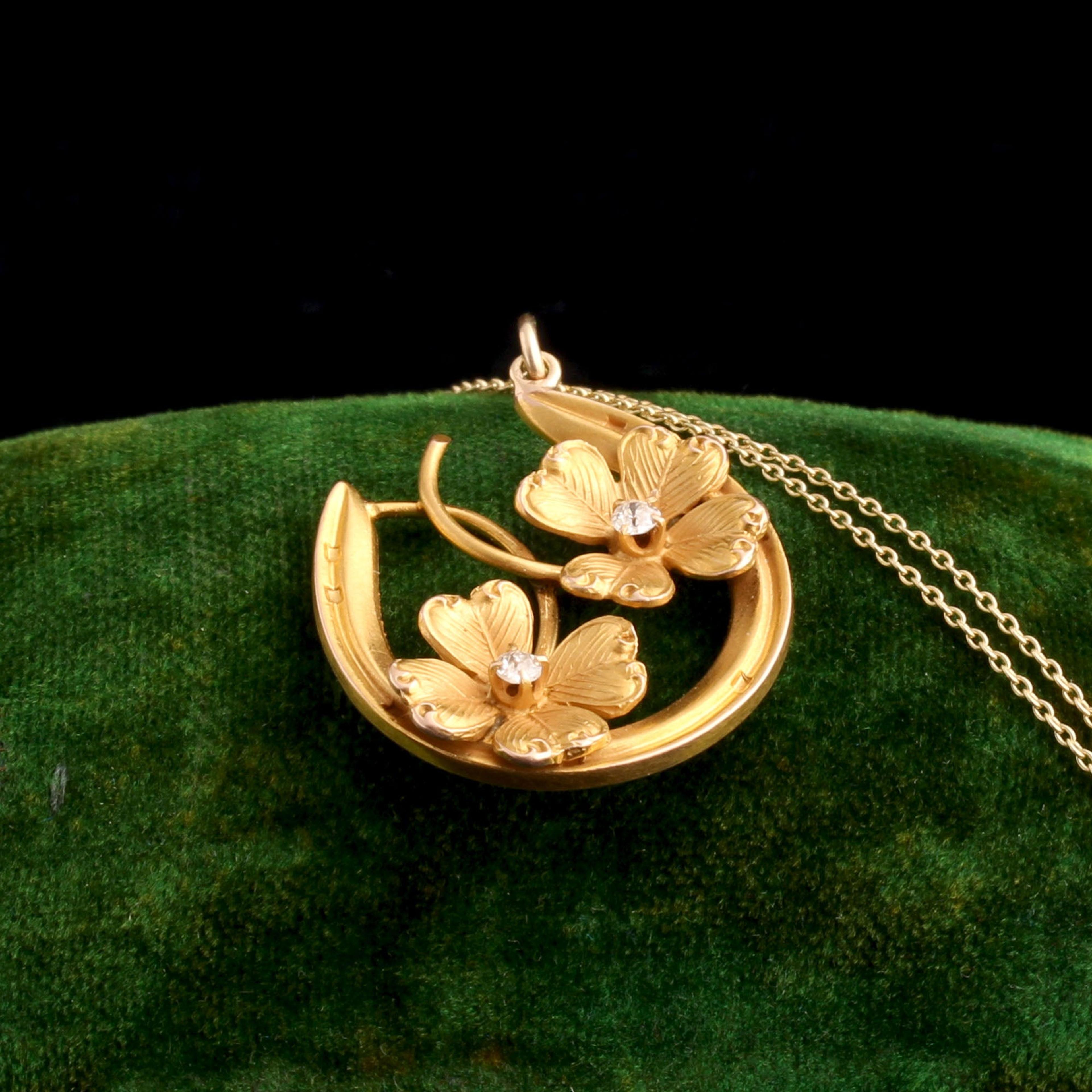 An Edwardian gold horseshoe pendant overlaid with a pair of diamond-set four leaf clovers. Three times lucky. One a new 18" 14k gold chain.