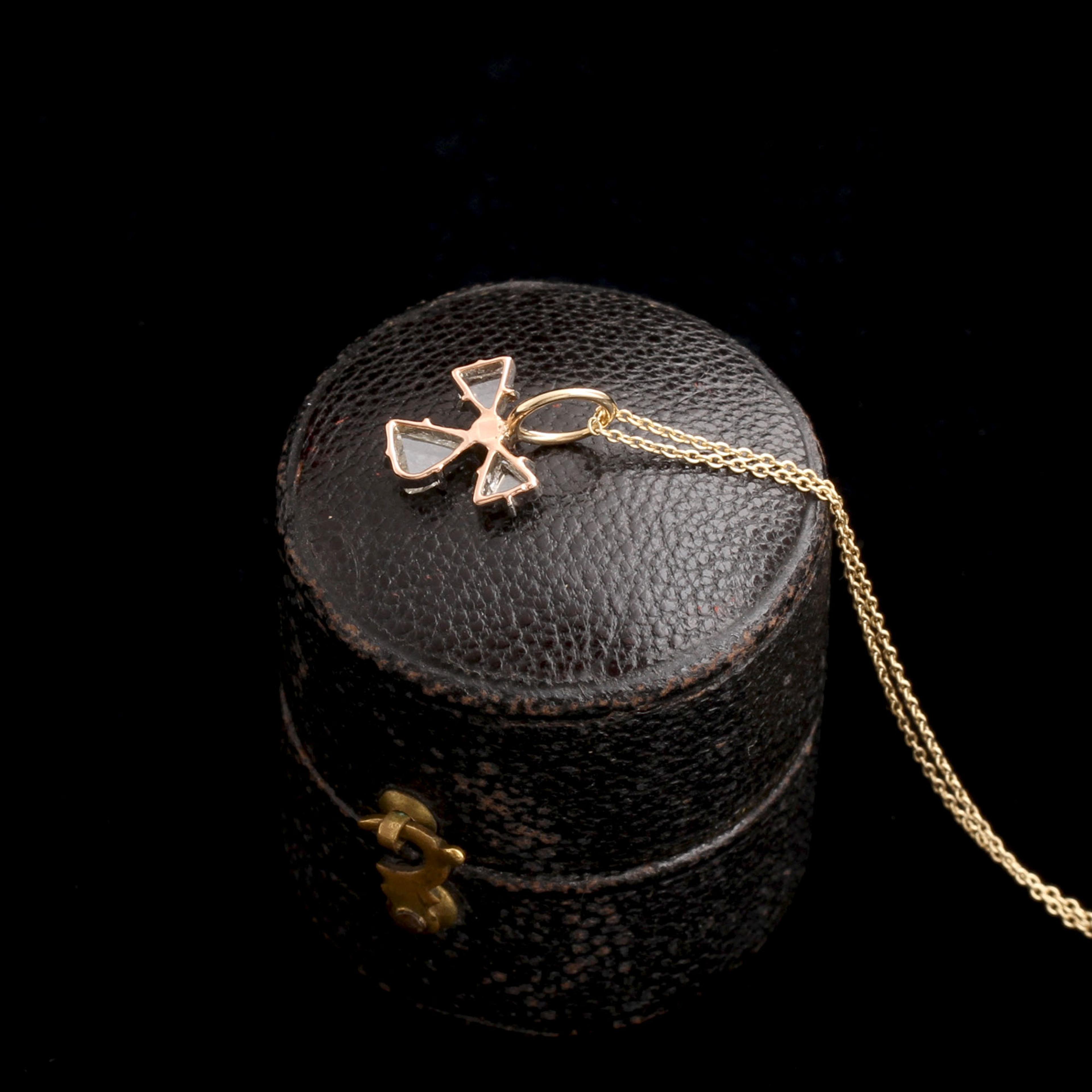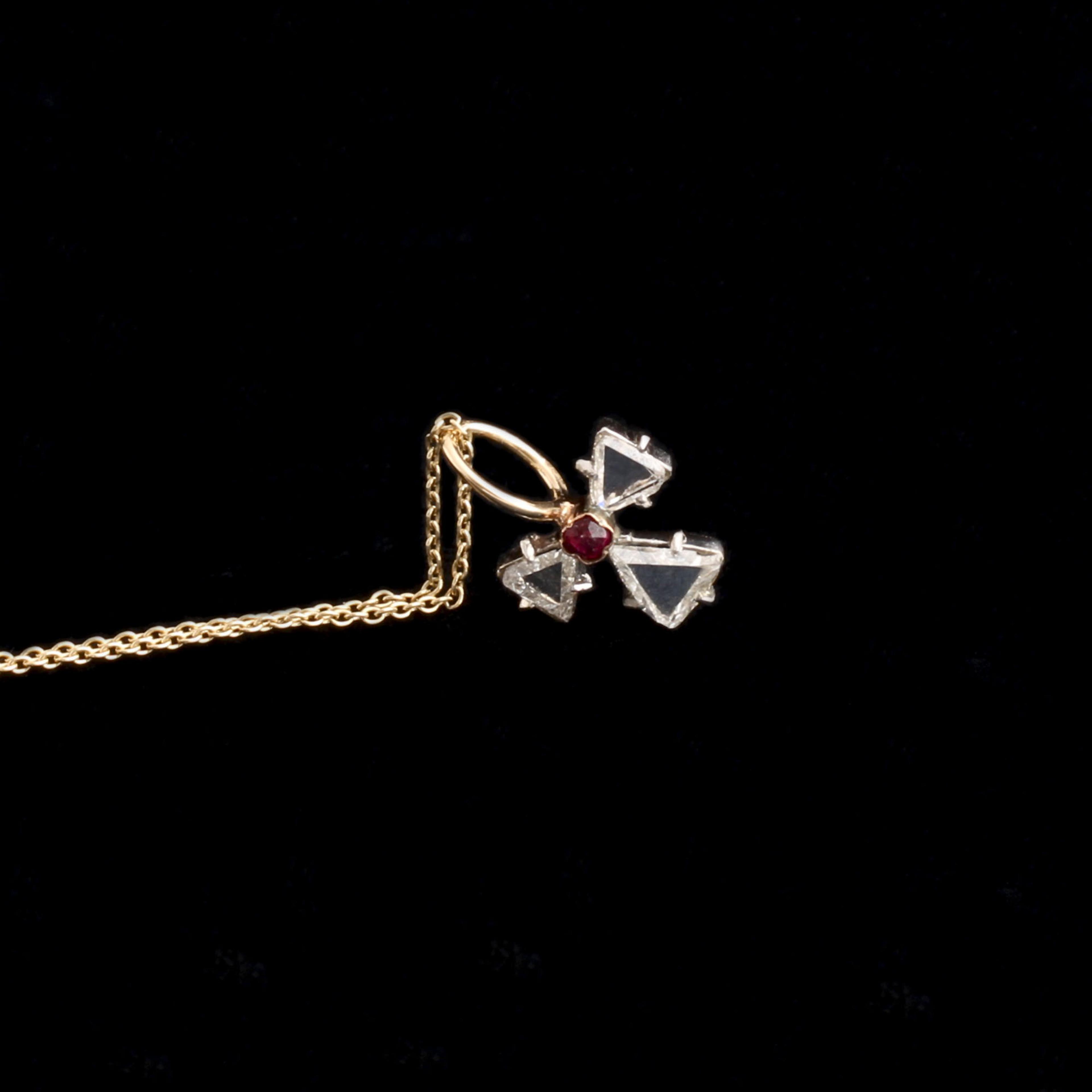 Formerly a stickpin, we've converted this Edwardian era bauble into a pendant. Arranged in a sort of clover motif, the pendant features a trio of diamonds - note that the diamonds are triangular in shape, they were all most likely cut from macle crystals - and a single red spinel. On a new 18" 14k gold chain.