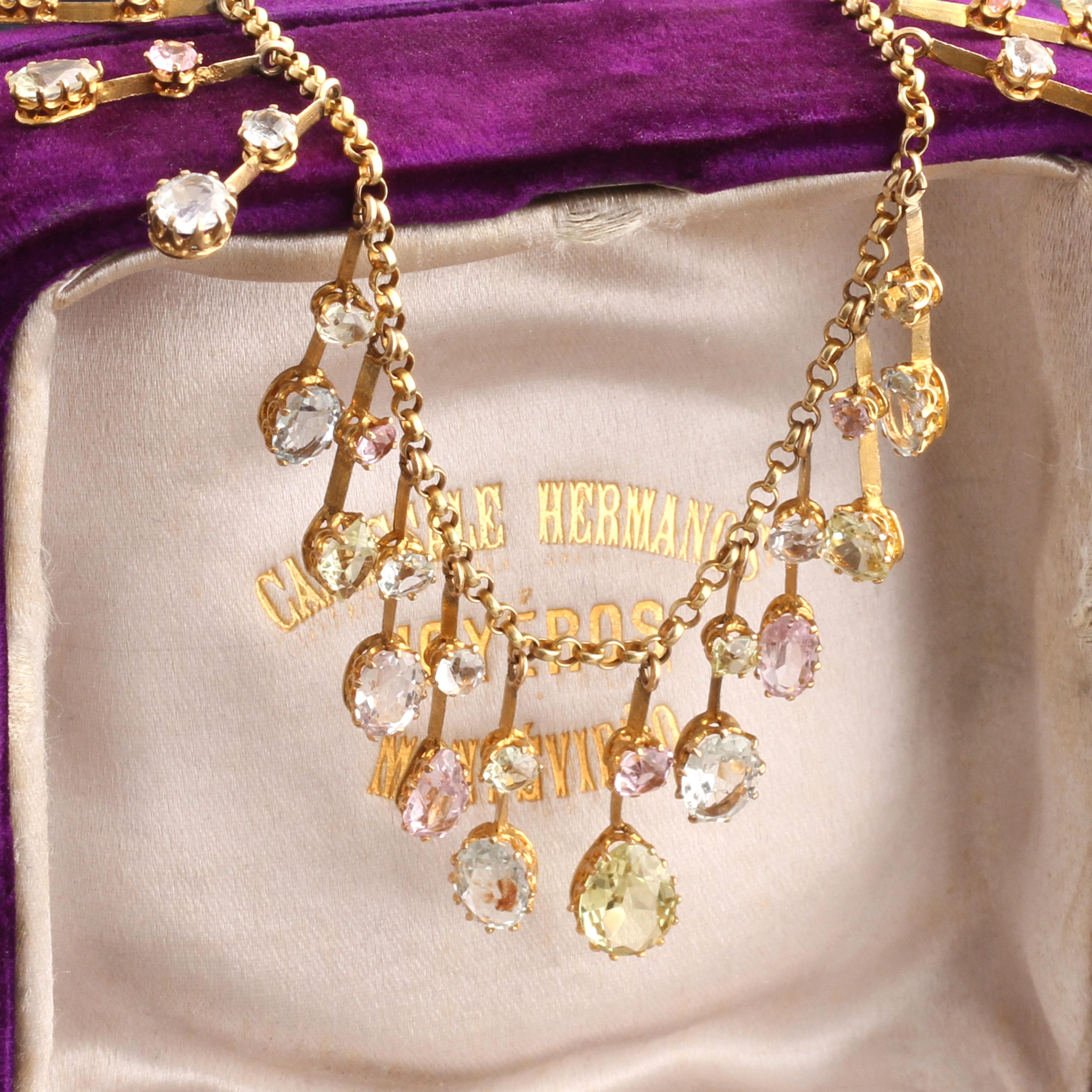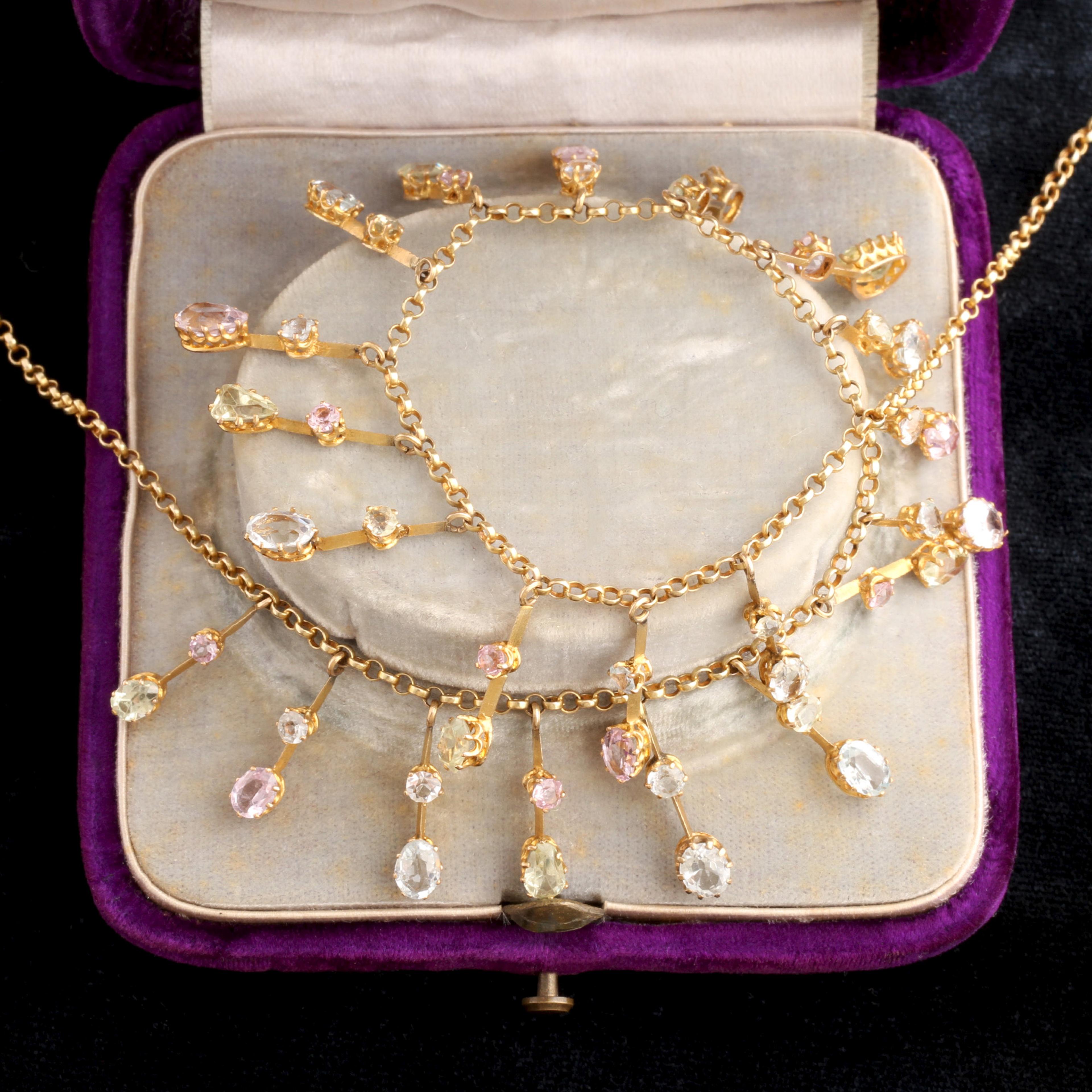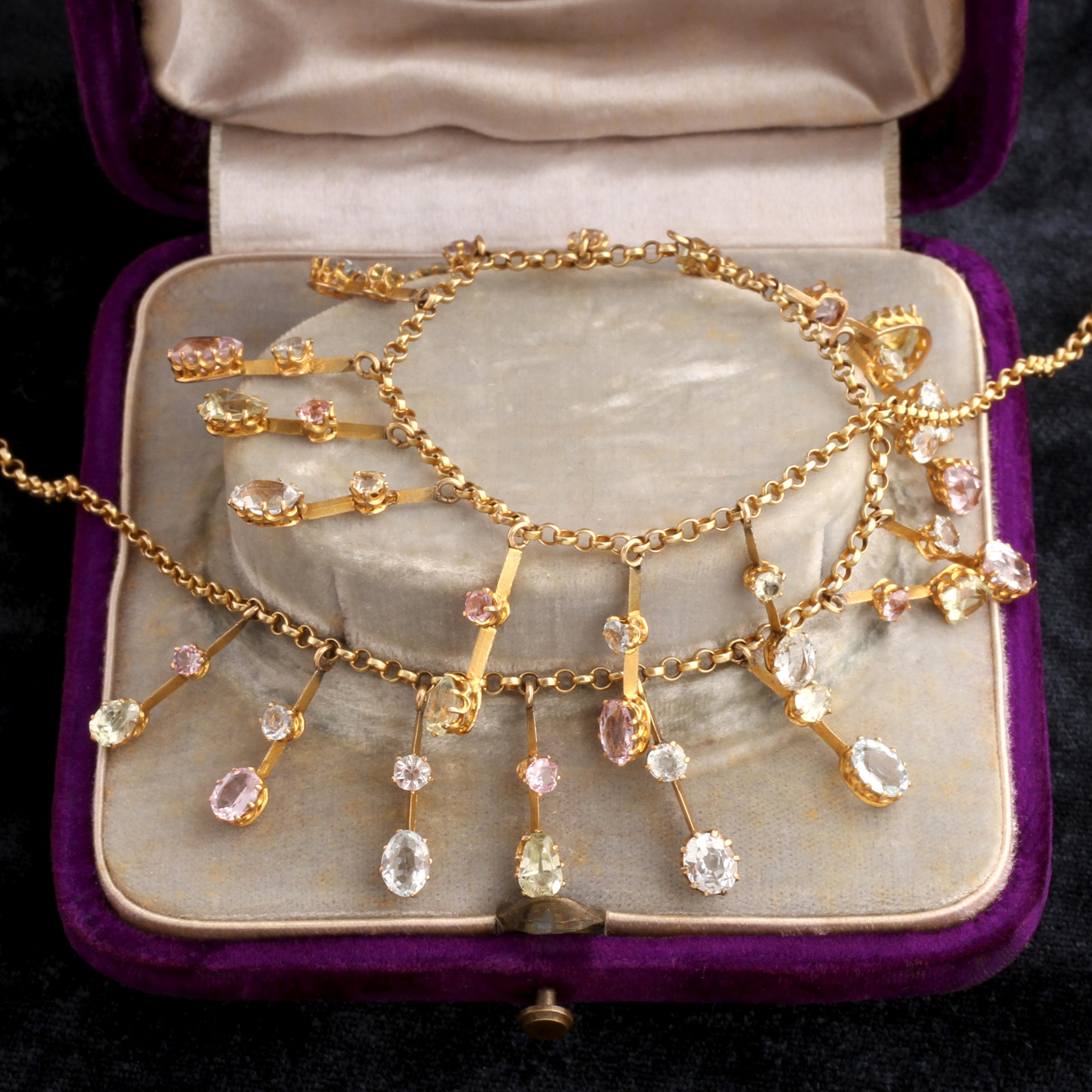 This Edwardian fringe necklace is fashioned in gold with a (subtle) riot of color in the pastel tones of pink and yellow topaz and aquamarine. The necklace is of beautiful quality, with supple links and a pleasing weight.