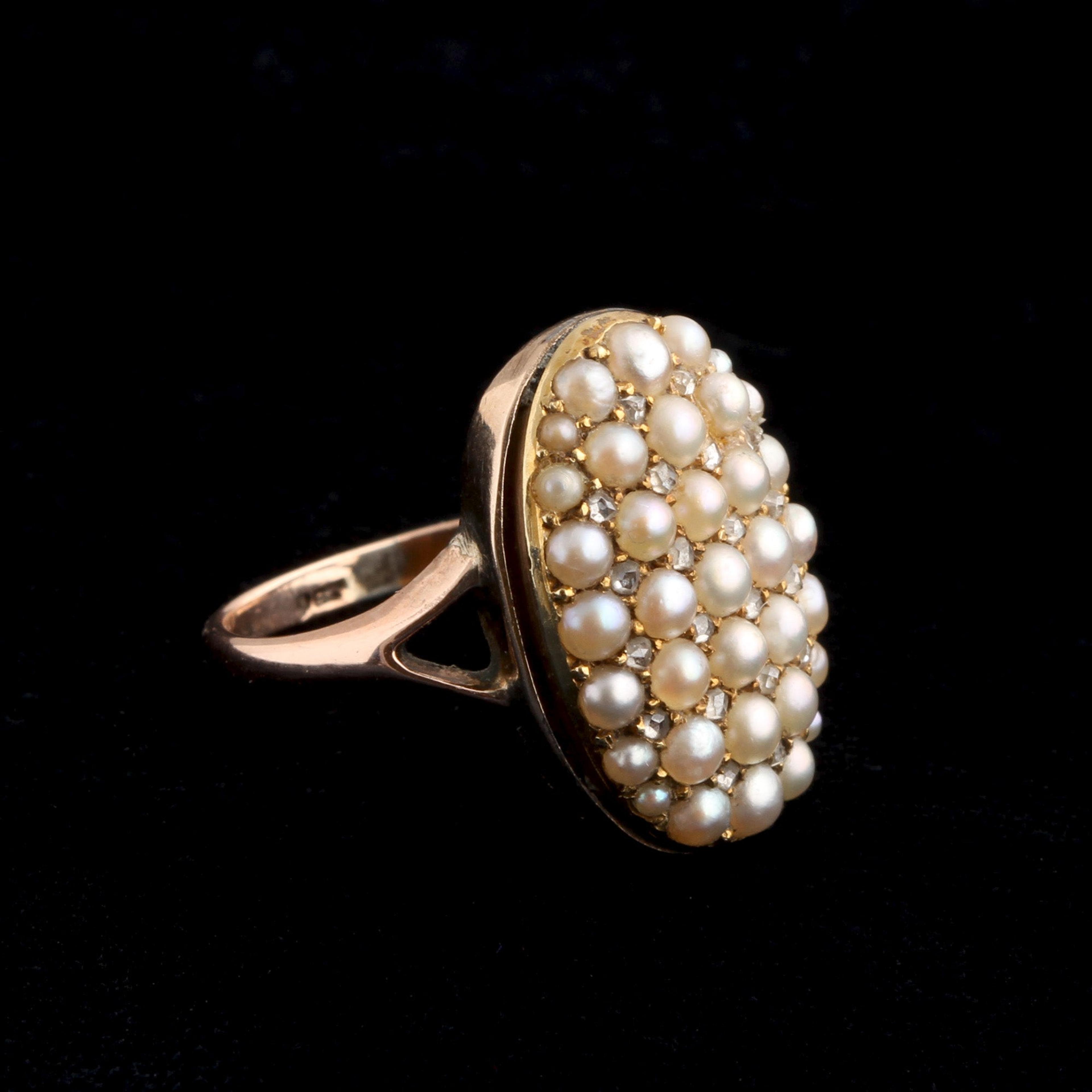 9k gold (marked), 35 seed pearls of varying sizes, 20 1 mm rose cut diamonds