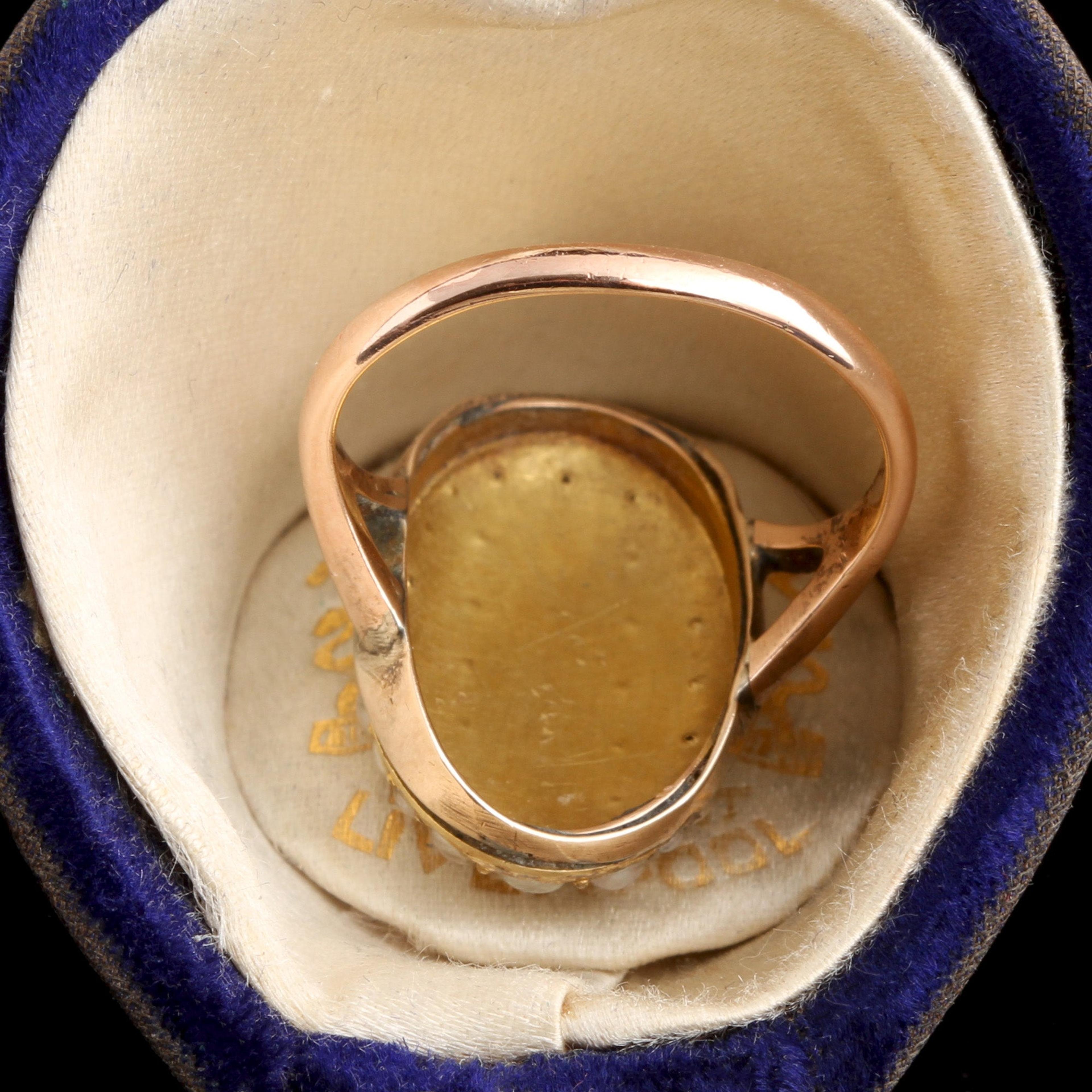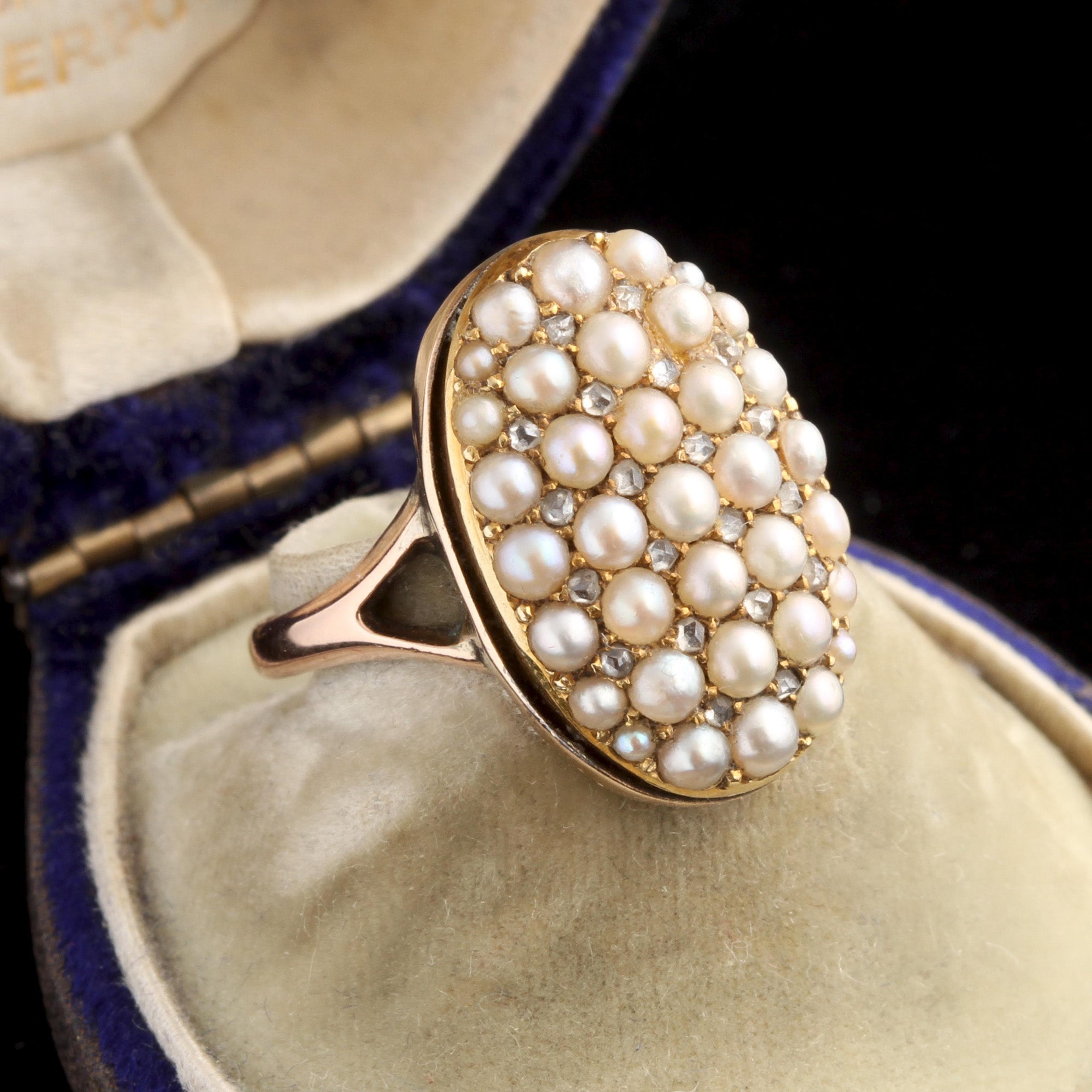 “Pavé” is an elegant French word for something very literal—it simply means that gemstones are “paved” onto a surface. The French pronunciation sounds much nicer that the English, although a jeweler would work the surface not unlike a bricklayer, setting precious stones in small, pre-made cavities until the entire surface was covered. In this Edwardian cocktail ring, the pavé style of setting makes for an incredible visual effect with tiny rose cut diamonds twinkling between luminous seed pearls.