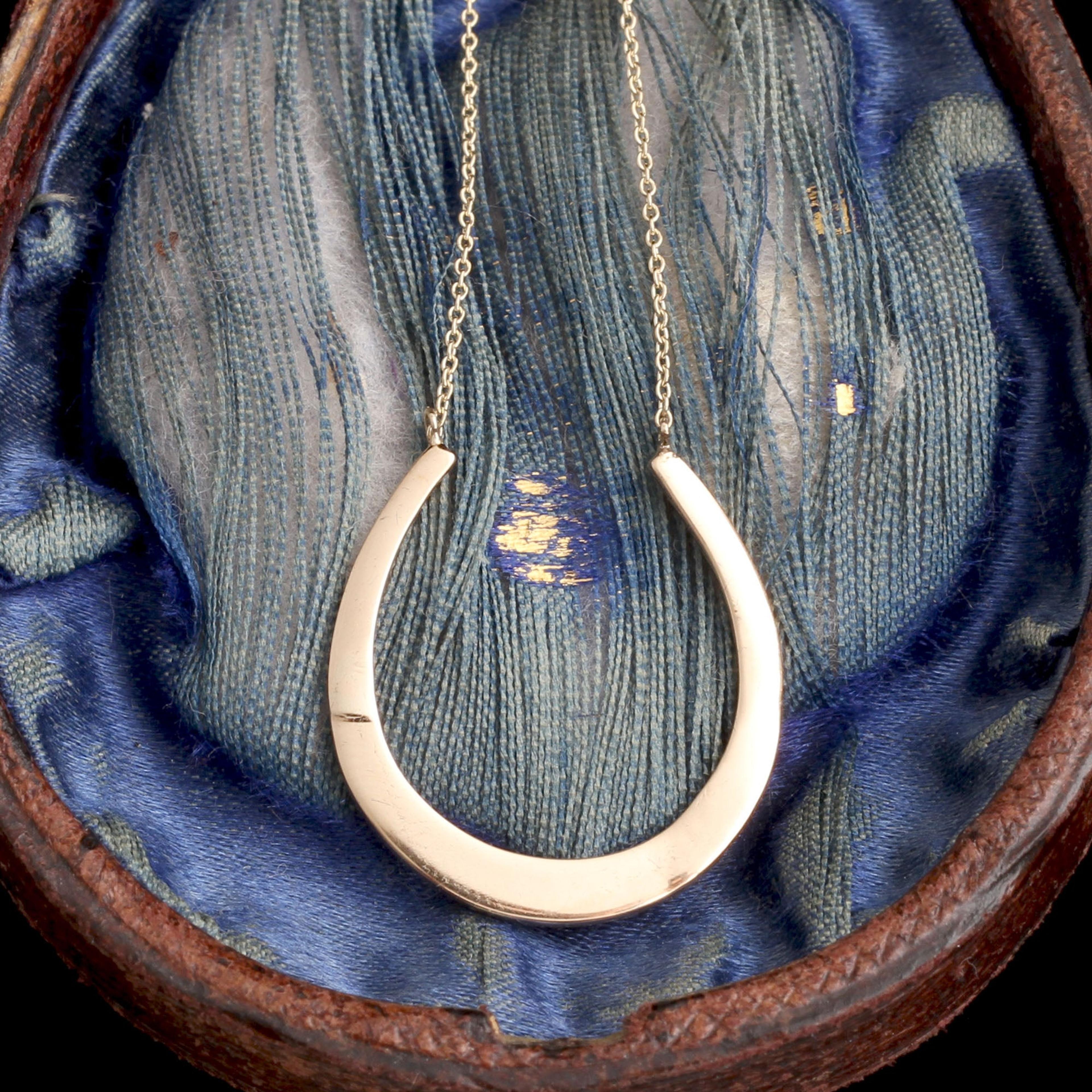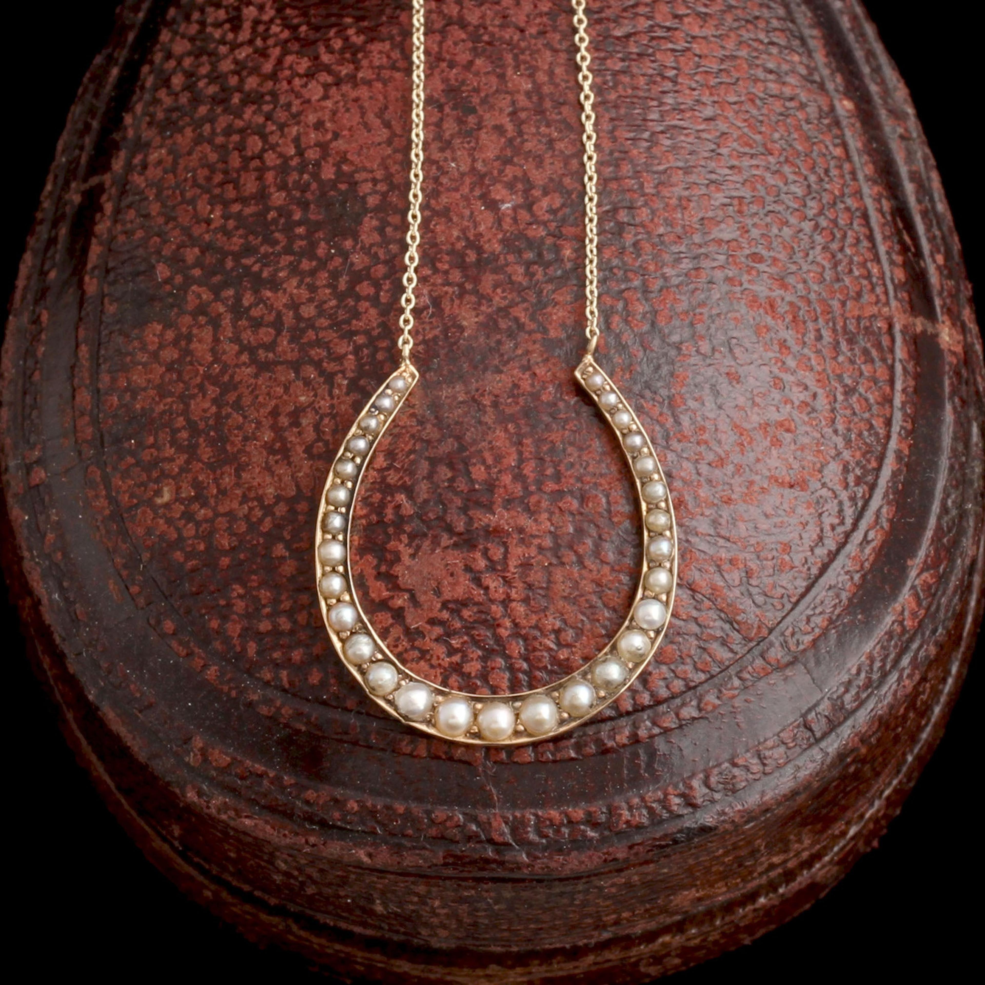 A slim row of graduated pearls create an elegant horseshoe. Nice proportions; I would thread more charms onto it and let them hang off the "U".