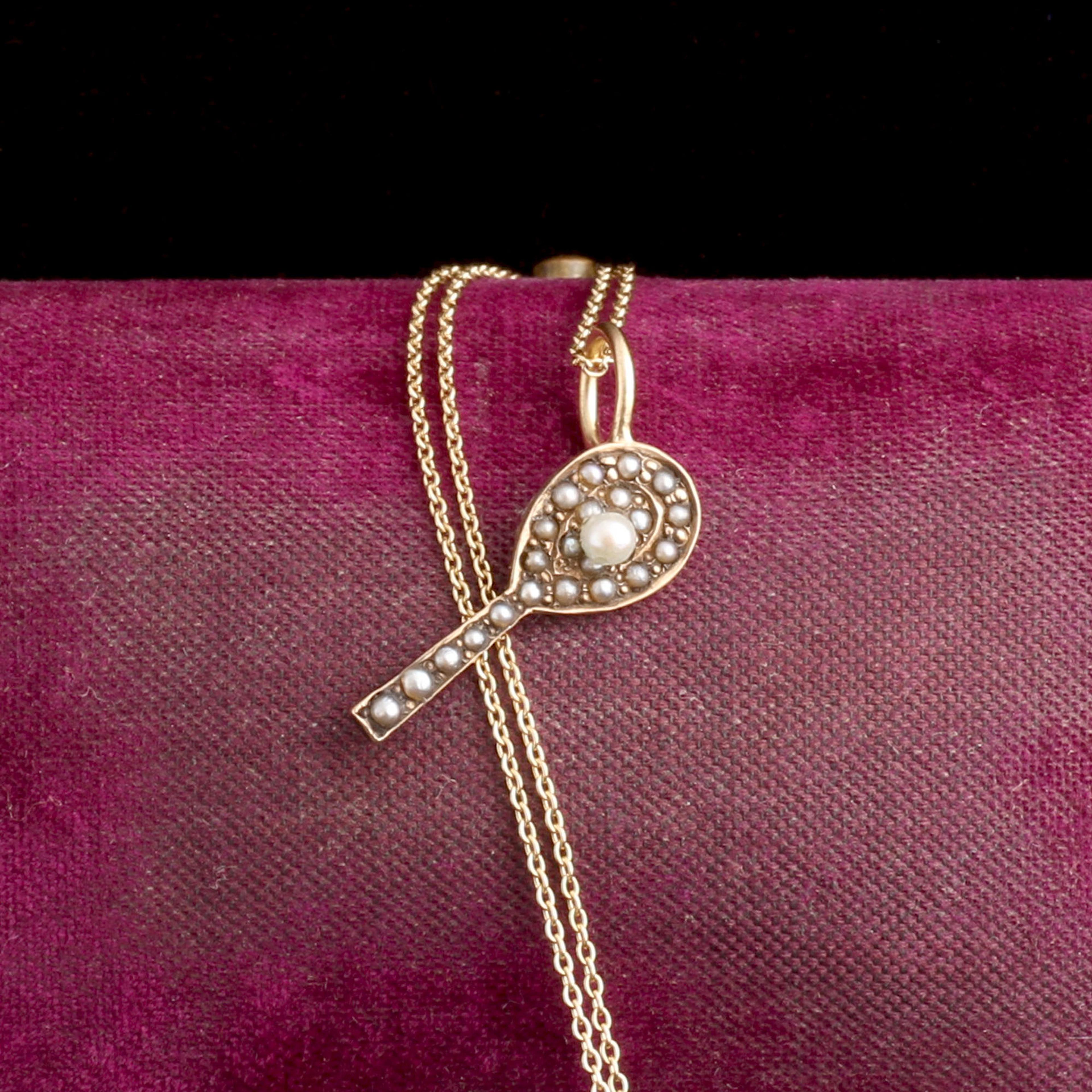 The Victorians and Edwardians loved a little bling at the neck. Stickpins could show what hobbies you were into AND served to secure your cravat/tie/ascot. In the 21st century, the complex neckwear is obsolete and most men (sadly) don't accessorize with jeweled animals. But these little sculptures were designed to be noticed, and many are complex works of craft. They've been reborn as pendants. This one is a pearl-studded tennis (or badminton?) racket.