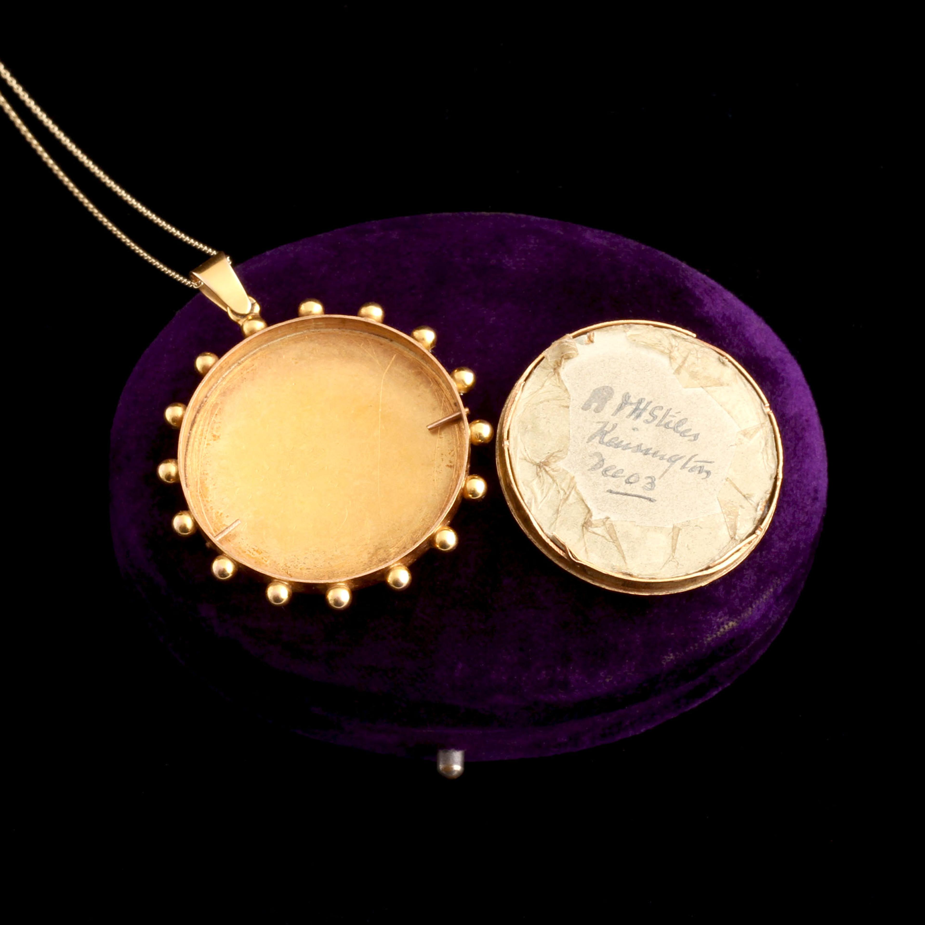 WHO WAS "A Stiles Kensington?" Apparently this blonde, blue-eyed woman with a green stone necklace. Keep her hand-tinted portrait inside or add your own loved one's pic. The paper is dated 1903 but the 15k gold locket looks to us to be older, maybe made in the 1870s.