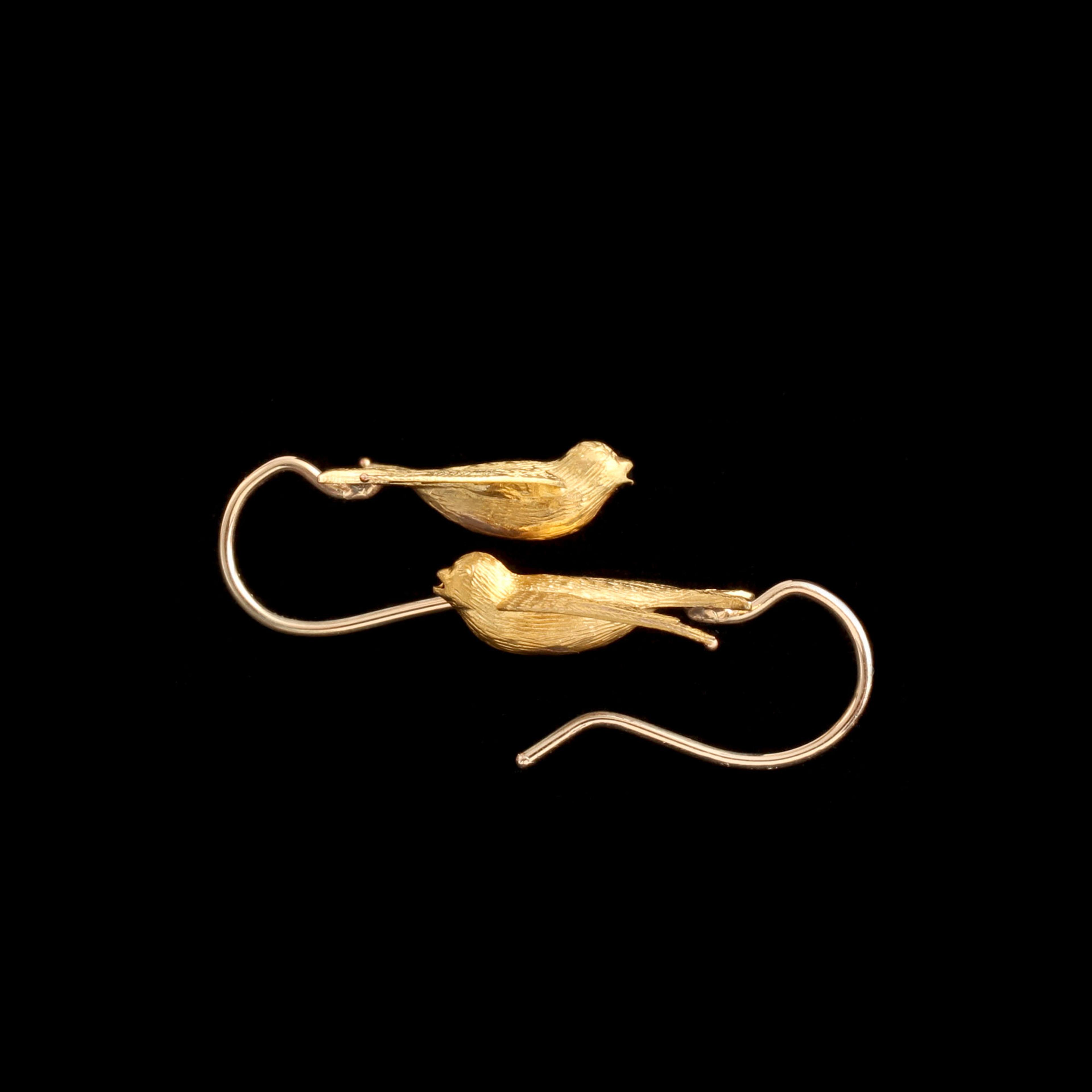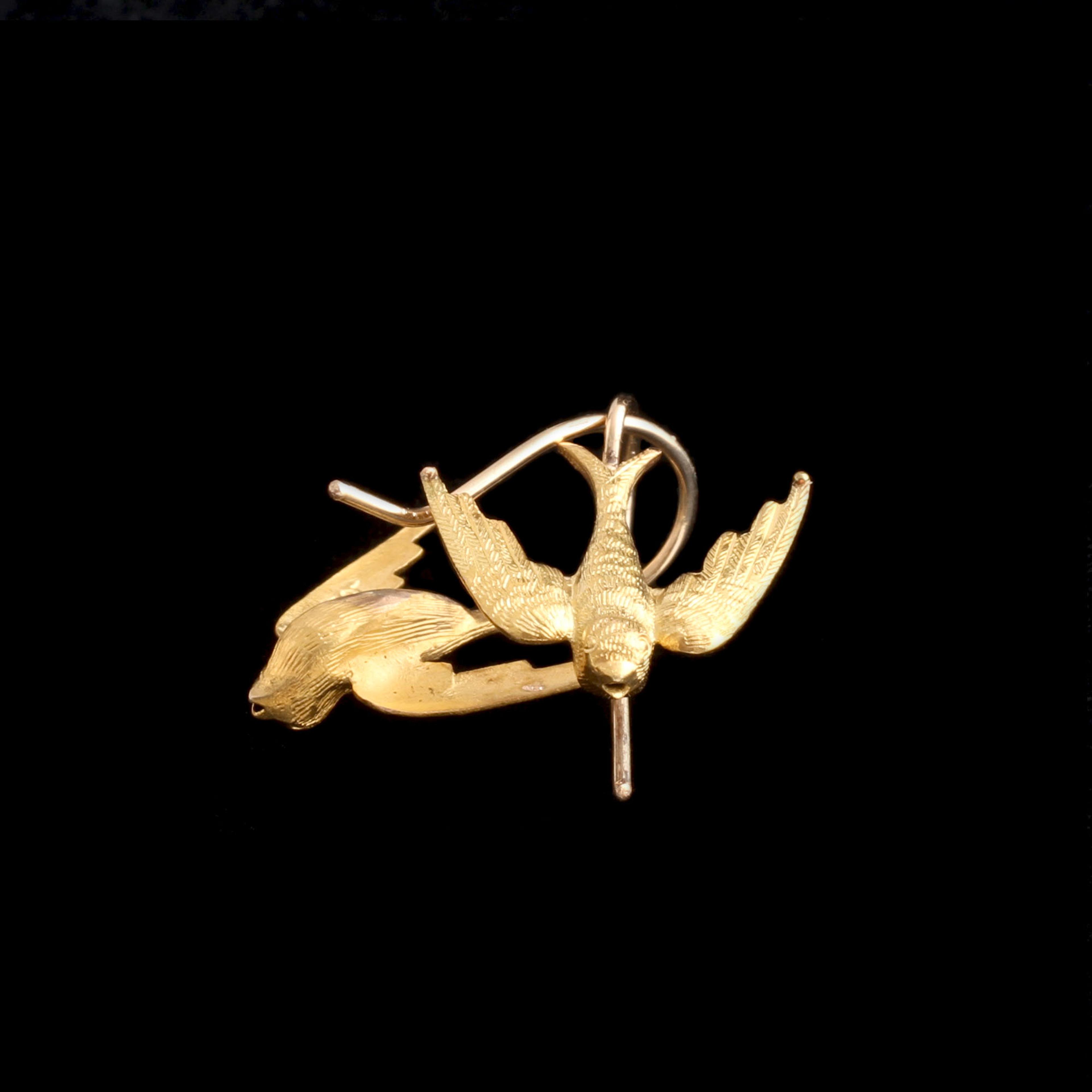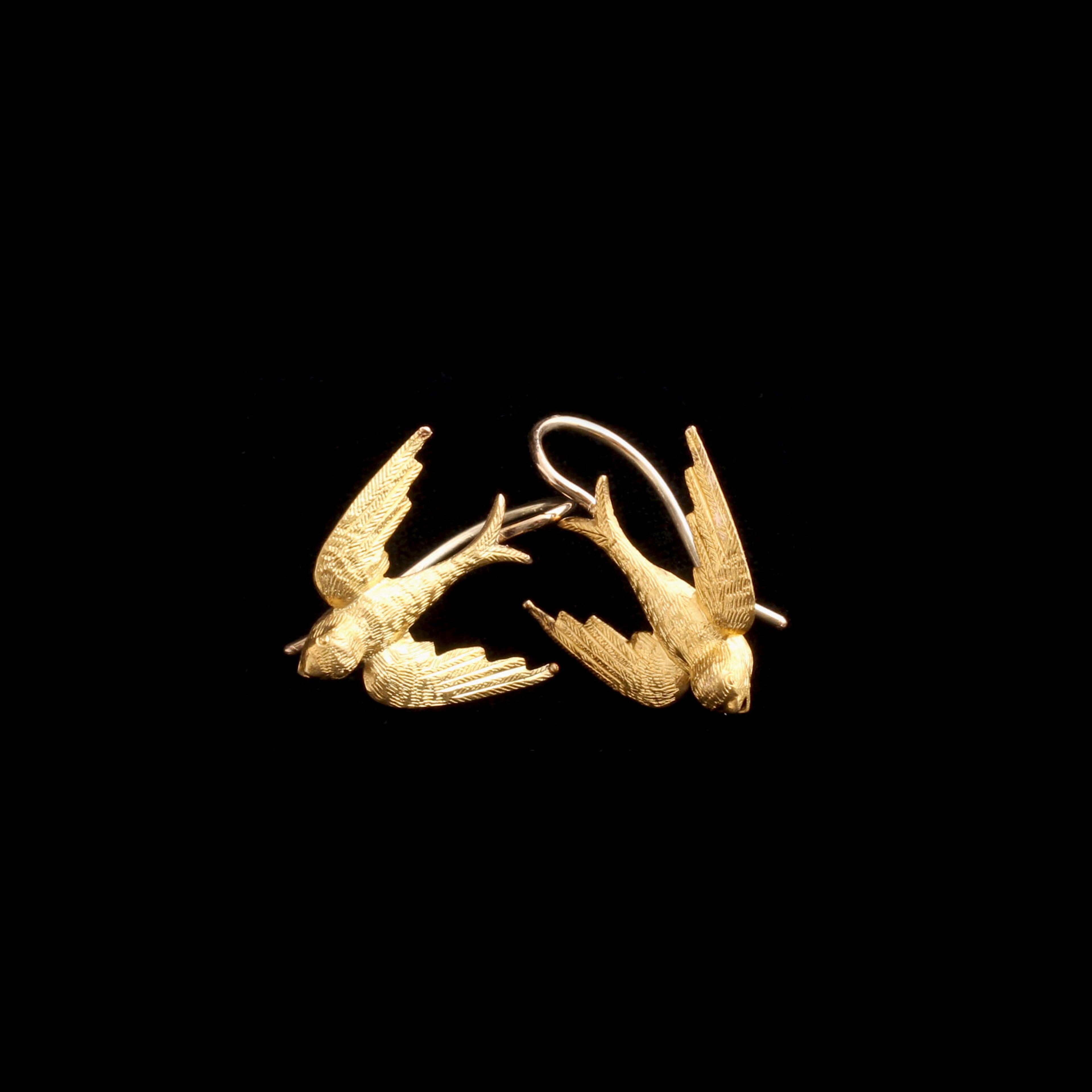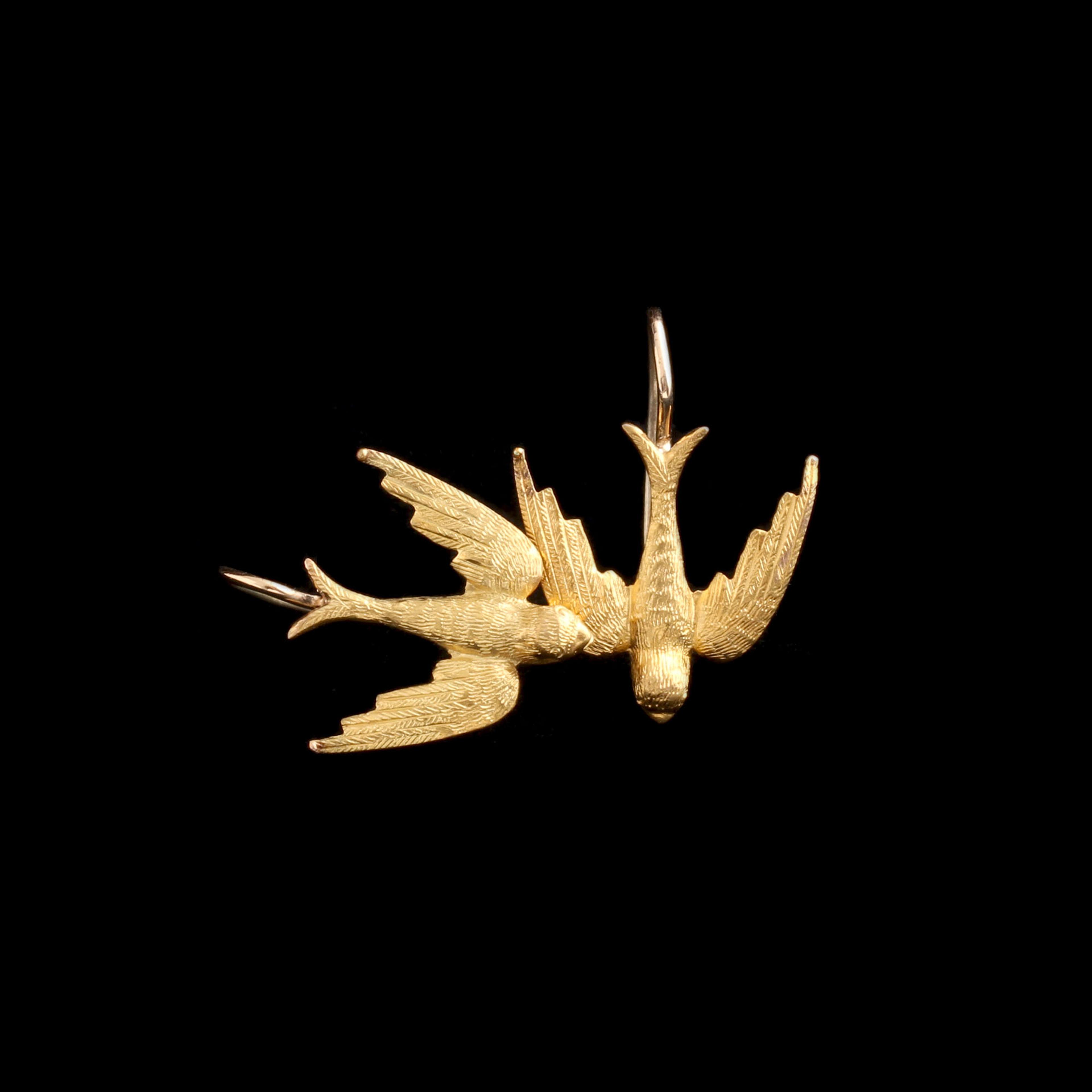 In the 19th century, swallows symbolized a safe return home. No wonder sailors got the birds tattooed on their bodies for the next hundred years. Here, a pair of them are made in 15k gold with finely textured feathers.