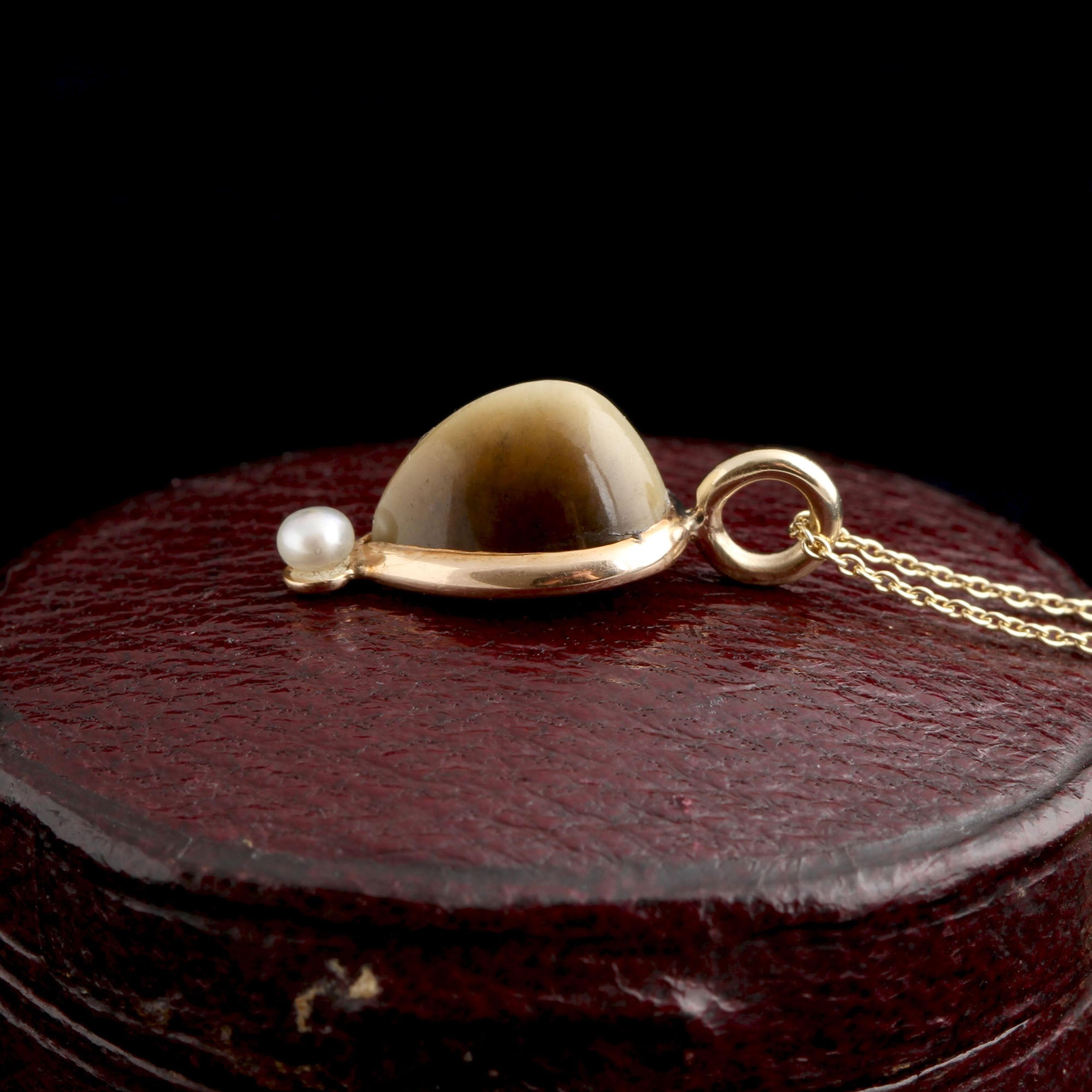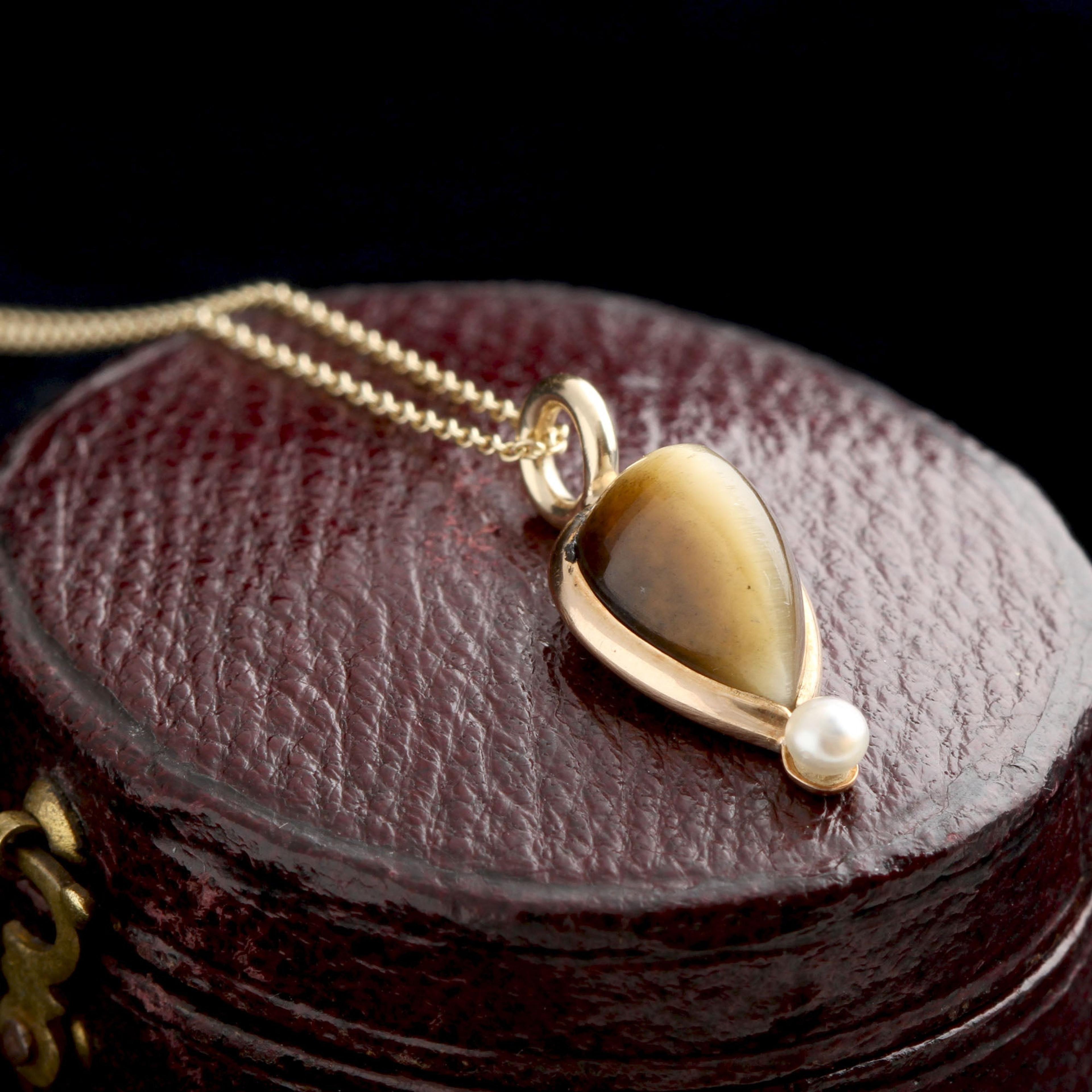 A pear-shaped sugarloaf tiger's eye cabochon and a seed pearl make an odd (but elegant) couple.