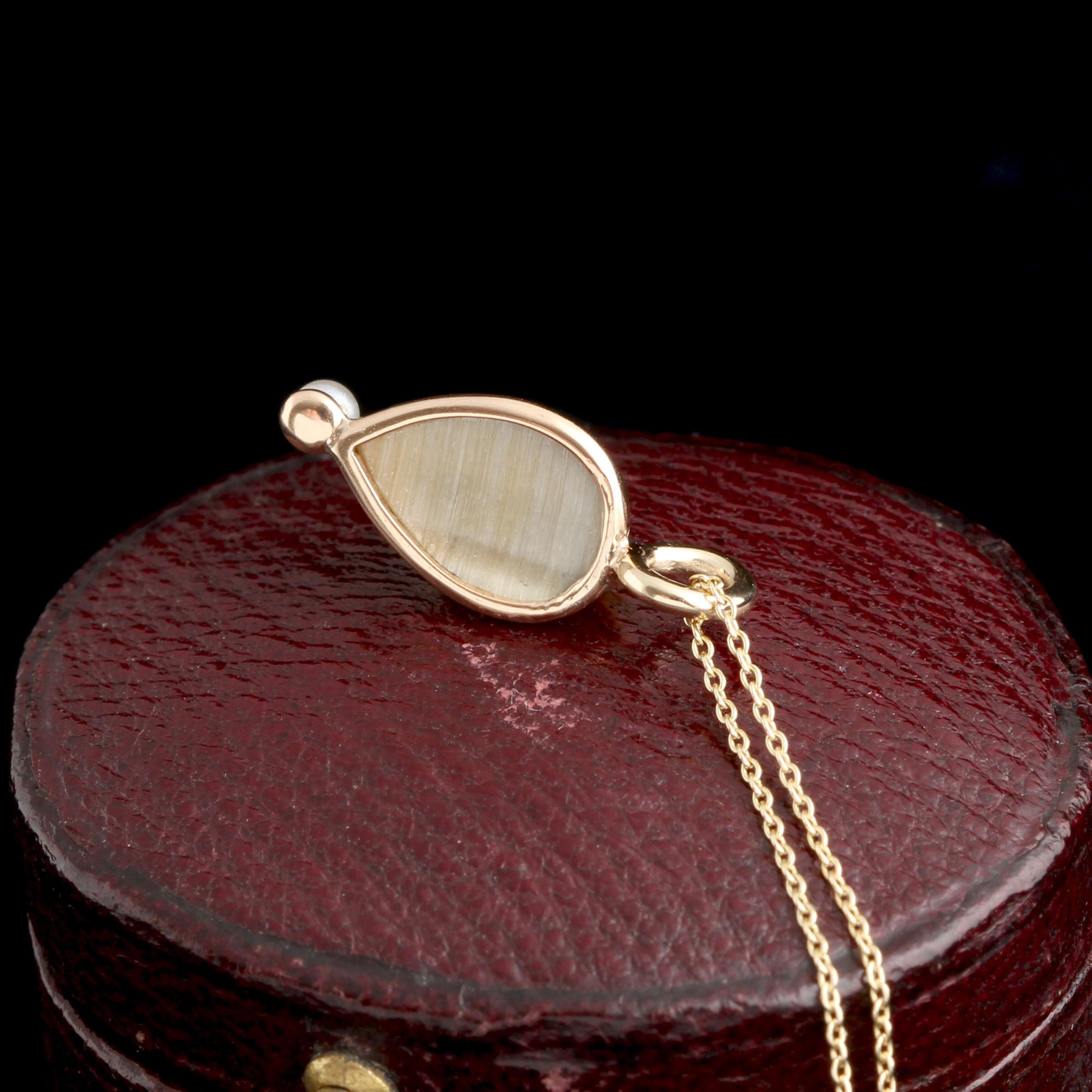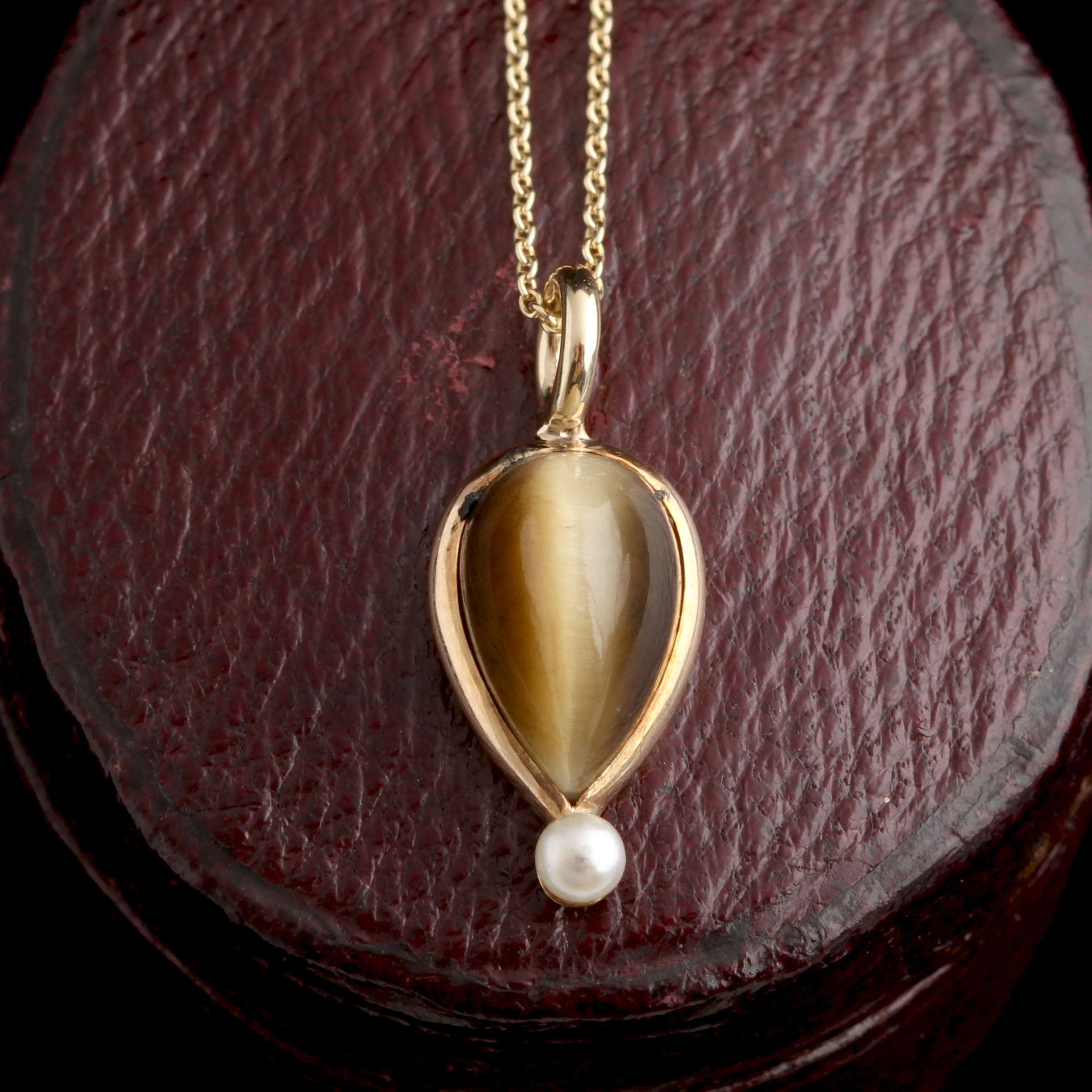14k gold (tests), pear-shaped sugarloaf tiger's eye cabochon, seed pearl, new 14k gold chain