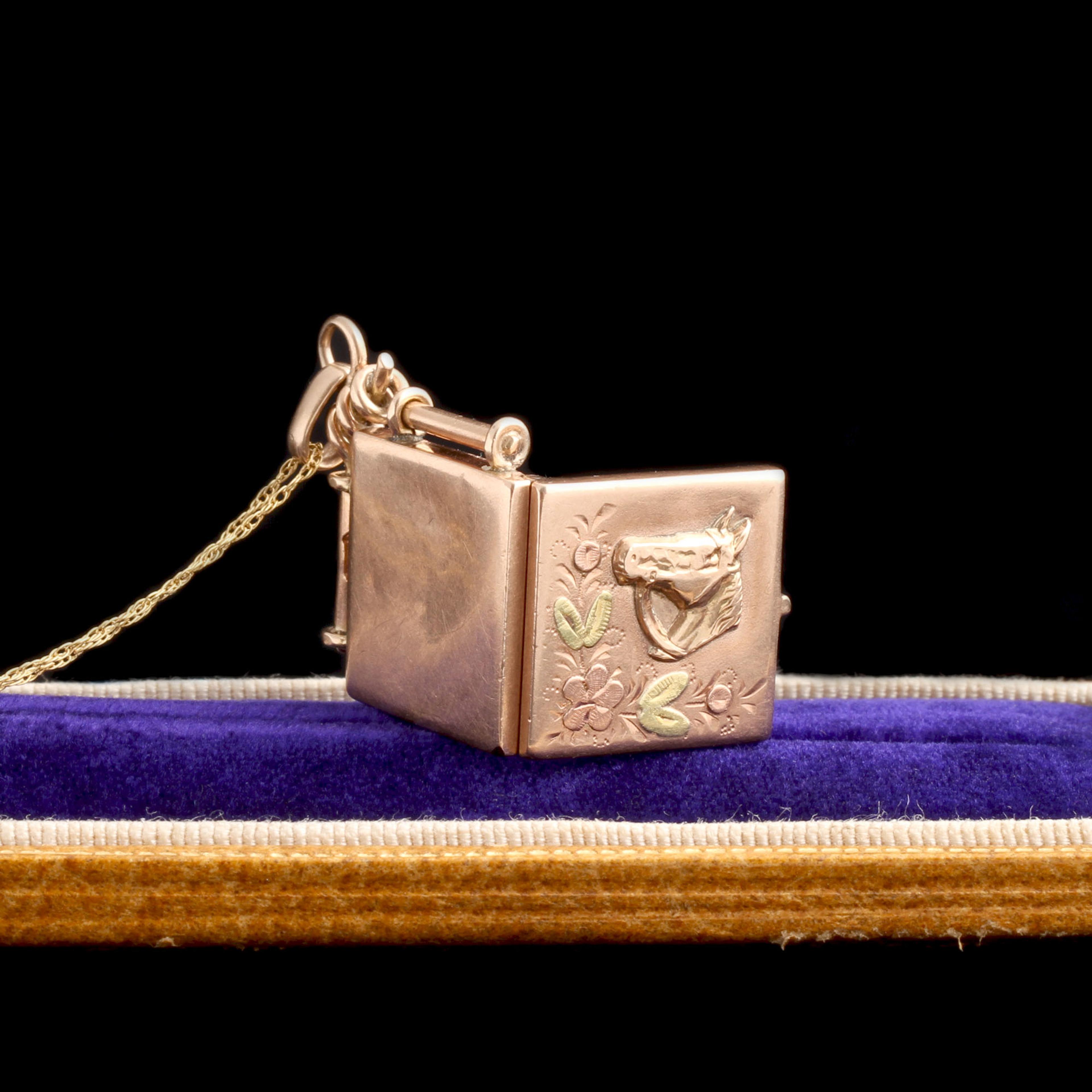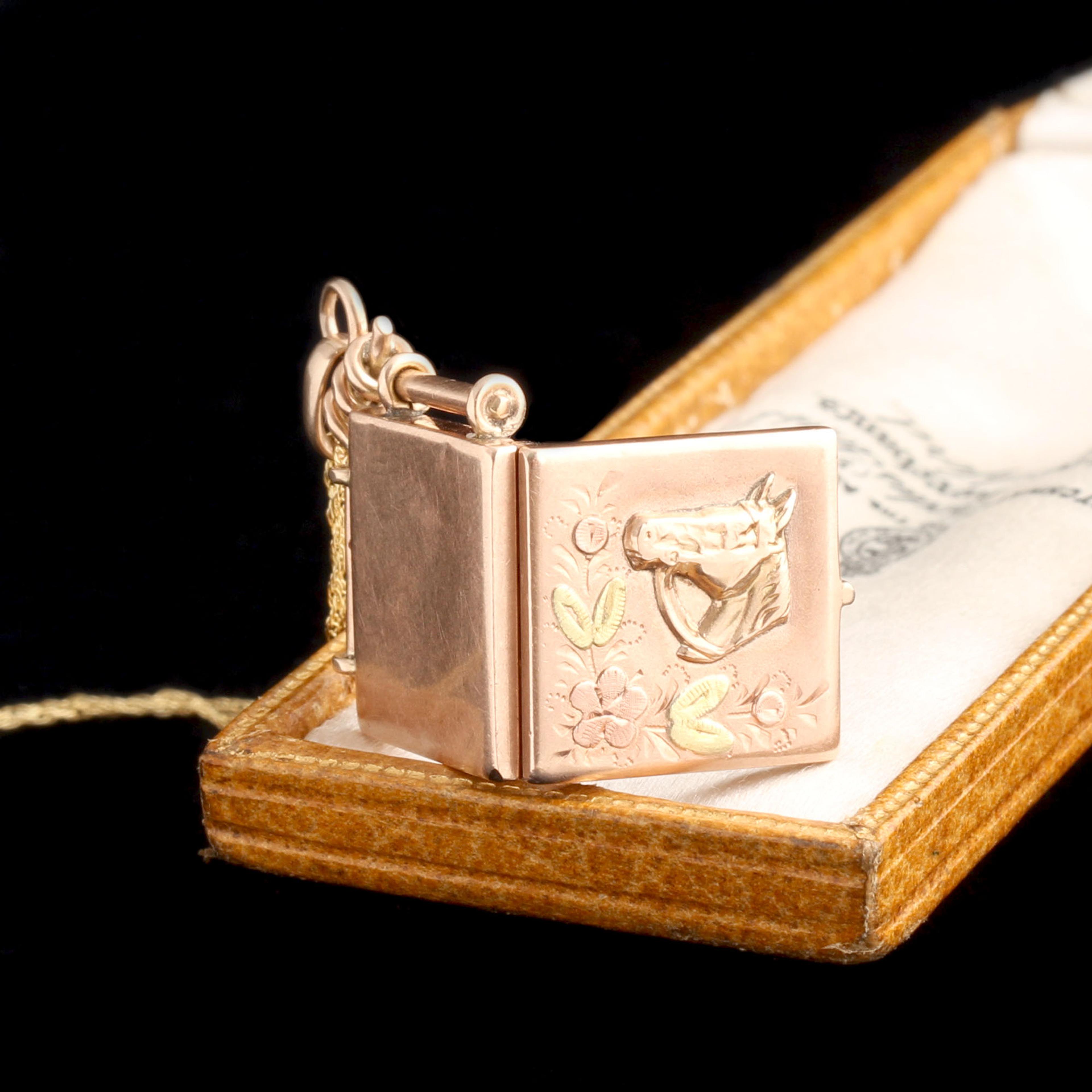 An early 20th century locket made in tricolor gold with a horse’s head rendered in relief above a swag of flowers and leaves.