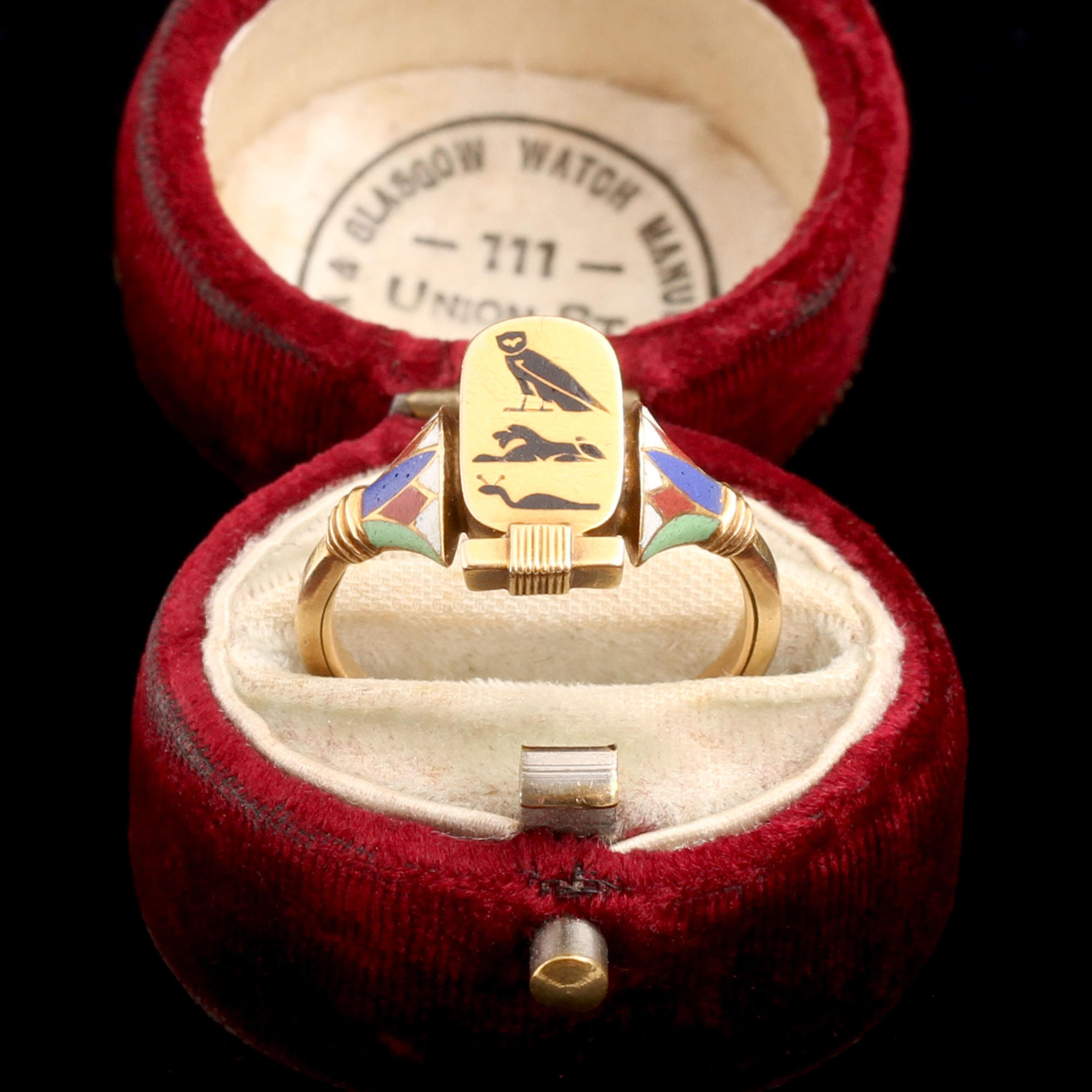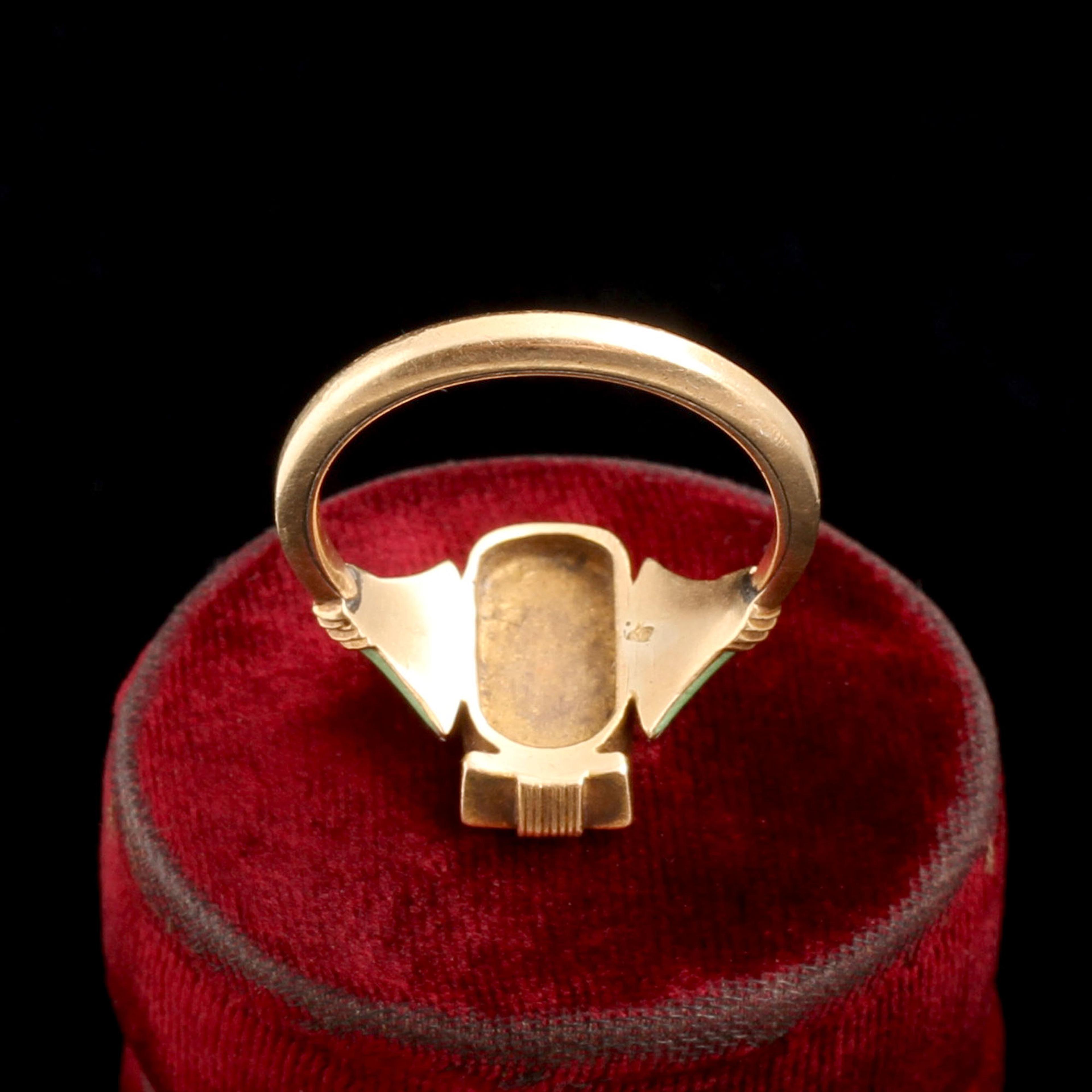 This Egyptian Revival signet-style ring showcases a bold enamel cartouche set in warm gold. The heiroglyphs spell out a monogram: the owl = M, lion = L, and horned viper (a very cool animal) = F/V. Together they form a mysterious personal cypher, rendered in the visual language of ancient Egypt. While true Egyptian cartouche rings were made for royalty, this early 20th-century example reflects the period's fascination with antiquity. Monogrammed signet rings were a modern fashion of the 1900s, and here's what one looks like filtered (probably not historically accurately) through the aesthetics of the ancients. A beautiful mishmash.