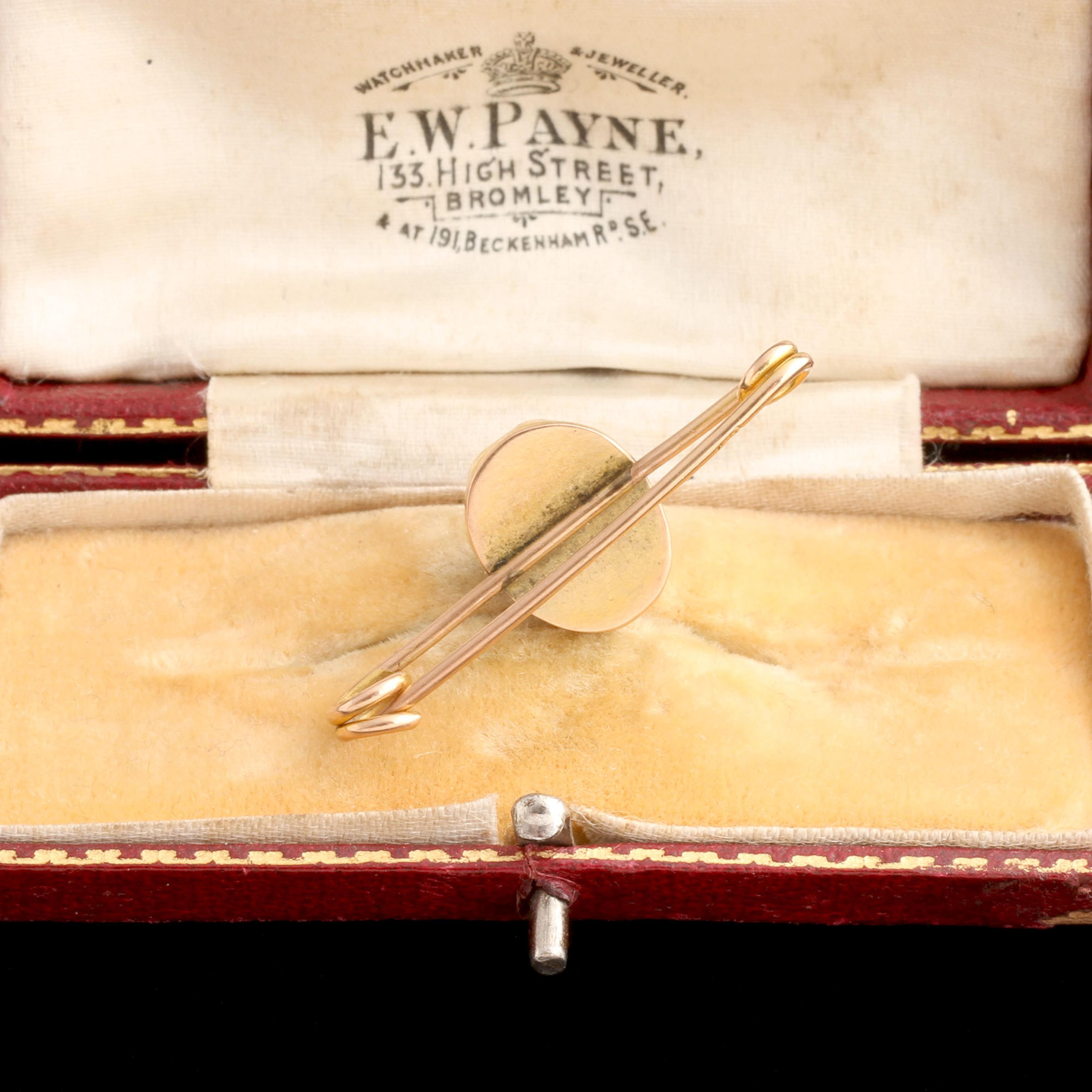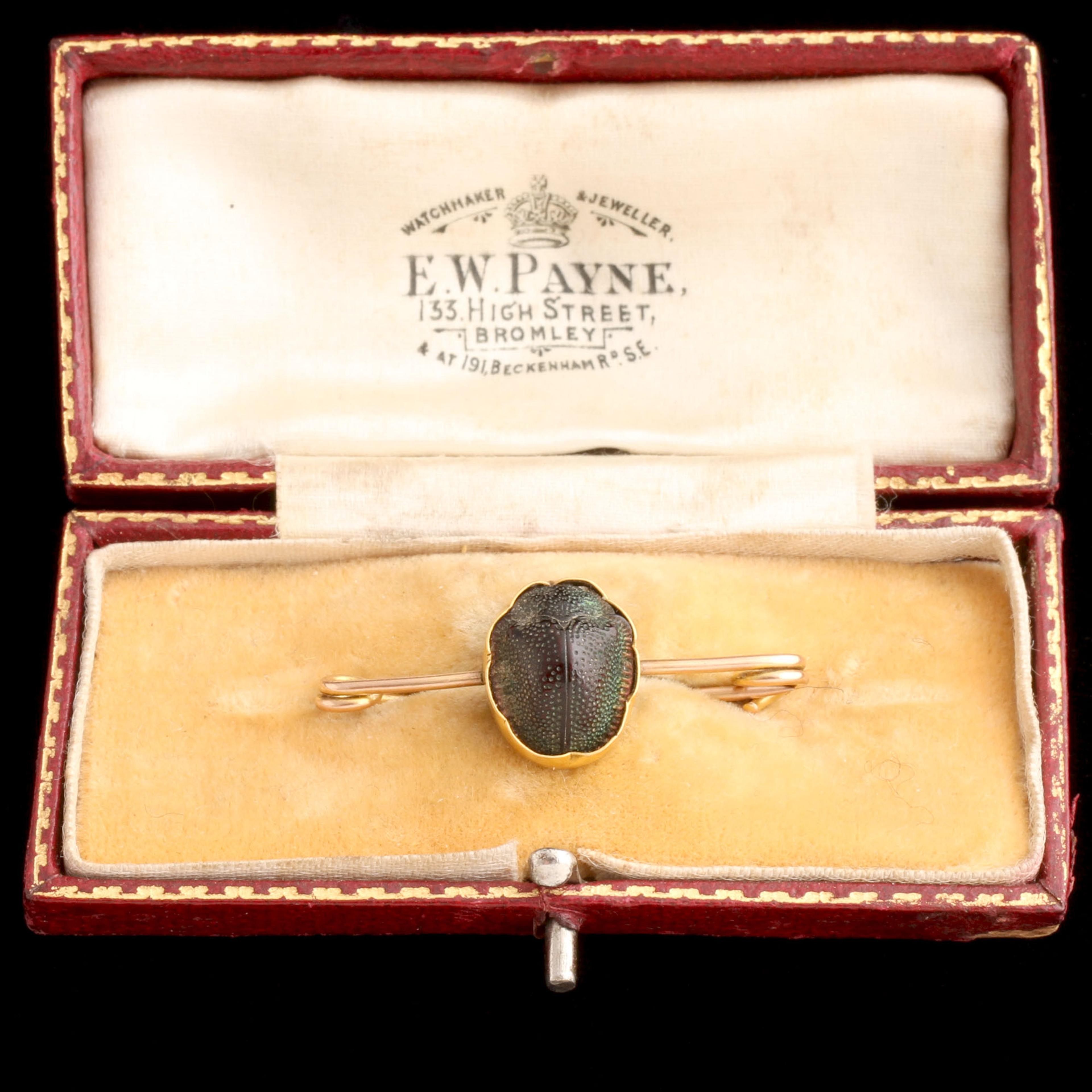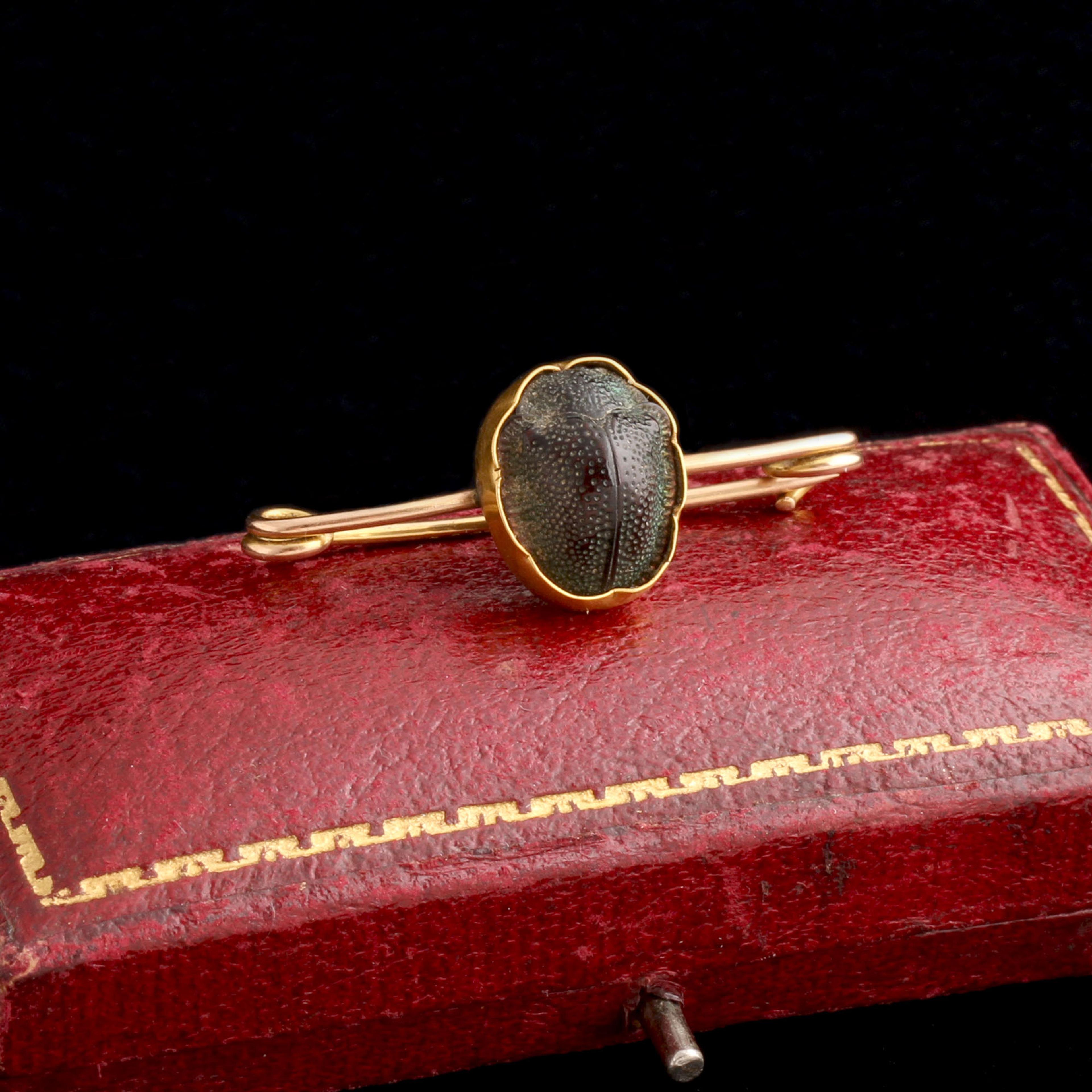 Iridescent insects were imported en masse from South America to satisfy England's obsession with an ancient Egyptian motif: the scarab beetle. Real scarab beetles (aka dung beetles) look nothing like these shiny green guys, but no big deal to the to Egyptophile who wore this pin. Authenticity wasn't top of mind; vibes were. This insect is perfectly preserved in its 100+ year old gold setting - and it comes in its original leatherette box.