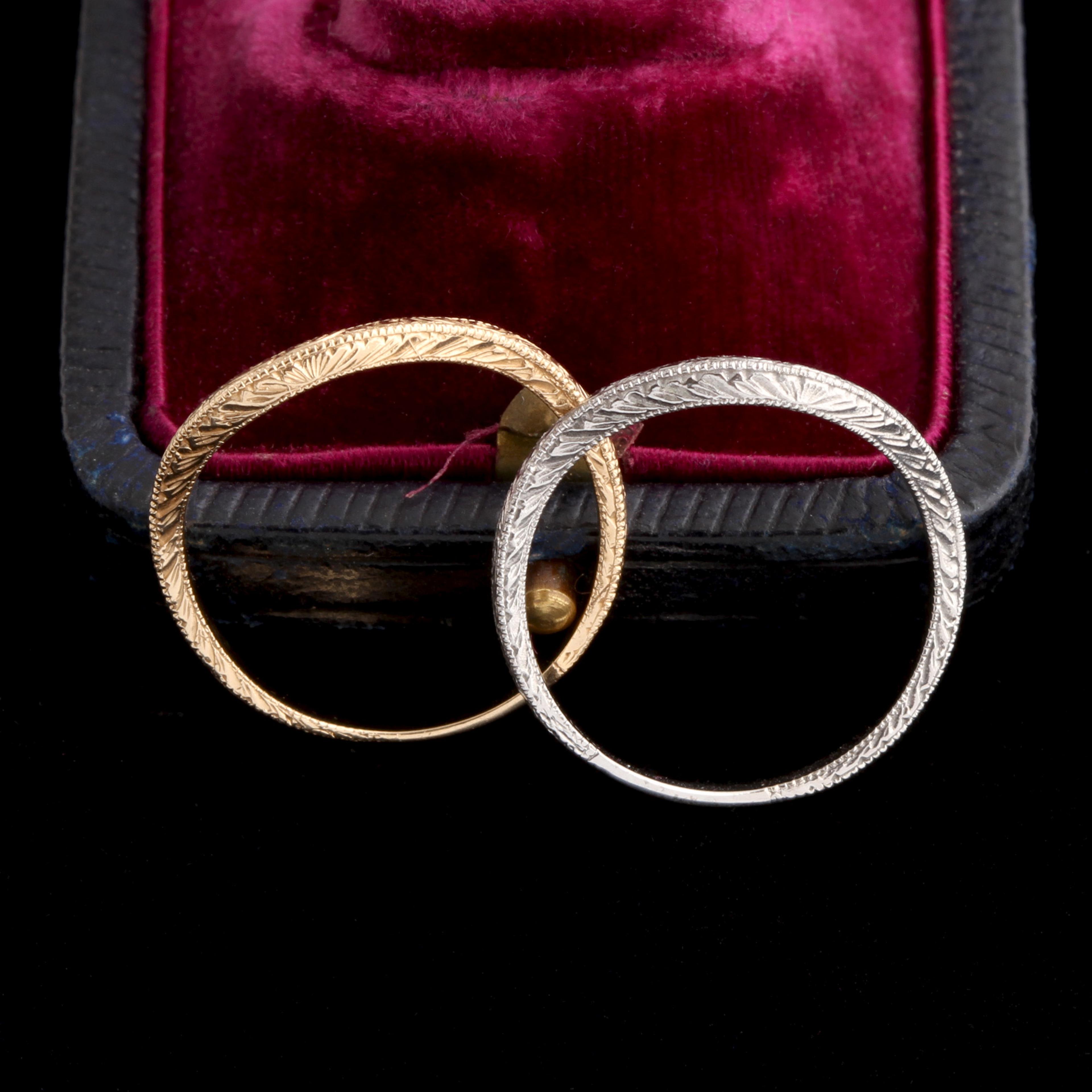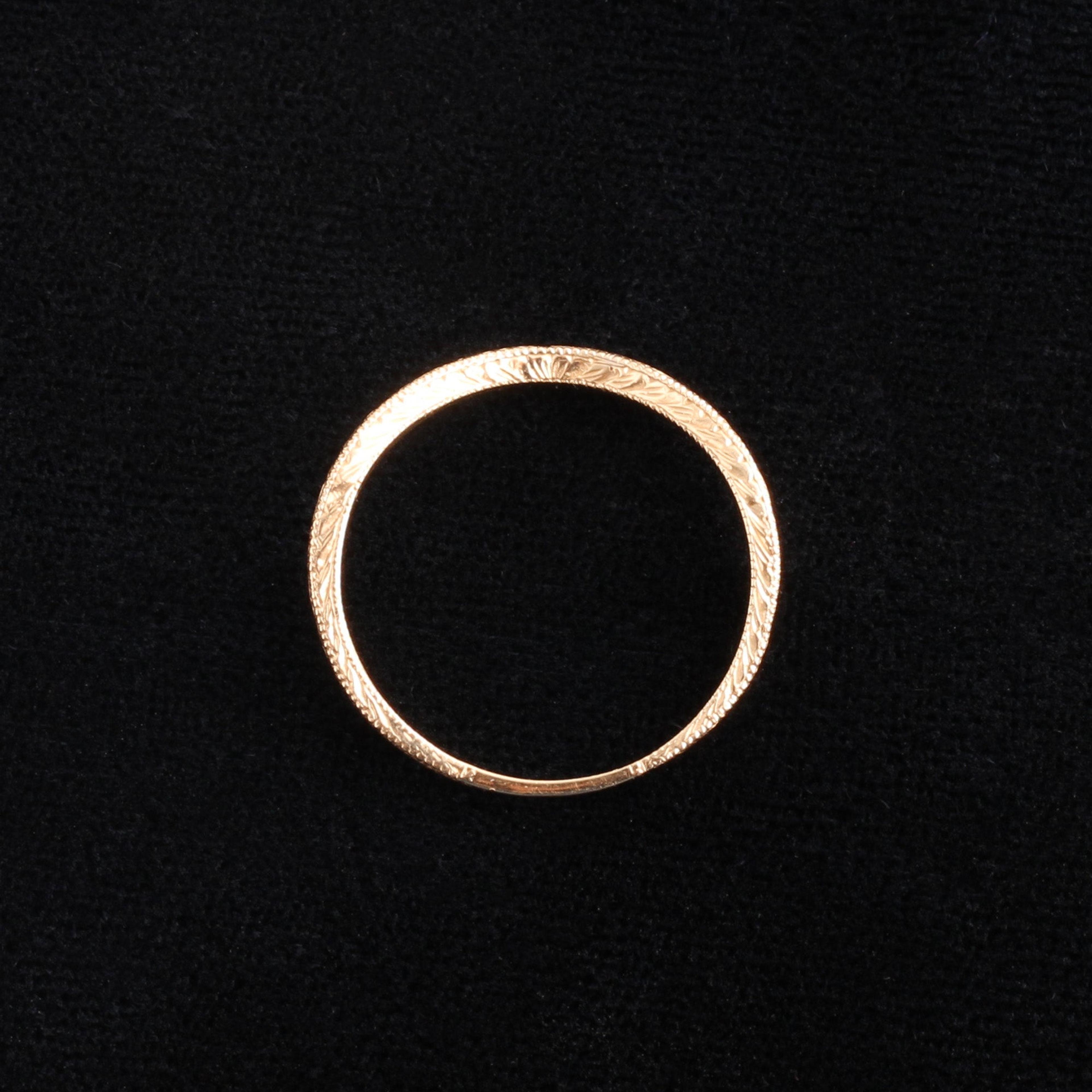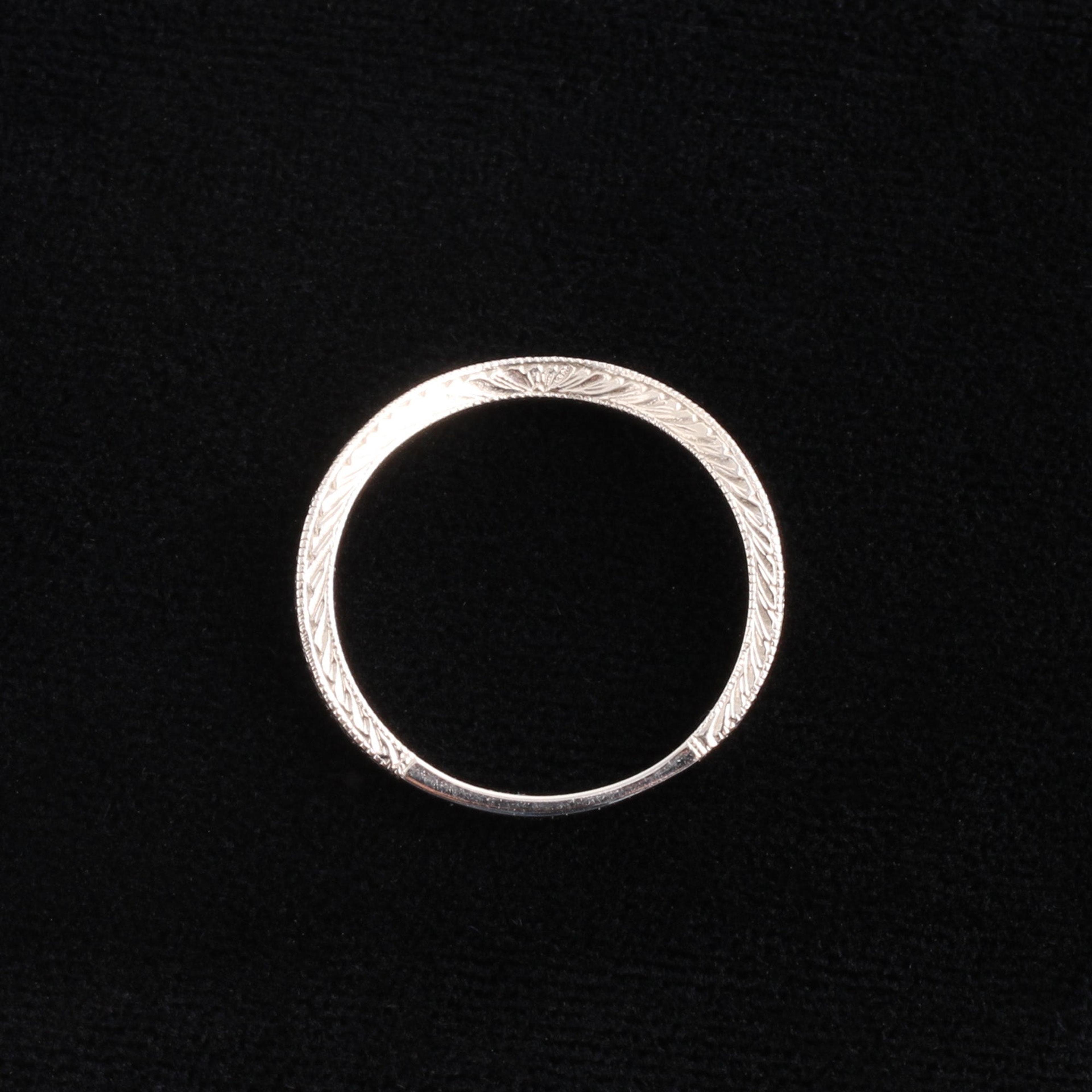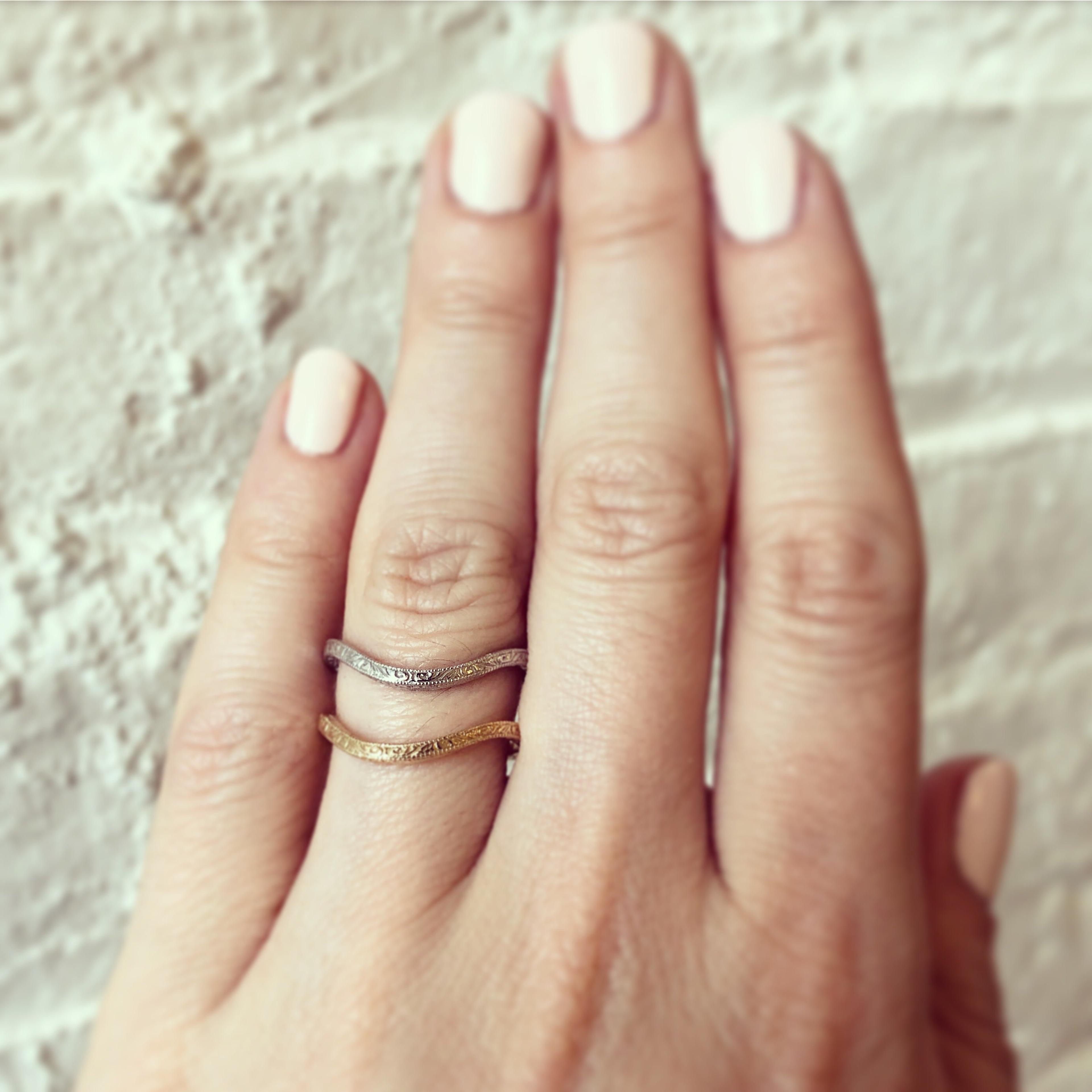 Our deeply curved wedding band is custom made to nestle alongside your engagement ring. Each one is hand-engraved, which provides a special old-world flourish that simply can't be reproduced by a machine. Milgraining along the edges adds to the ornate Art Deco vibe, so if you've got an Art Deco engagement ring, this will be a great partner to it. But it would work just as well alongside a streamlined modern solitaire, too.