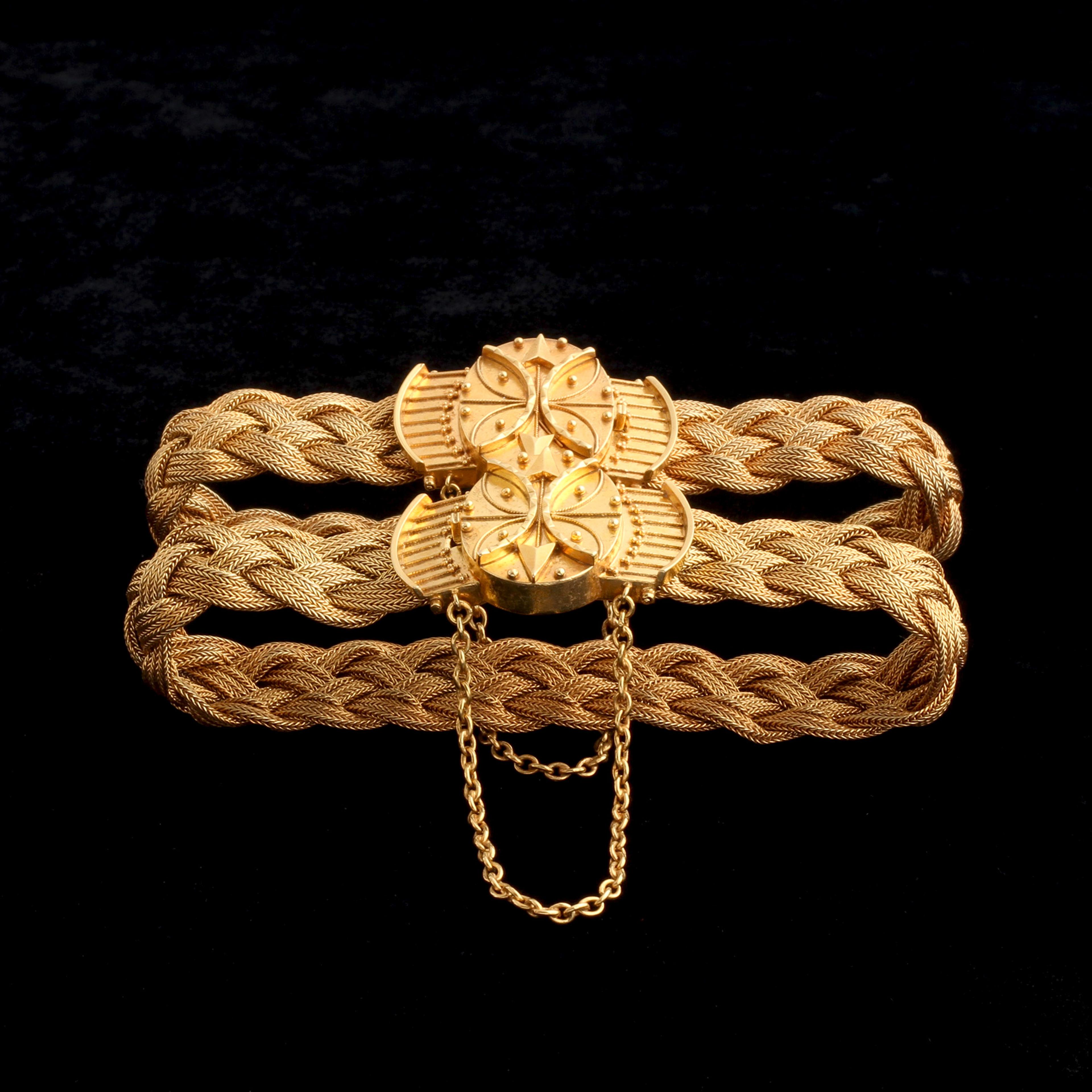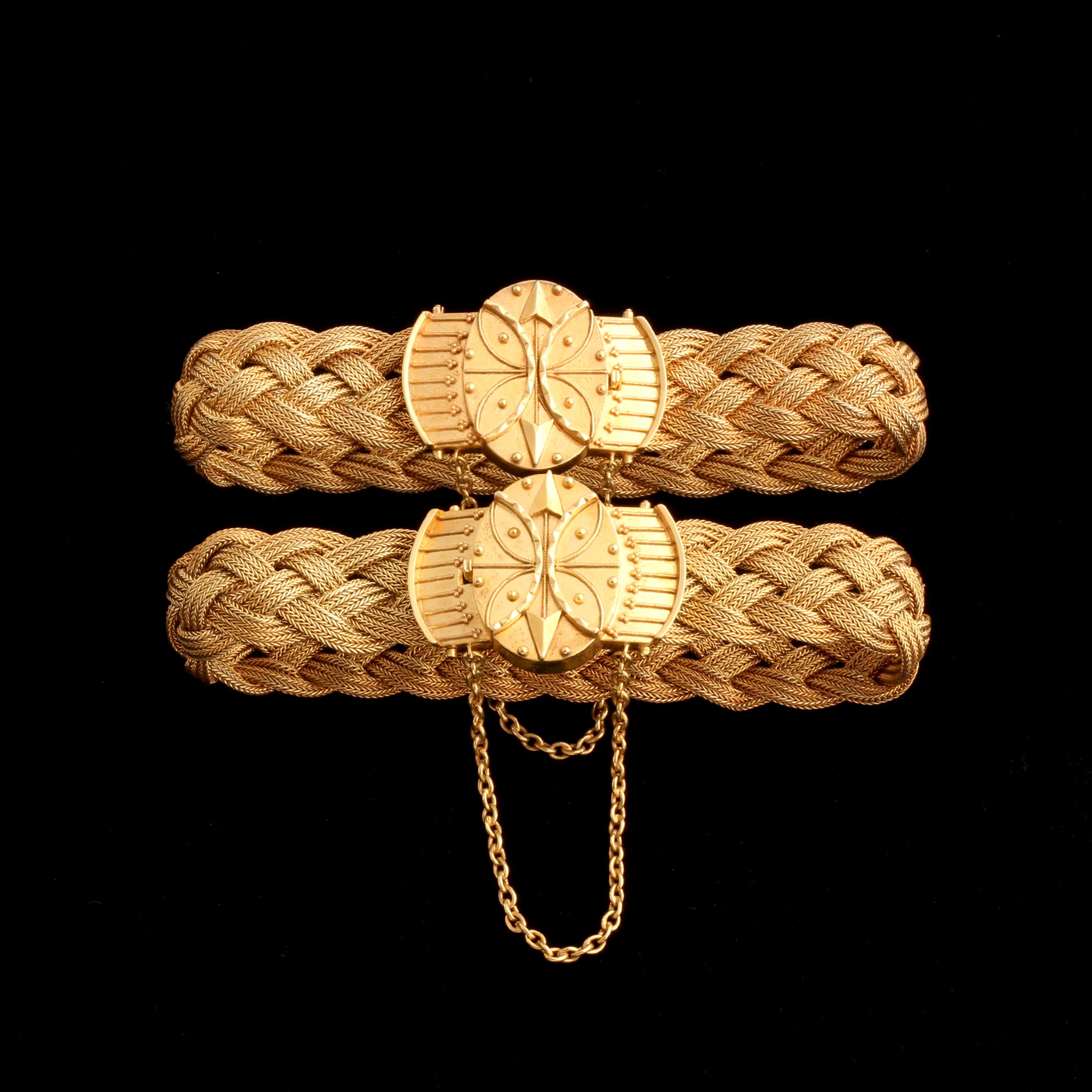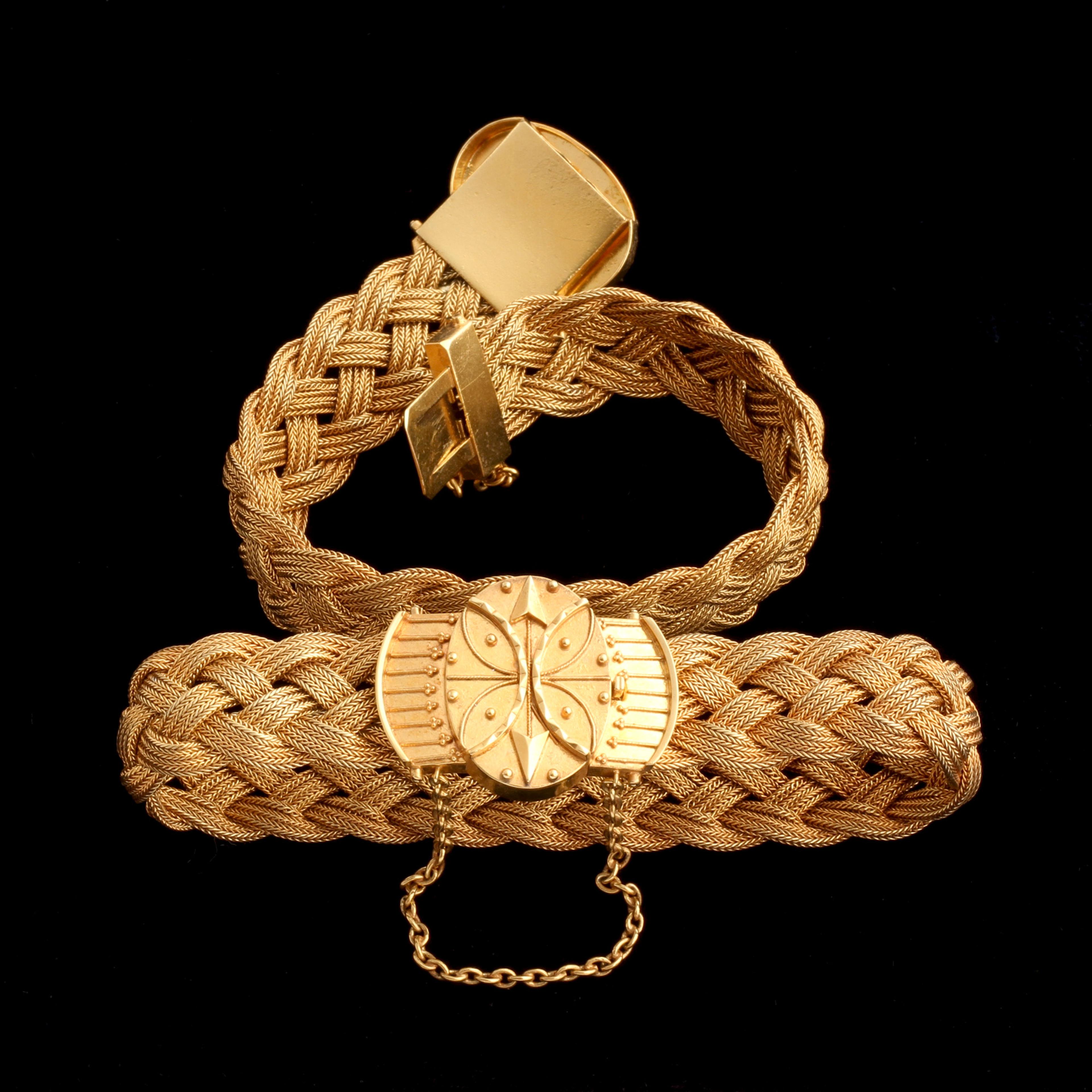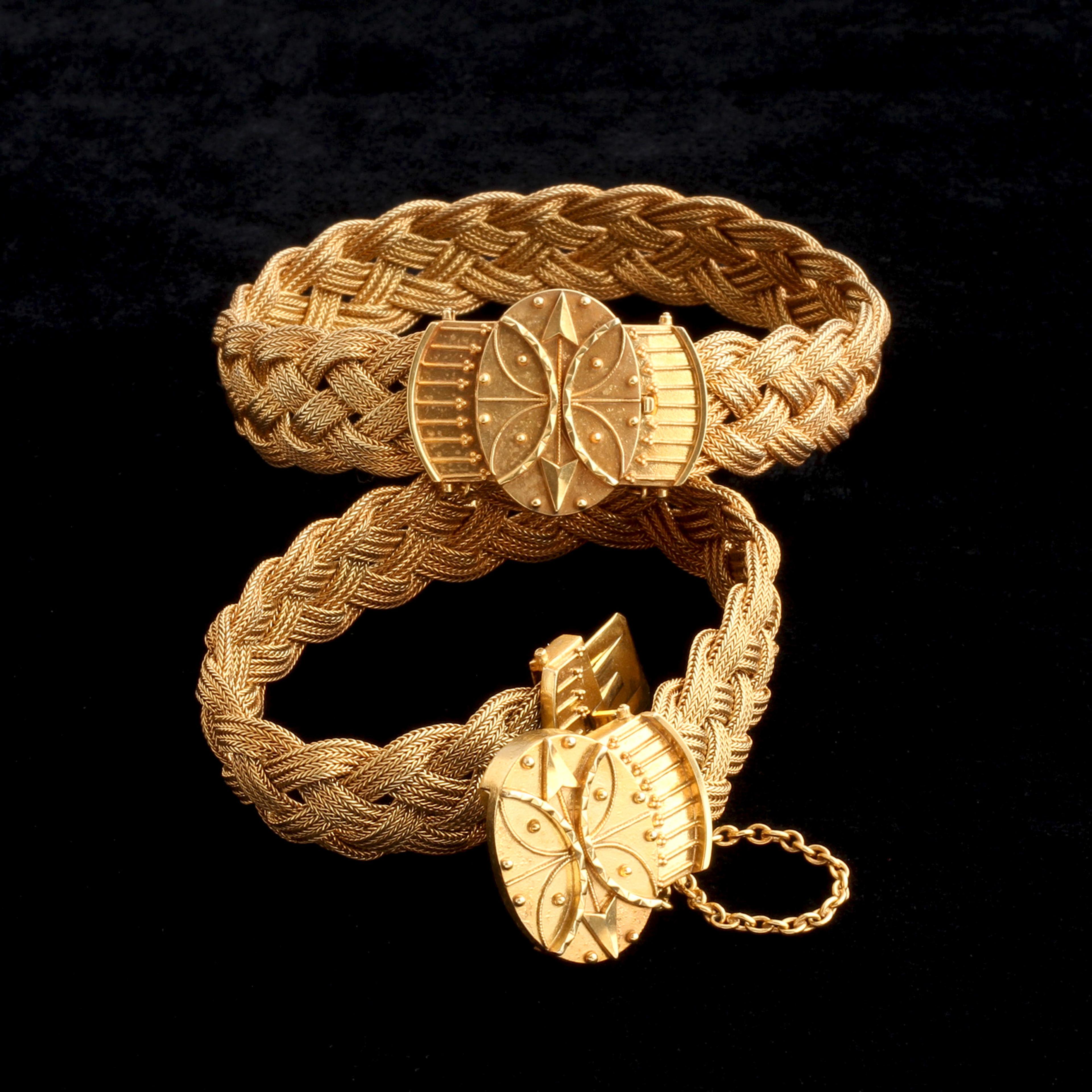 These matched bracelets were made in the "archaeological style", that is, influenced in style by the jewelry found in the excavated ruins of ancient Etruscan cities. Ancient Etruscan jewelers excelled at creating depth and relief in gold using corded wire, filigree and granulation. During the mid-1800's, when these treasures were unearthed, European jewelers were inspired to create pieces incorporating the aesthetic details and shapes of these magnificent antiquities - a style that came to be known as Etruscan Revival. Fashioned in 14k gold, these bracelets have retained their original bloom (high karat gilding) and are in near perfect condition.