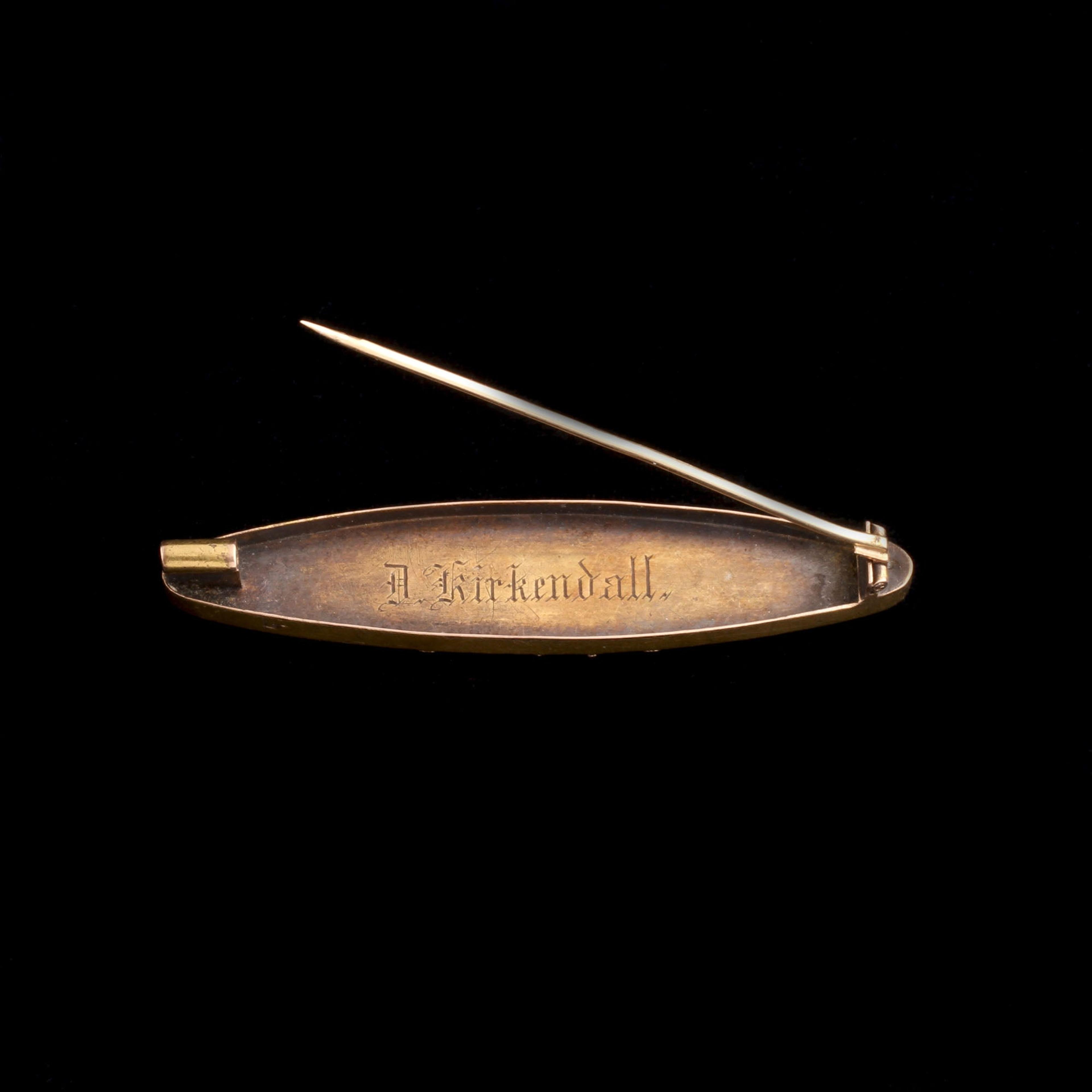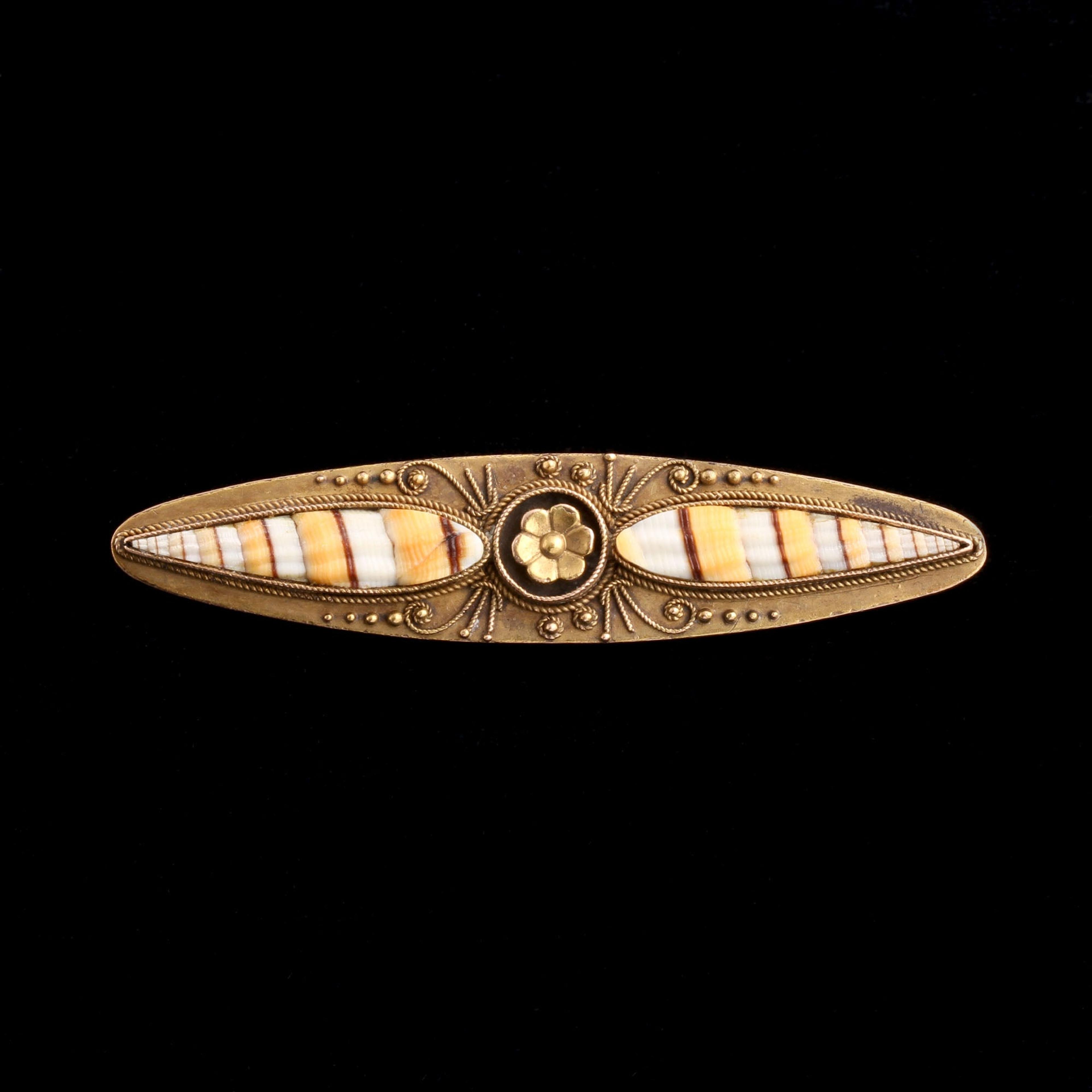 At some point in the late 19th century, someone named "D Kirkendall" visited a seaside town and purchased this Etruscan Revival style pin. In it are mounted two very sweet colorful seashells to help remind him/her of their English ocean vacay.