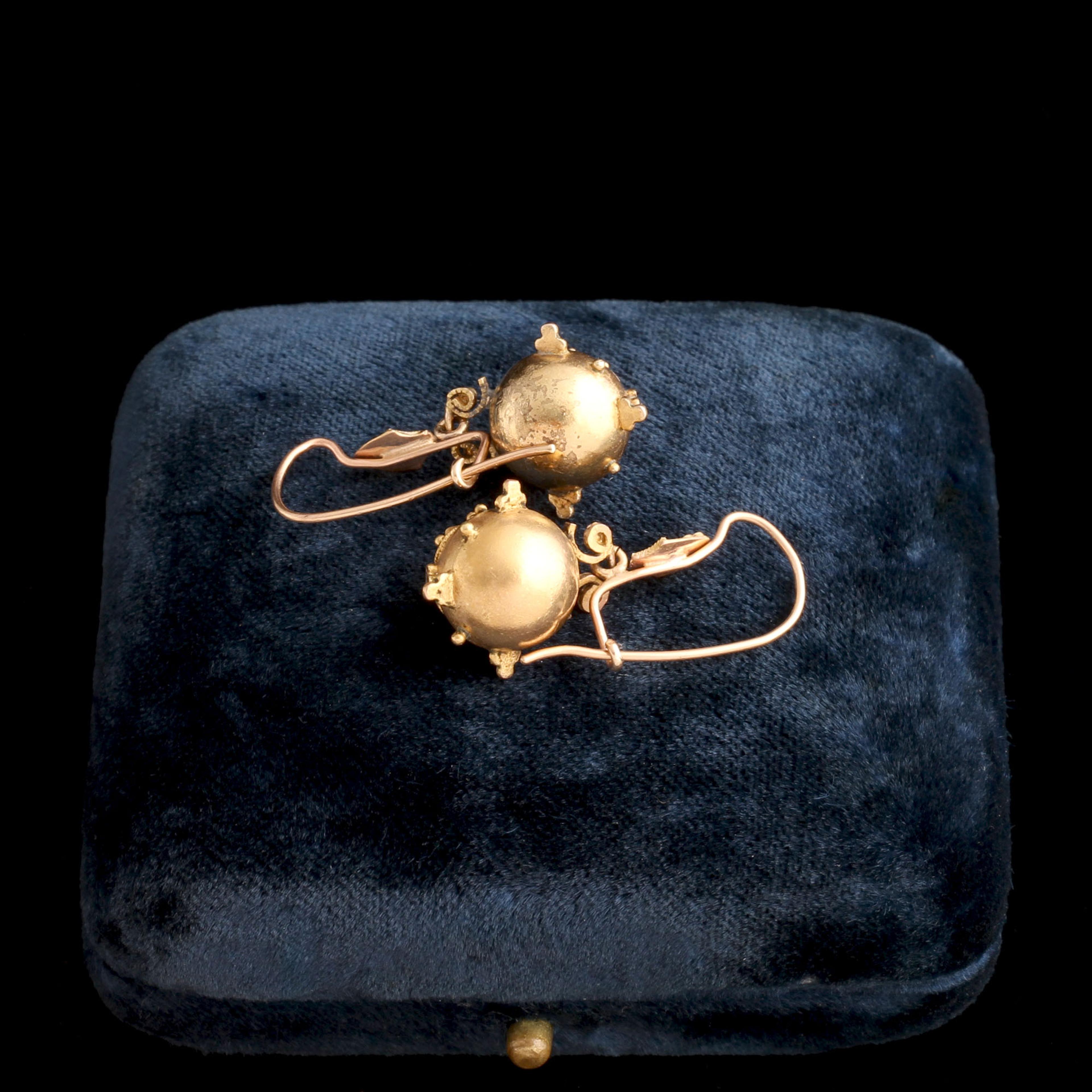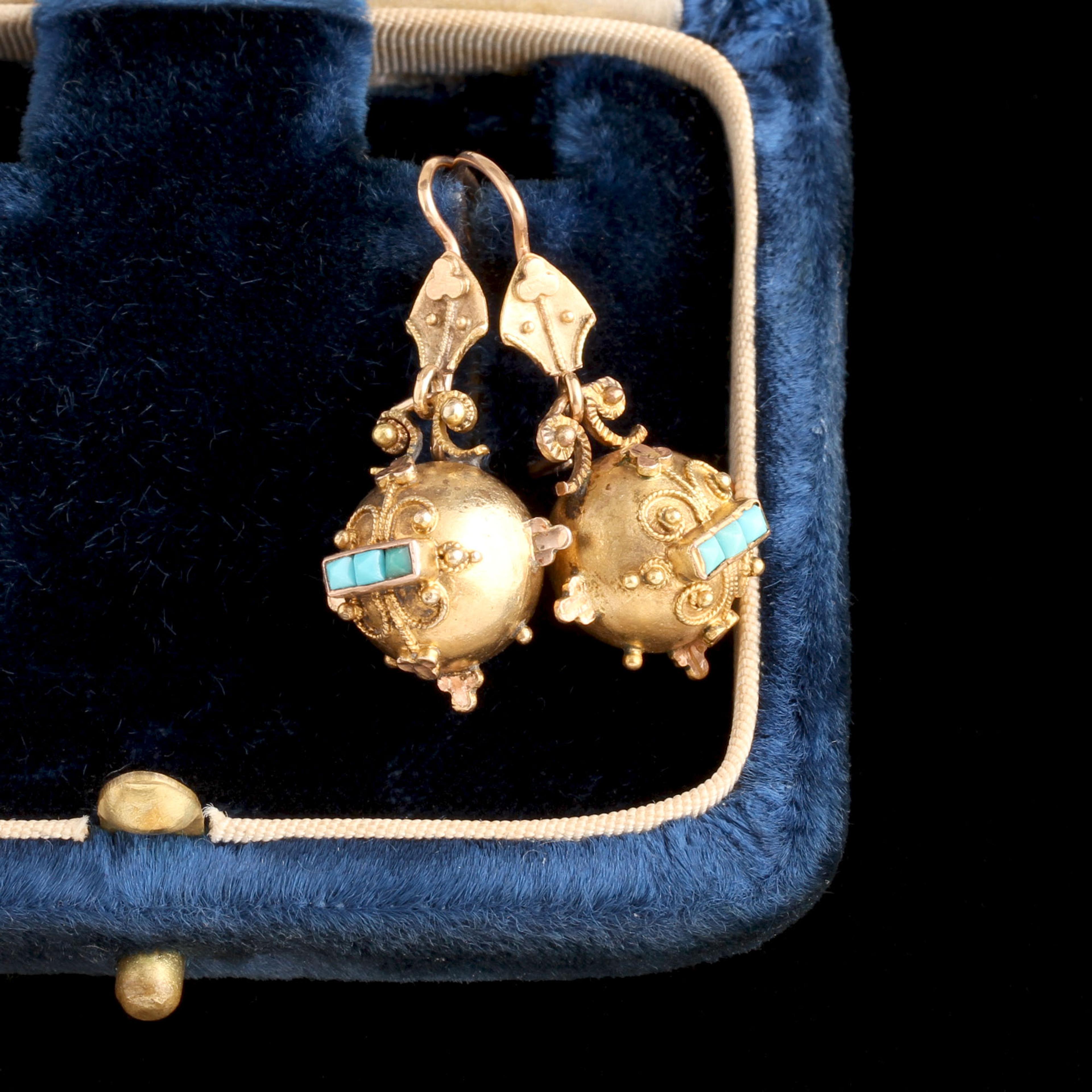 Mid-Victorian jewelers were deeply influenced by archaeological discoveries, and Etruscan Revival jewelry became a way to signal that you were up-to-date with the latest news and LEWKS from the ancient world. These earrings draw directly from that classical aesthetic language. The granulated gold work and orb forms were inspired by ancient Mediterranean prototypes, but filtered through a 19th-century lens. Turquoise was a beloved stones during this period, associated with protection, health, and good fortune. The cut - a pyramid stud shape - remained badass through the 1980s and beyond.