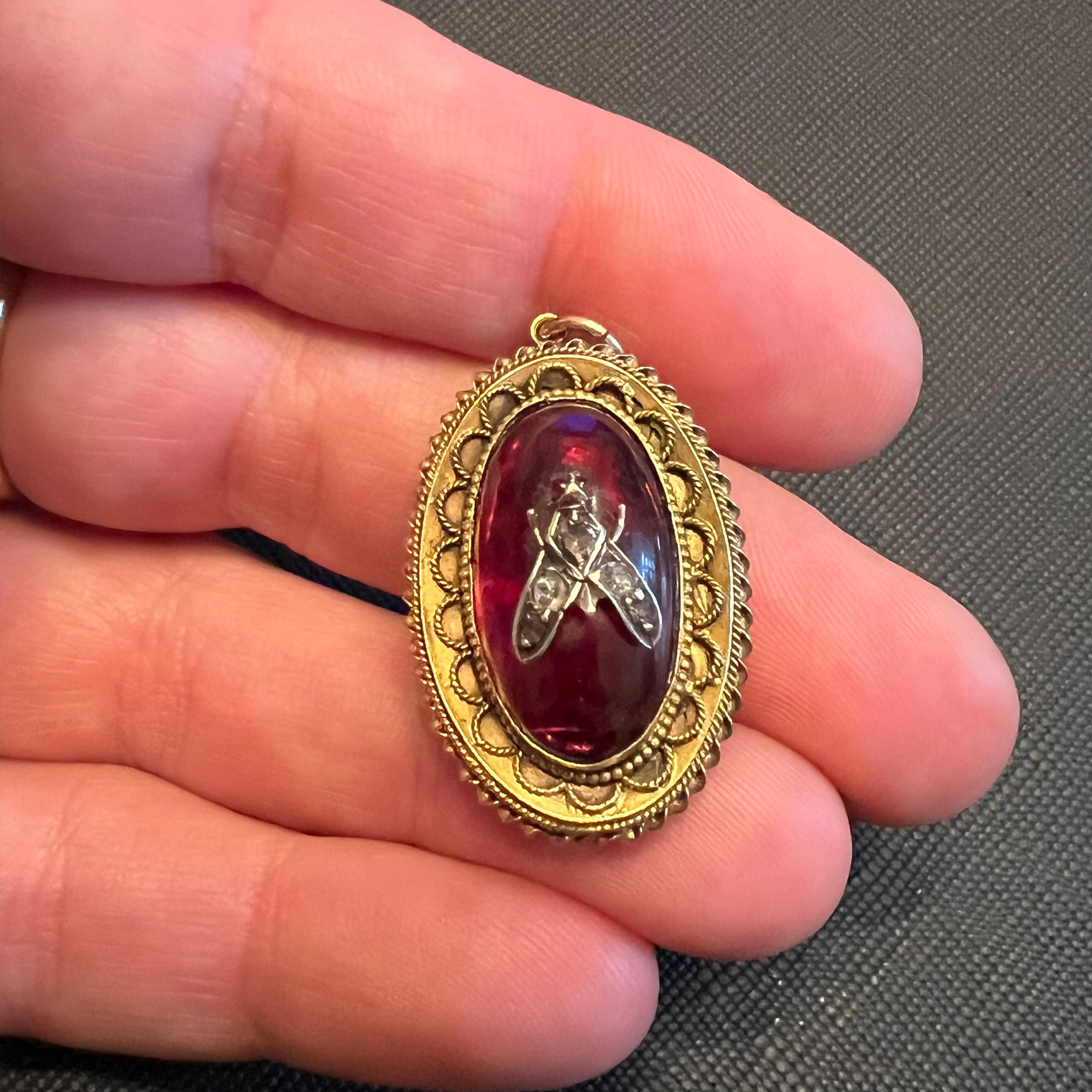This 19th century pendant features a gem encrusted fly perched on a carbuncle (aka a massive red garnet cabochon) in an ornate 10k gold setting. Silver fly with five rose cut diamonds and garnet eyes. 1 3/8" long including the bale.