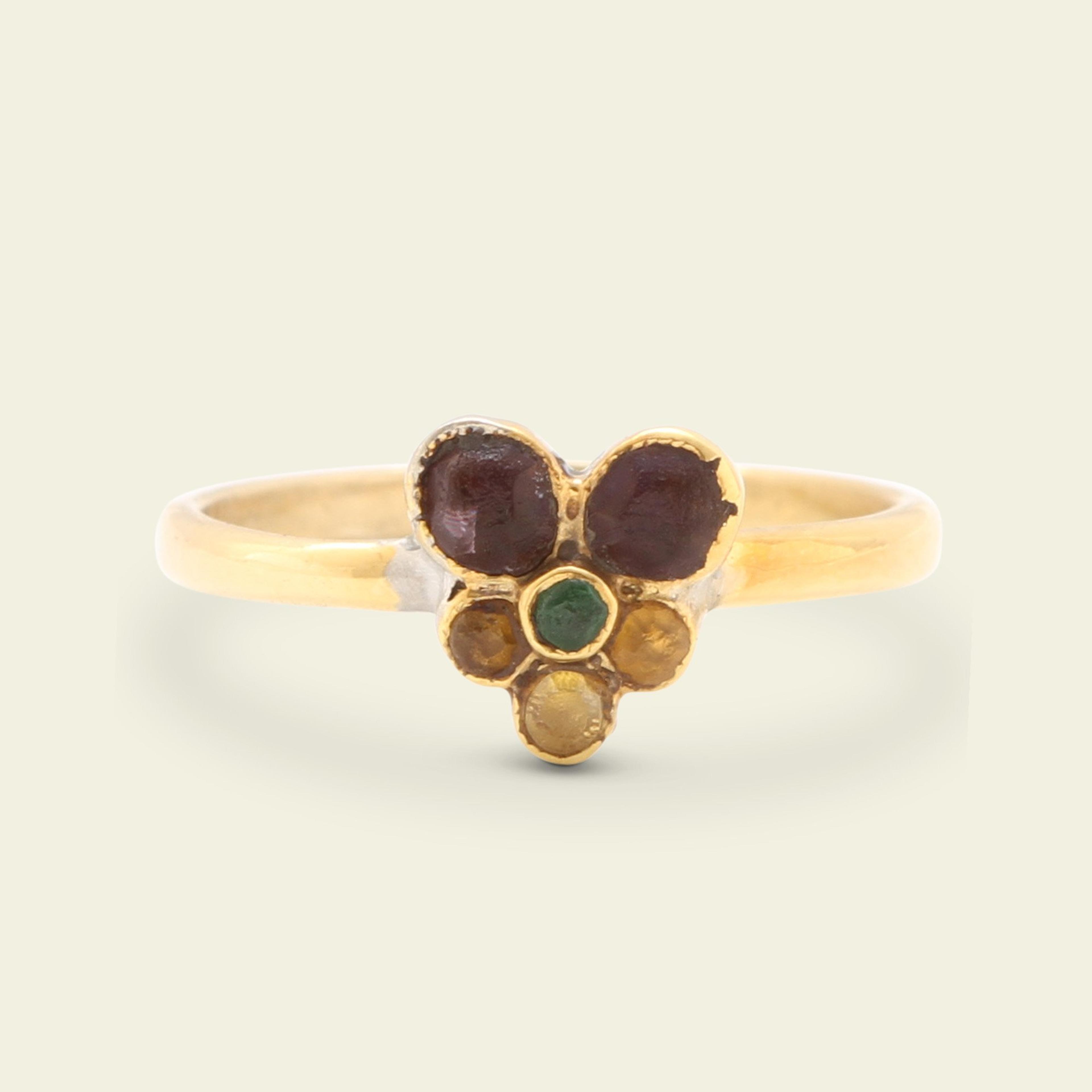 The name "pansy" derives from the French word "pensee" which means "thought". Ever big on subtlety, the Victorians devised an entire symbolic language of flowers. For example, a Victorian gentleman could express that he was thinking of his love by presenting her with a pansy. And she would understand what that meant! (Giving a pansy to a gentleman was considered bad luck). In fact, the pansy was considered to have magical love-inducing powers. The Celts and Ancient Greeks used the juice of a pansy as a love potion, and this floral elixir of amor even makes an appearance in A Midsummer Night's Dream. This c.1840 pansy is rendered using amethysts, emeralds and citrines.