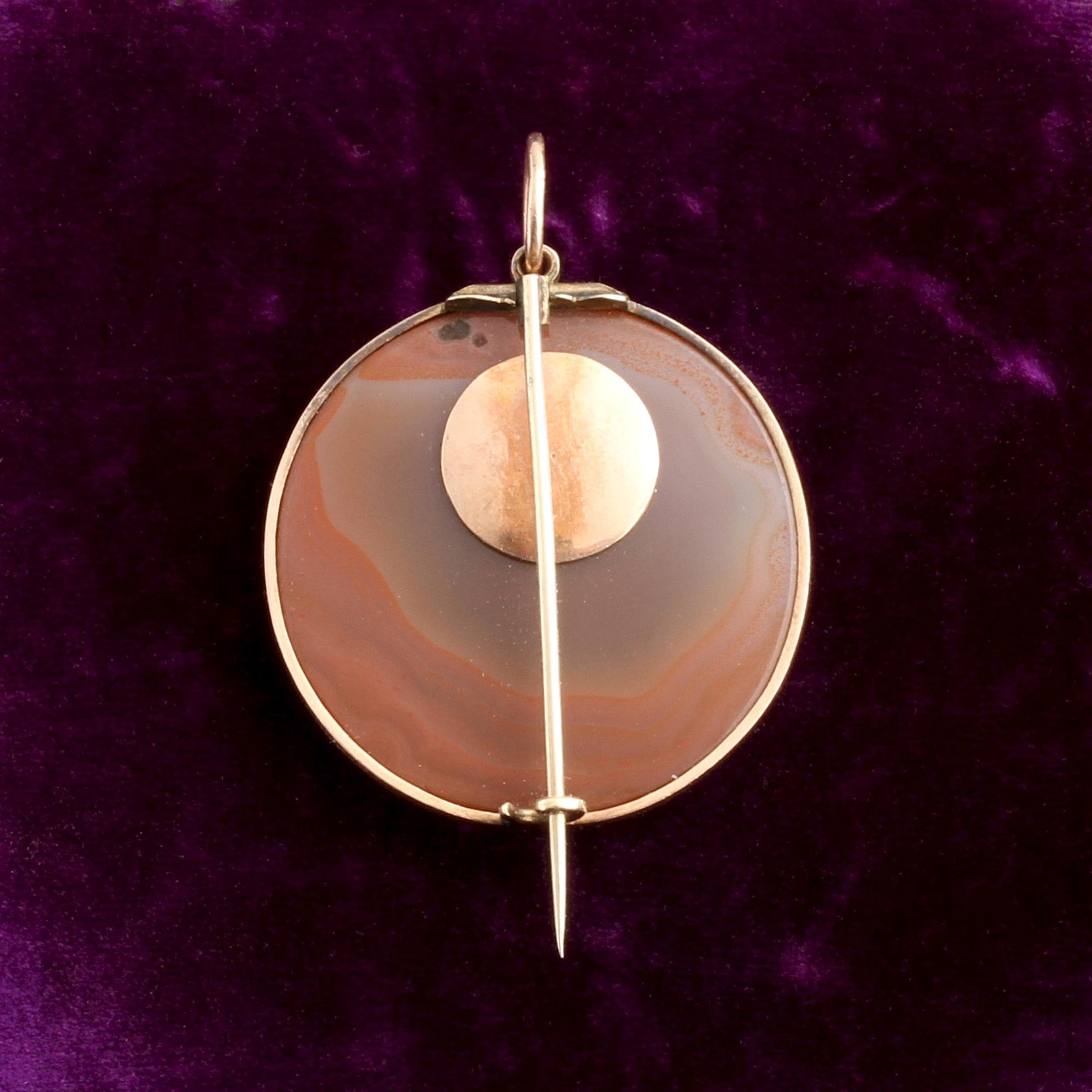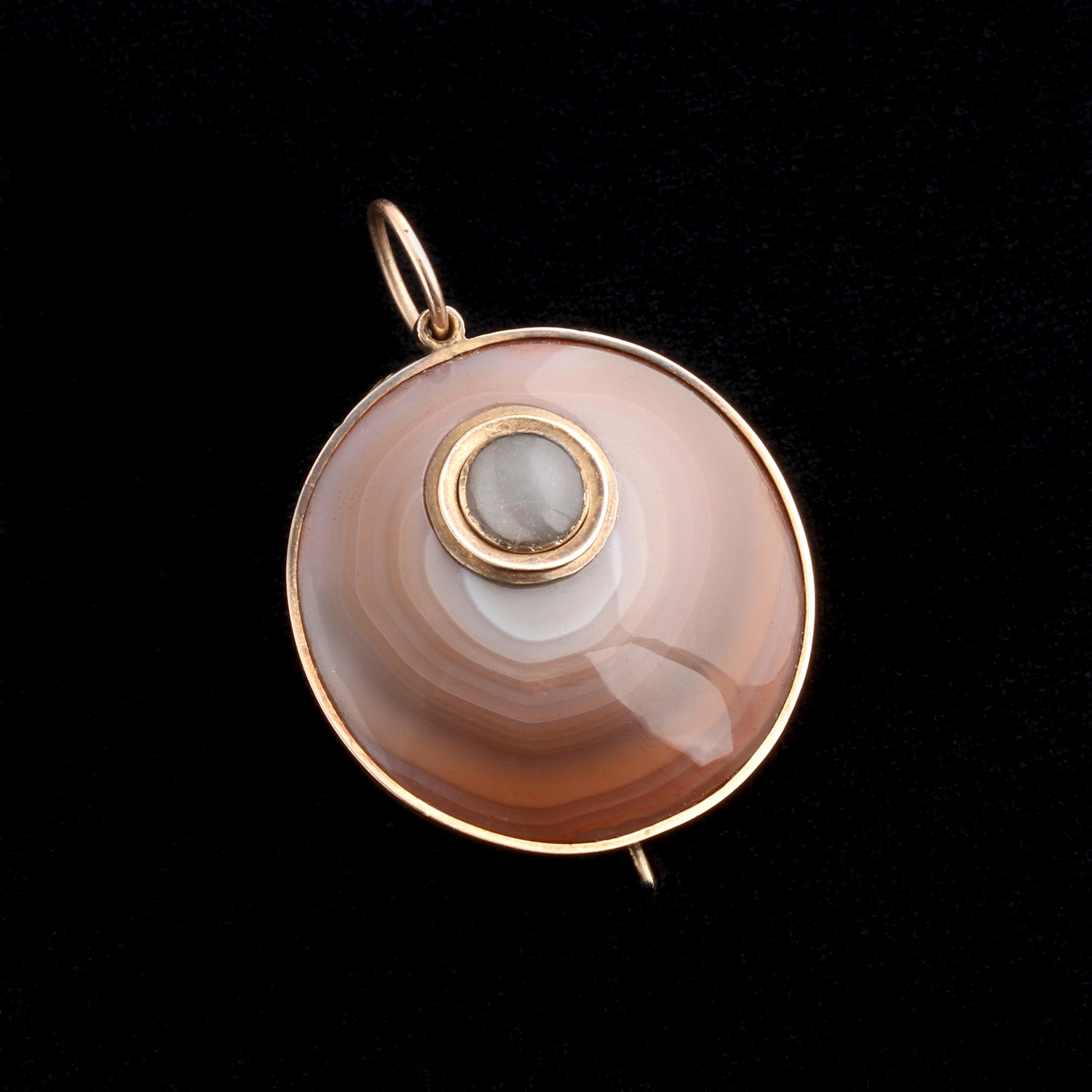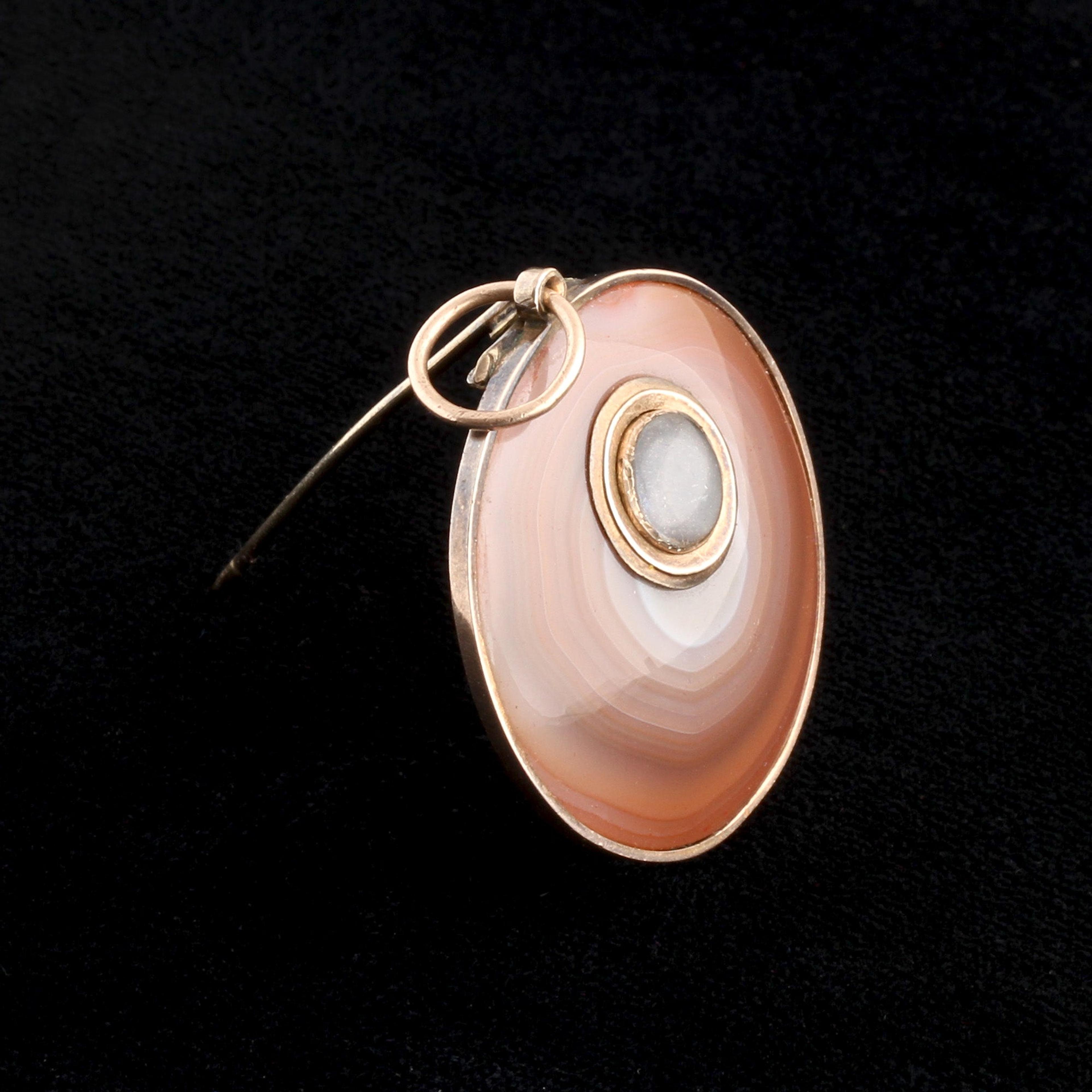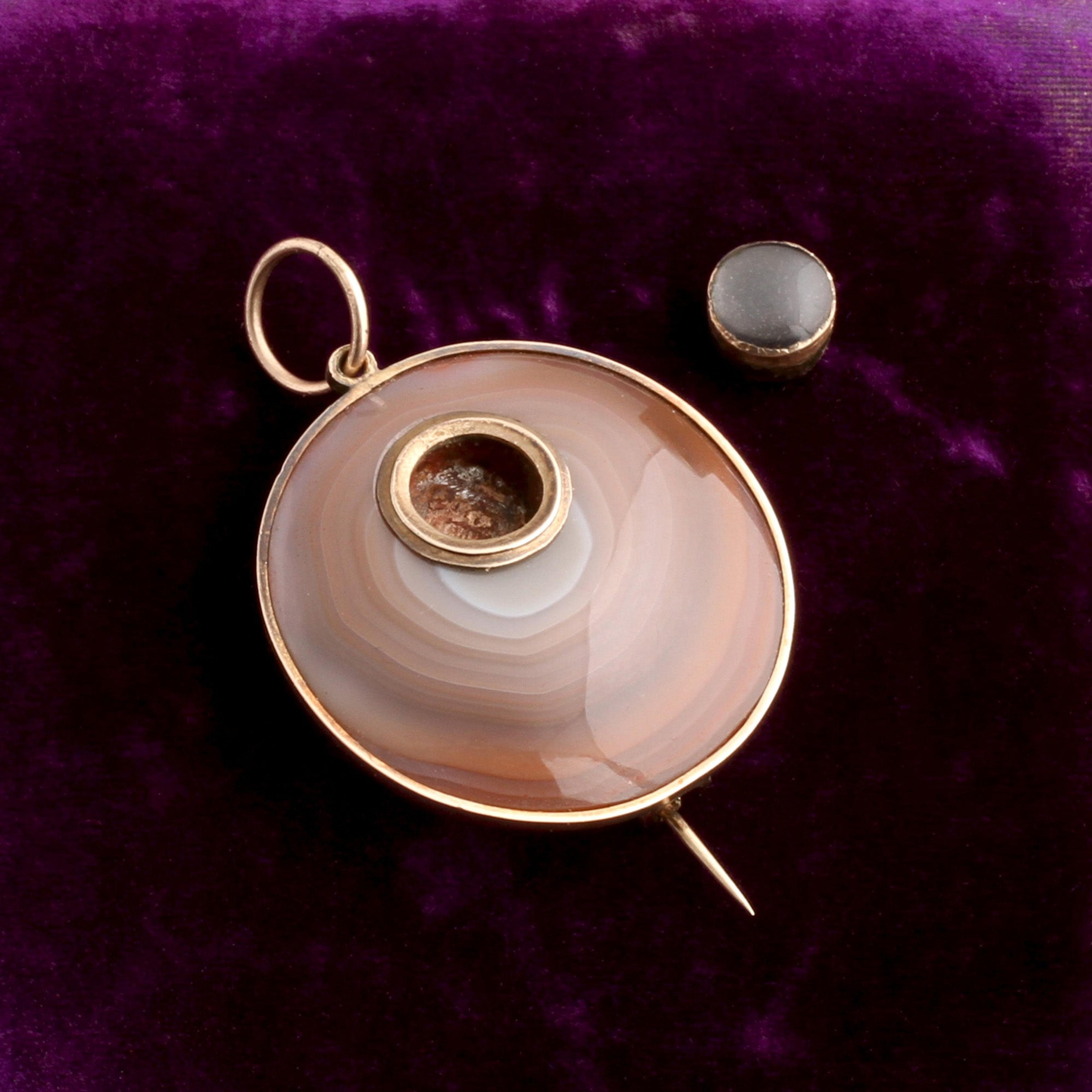 Rings of pink, orange, and white agate glow semi-translucent in the light; the beauty of uncarved natural material is held in highest regard here. A tiny locket is easily removed so you can add your own personal souvenir—it fits quite loose and does not stay put now after a repair, but can be tightened by a local jeweler once you decide what keepsake you would like to house within it. Can be worn as a brooch or a pendant.